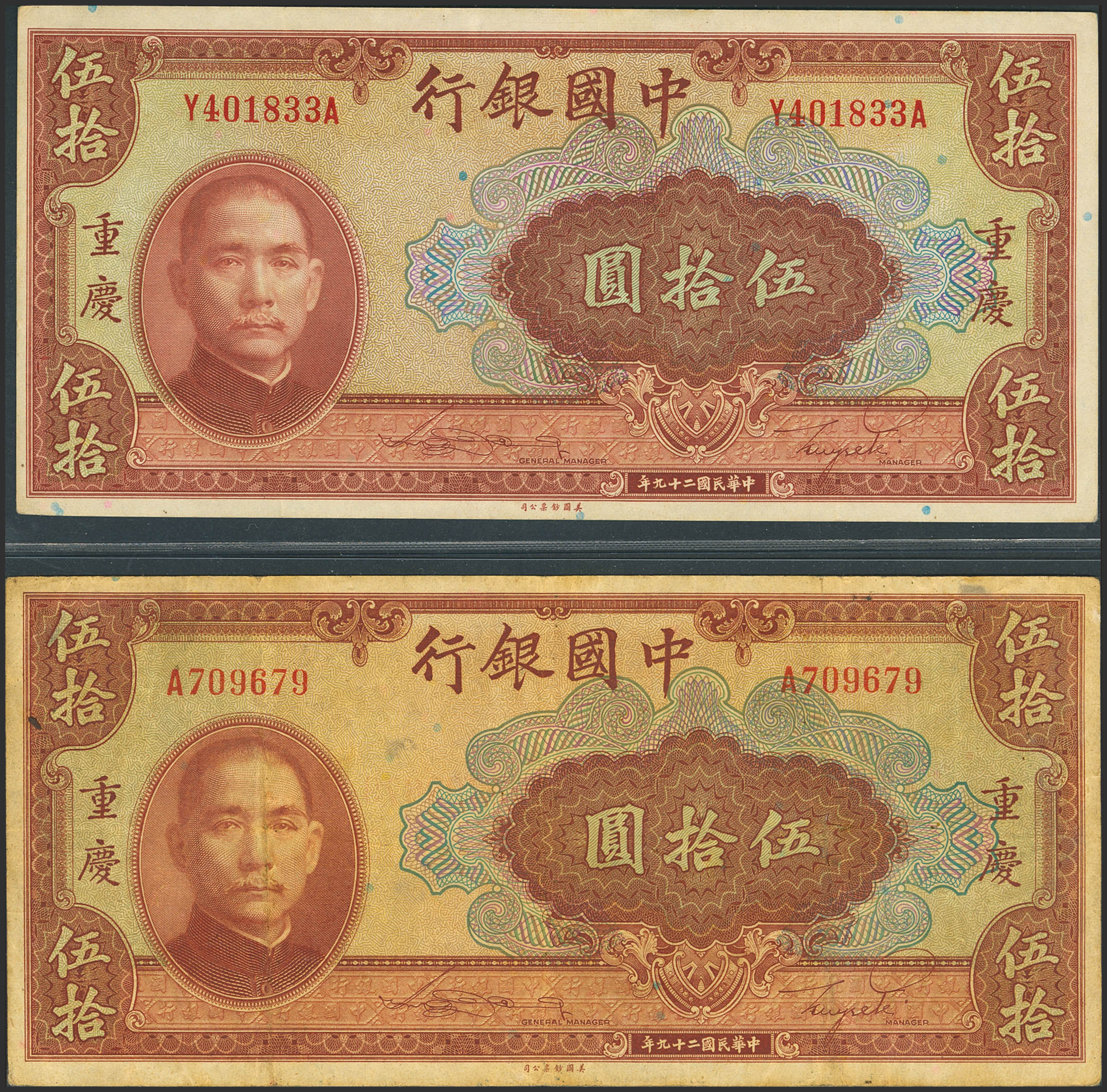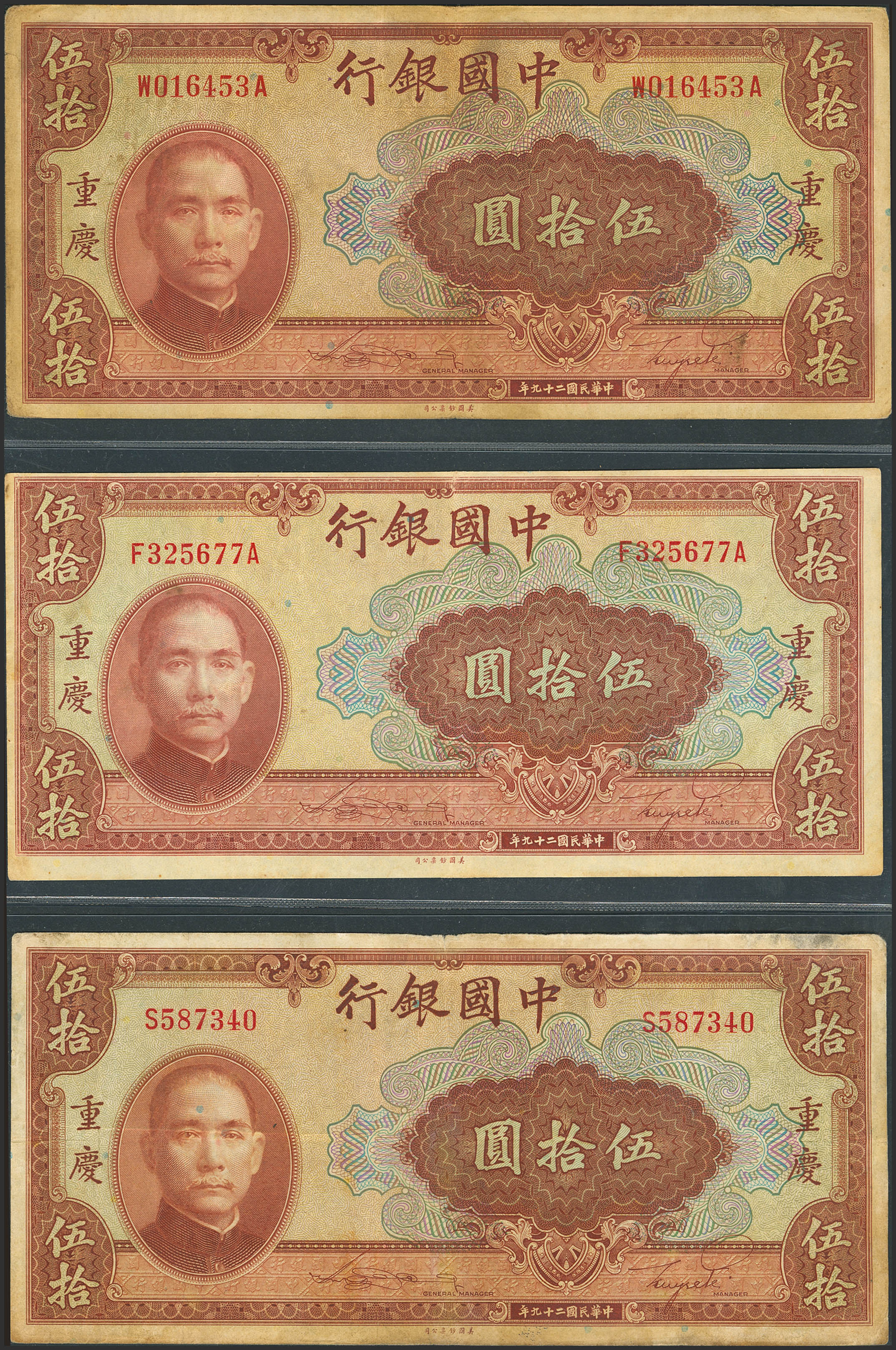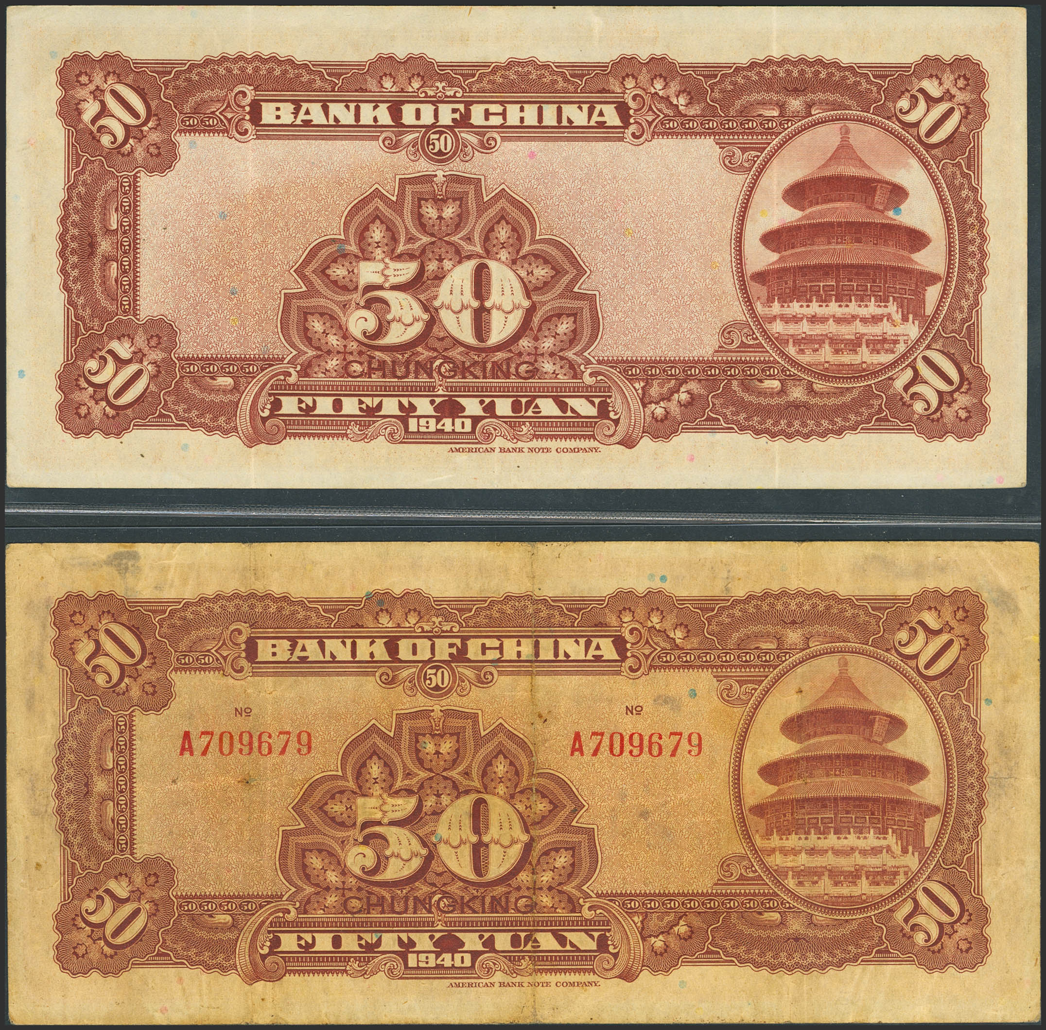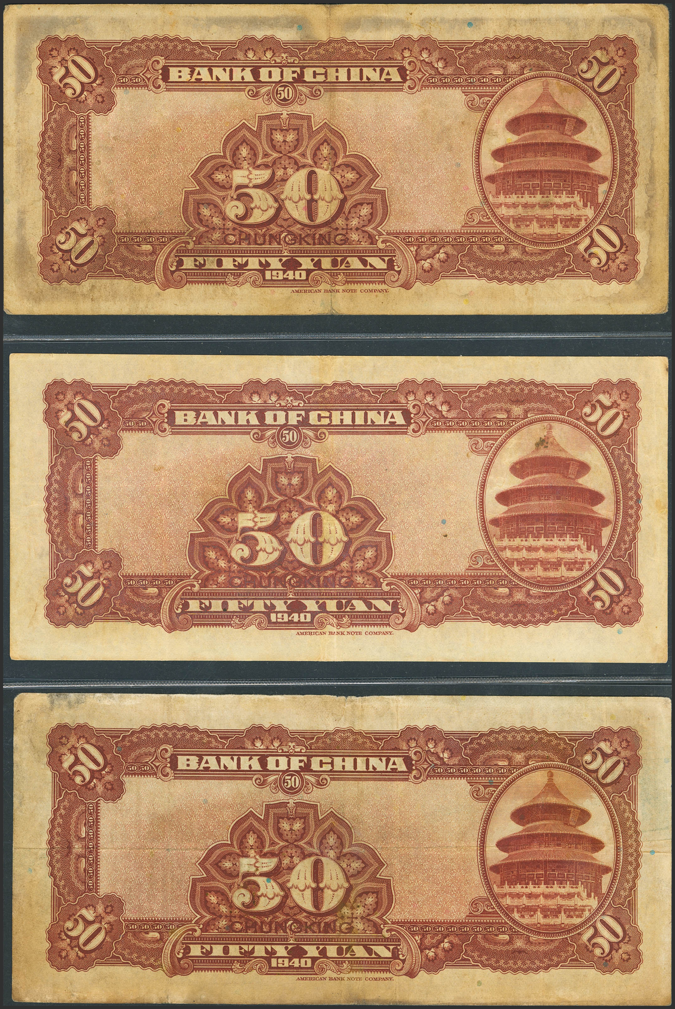 CHINA. Set of 5 notes of 50 Yuan. 1940. Bank of China. (Pick: 87c(1). 87D(4)). Very Fine (4) to Extremely Fine (1).