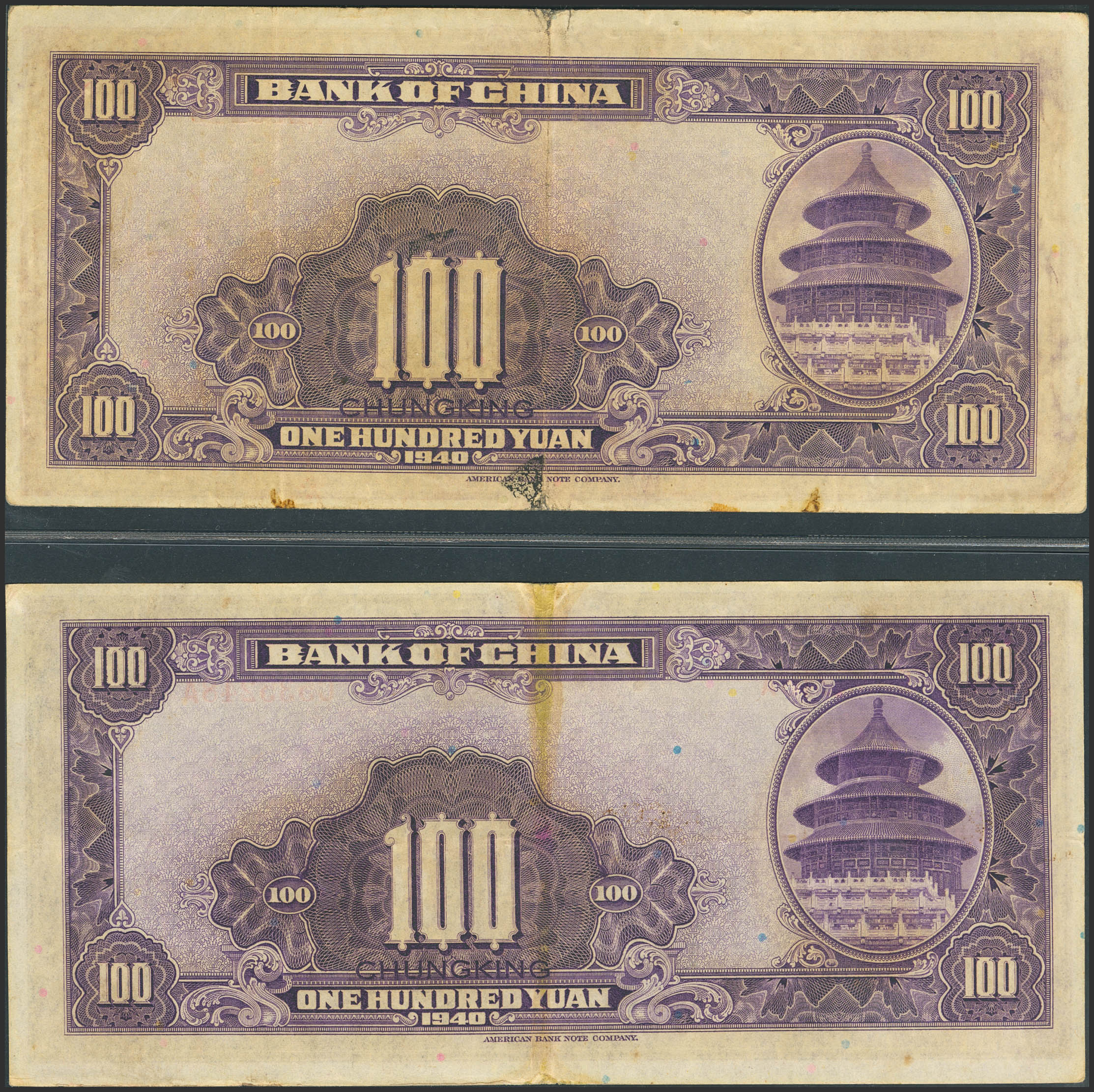 CHINA. Set of 2 notes of 100 Yuan. 1940. Bank of China. Chungking. (Pick: 88b). Extremely Fine.