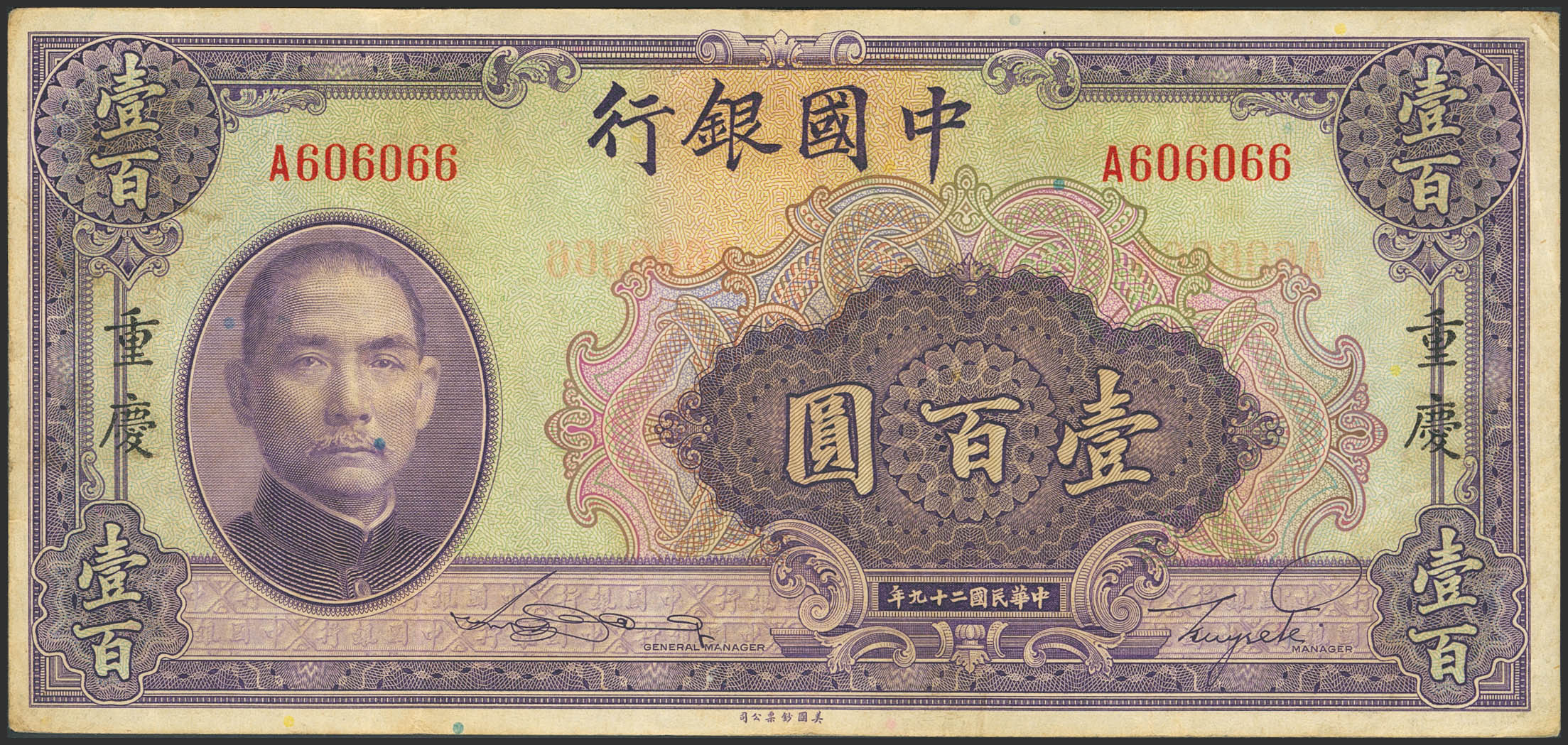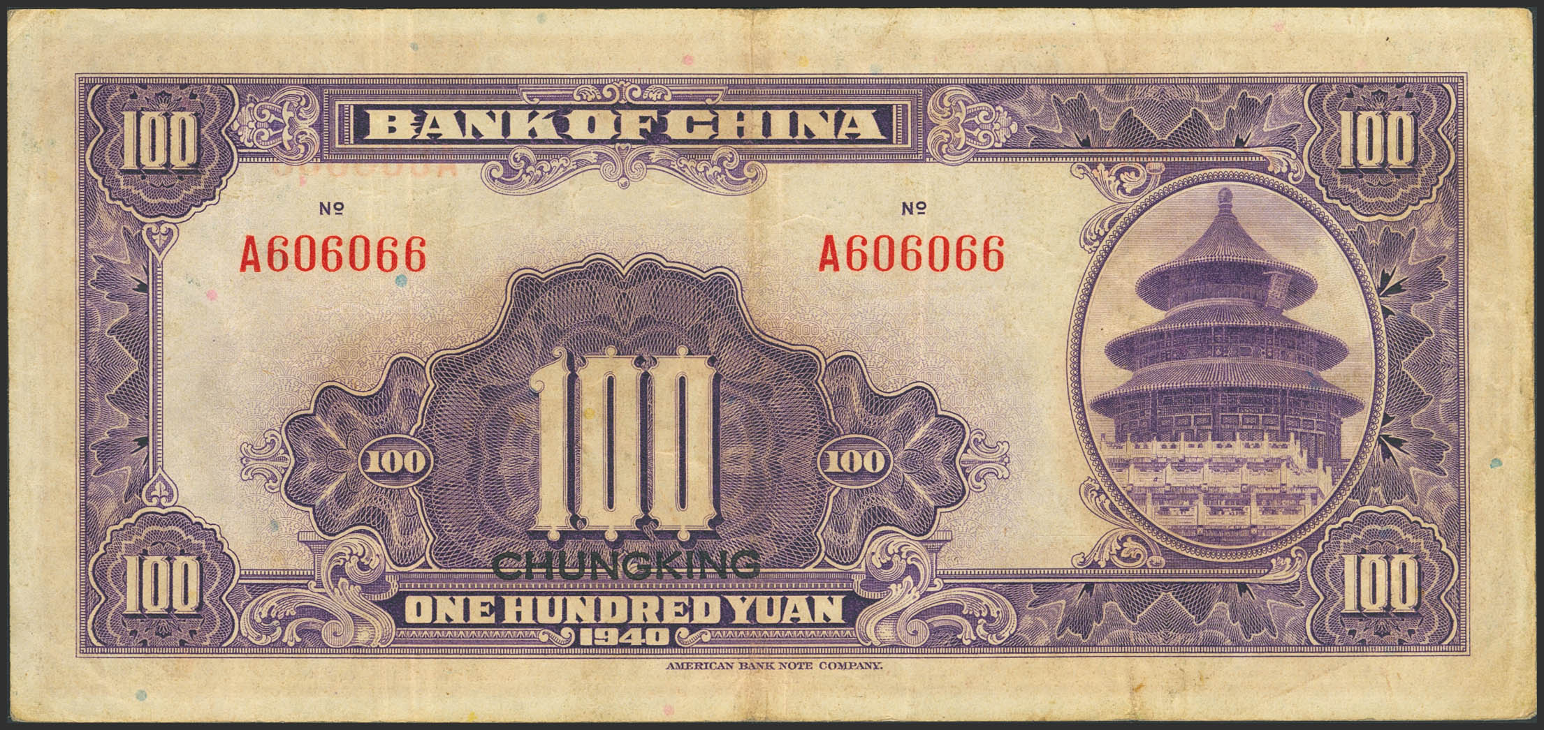 CHINA. 100 Yuan. 1940. Bank of China. Chungking. Attractive serial number. (Pick: 88c). Very Fine.