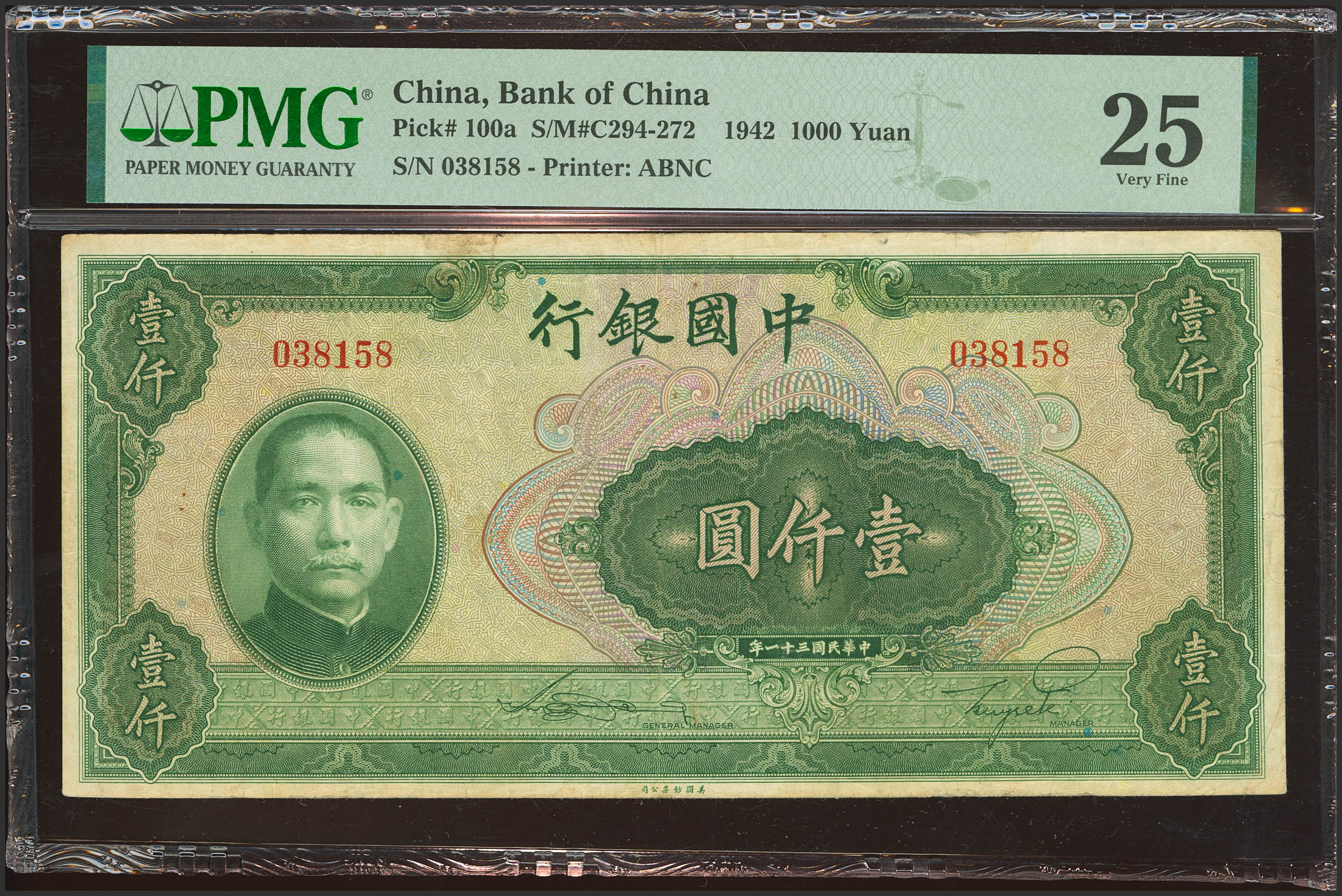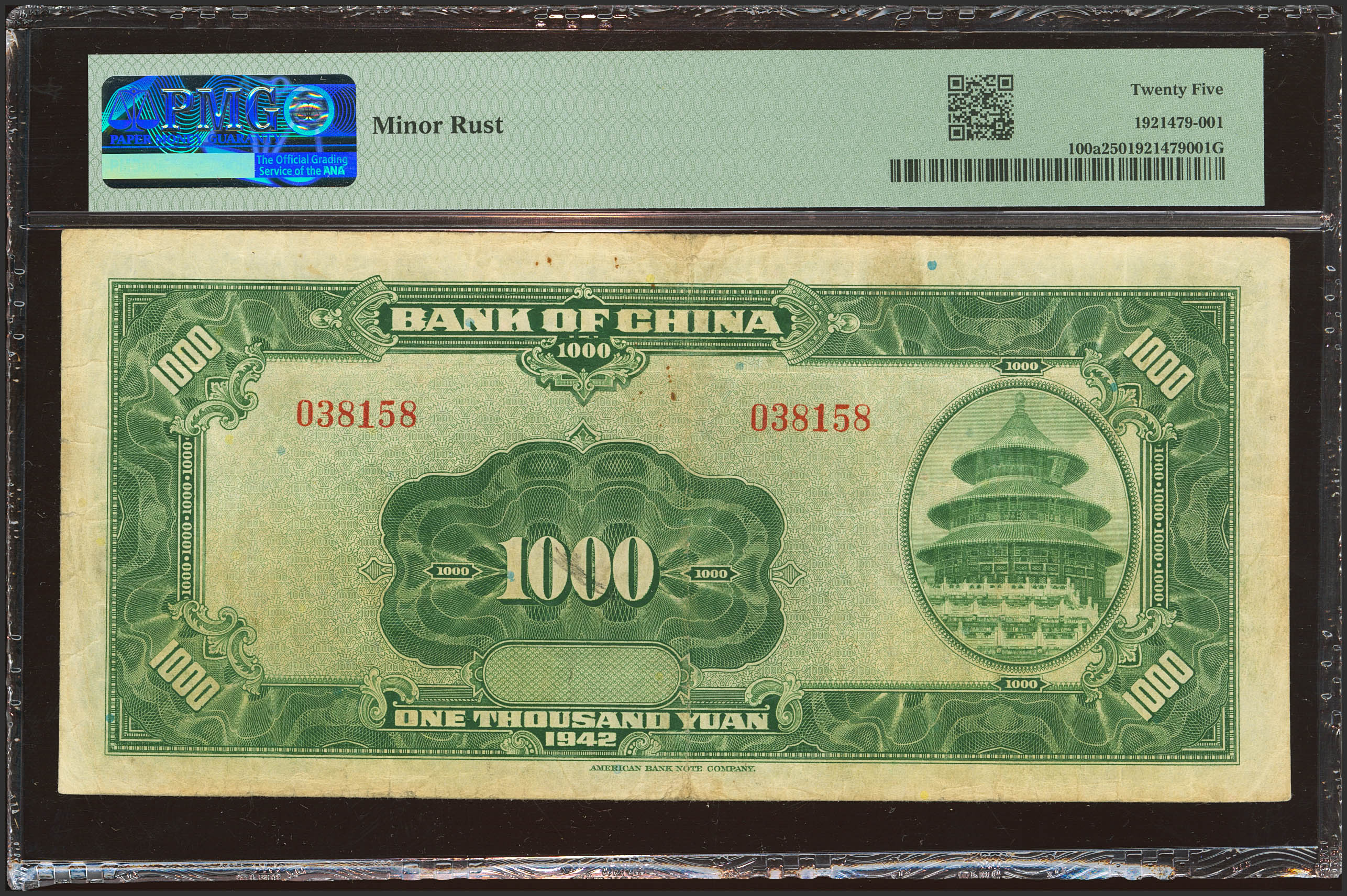 CHINA. 1000 Yuan. 1942. Bank of China. (Pick: 100a, SM: C294-272). PMG25 (minor rust).