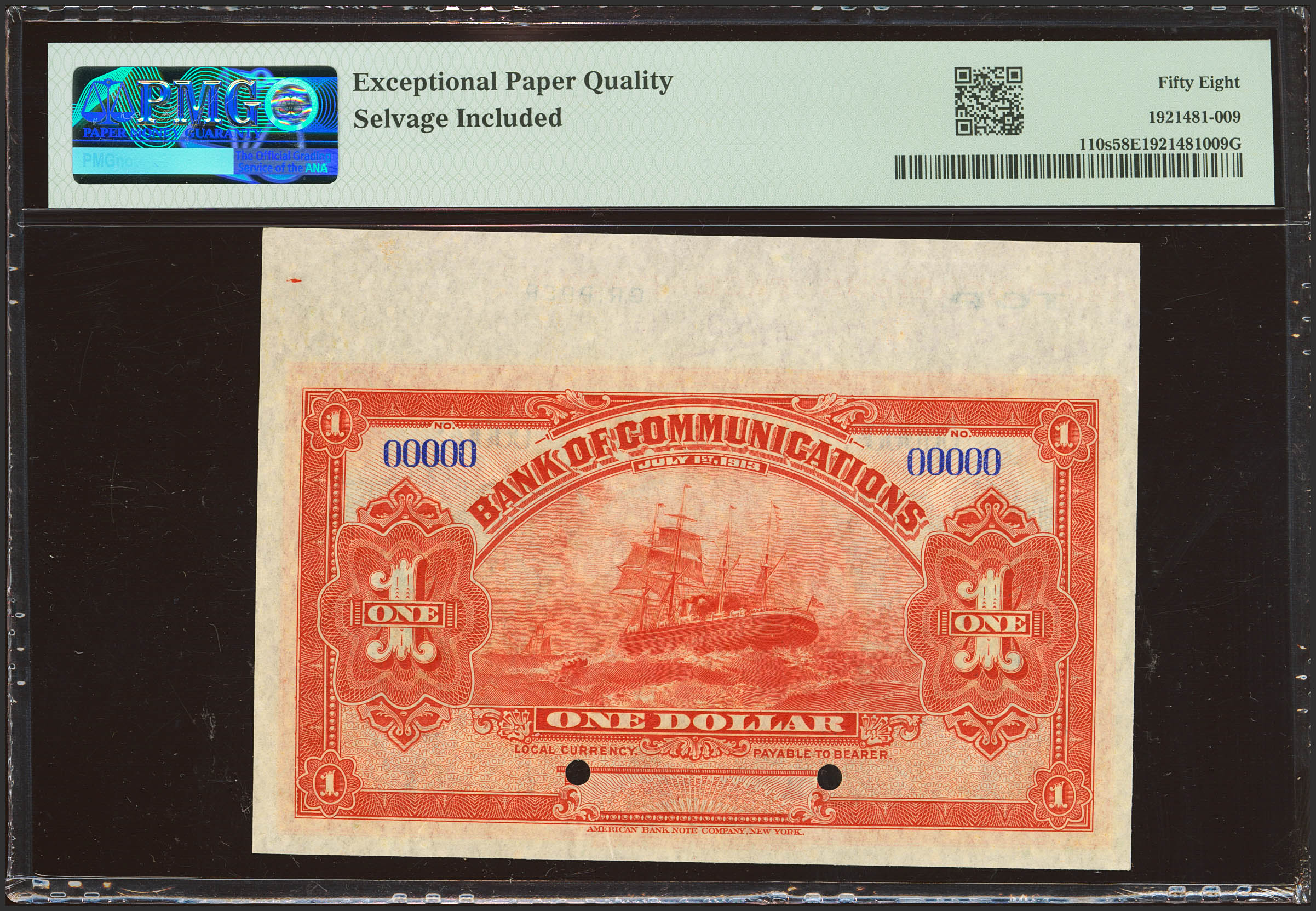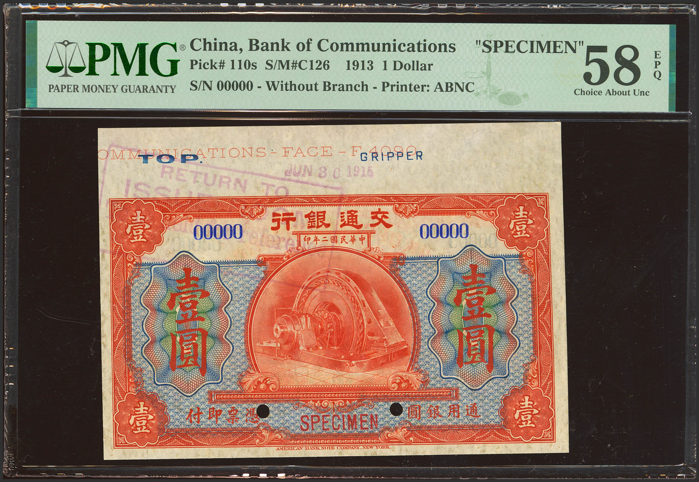 CHINA. 1 Dollar. 1 July 1913. Bank of Communications. Specimen. (Pick: 110s, SM: C126). PMG58EPQ (selvage included).