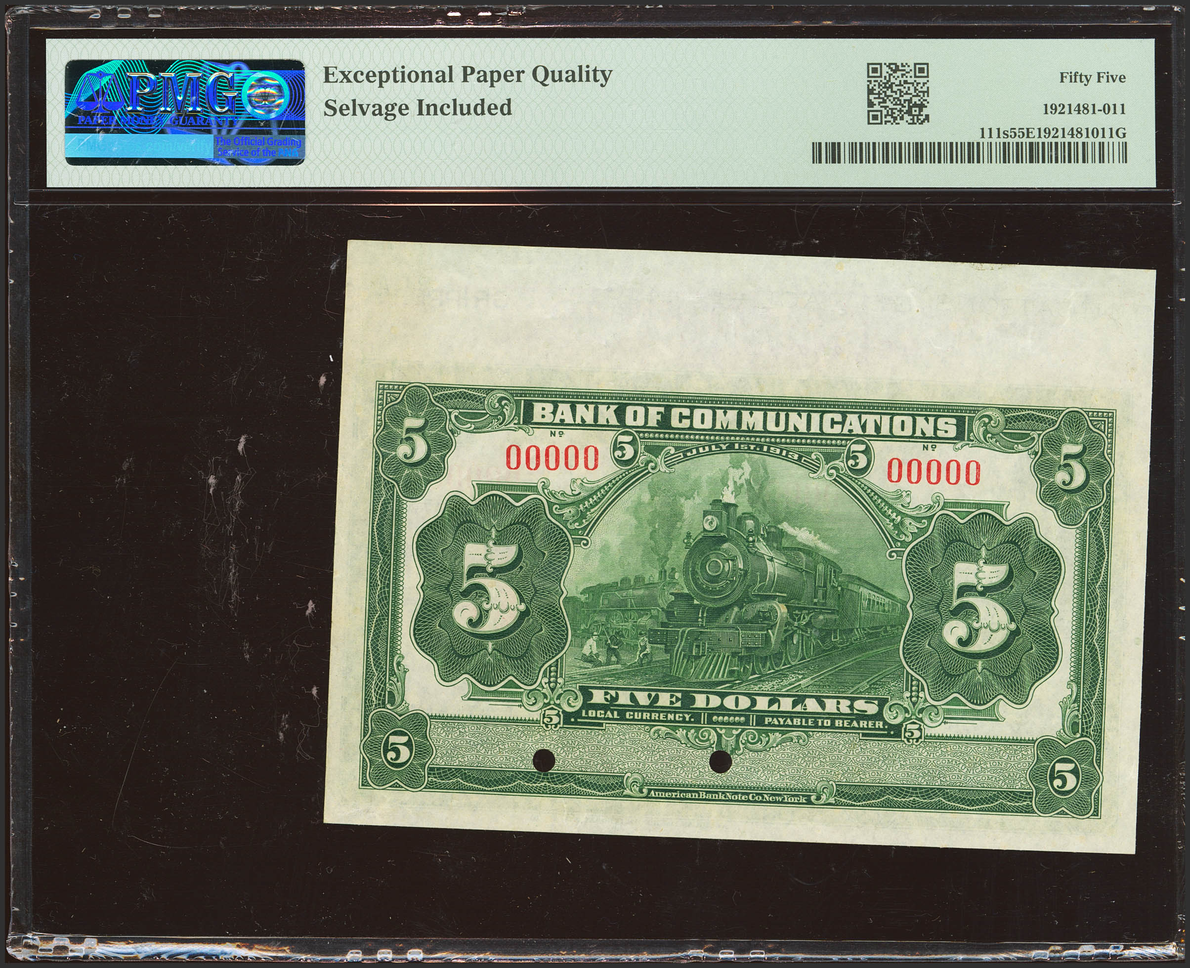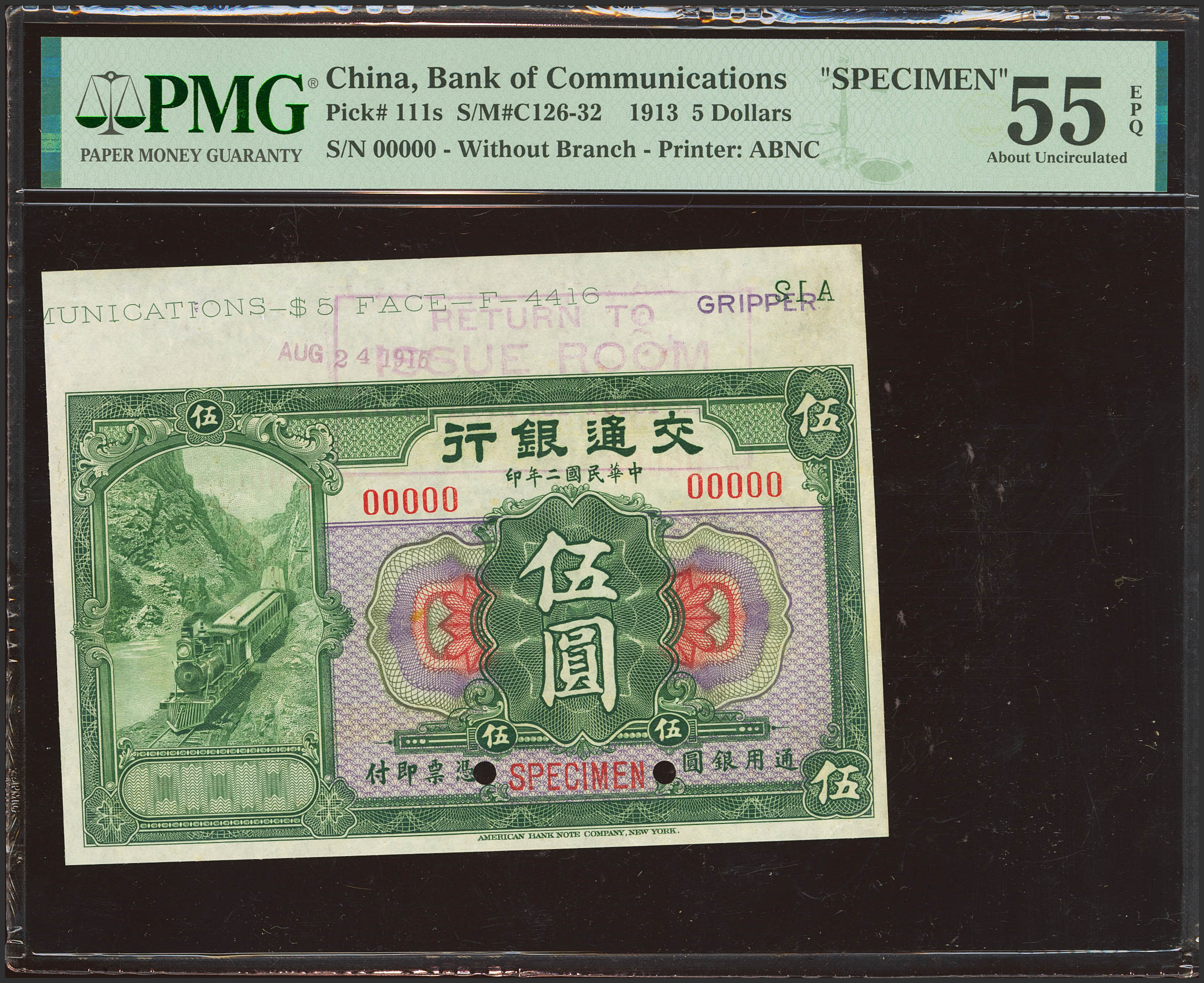 CHINA. 5 Dollars. 1 July 1913. Bank of Communications. Specimen. (Pick: 111s, SM: C126-32). PMG55EPQ.