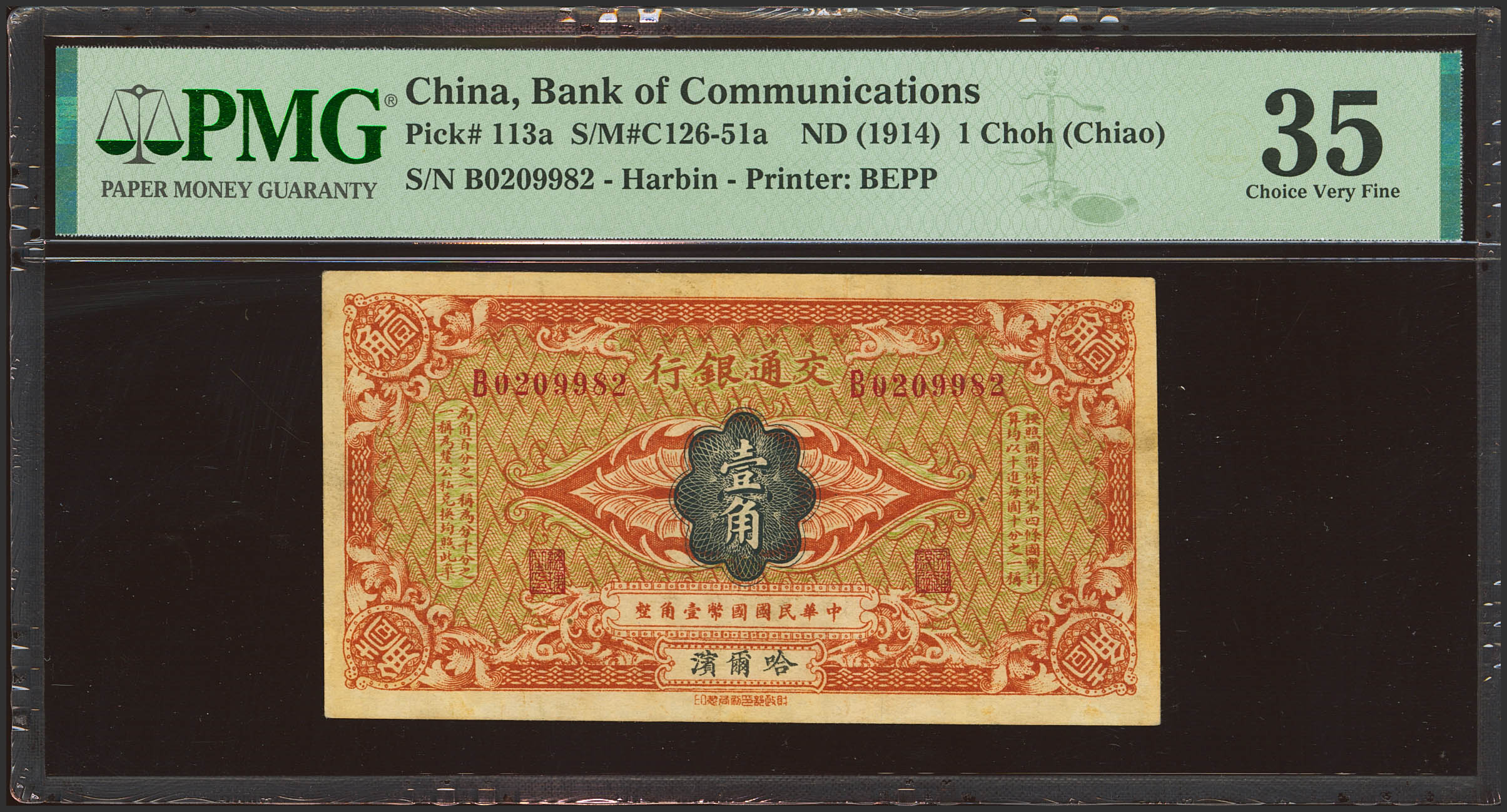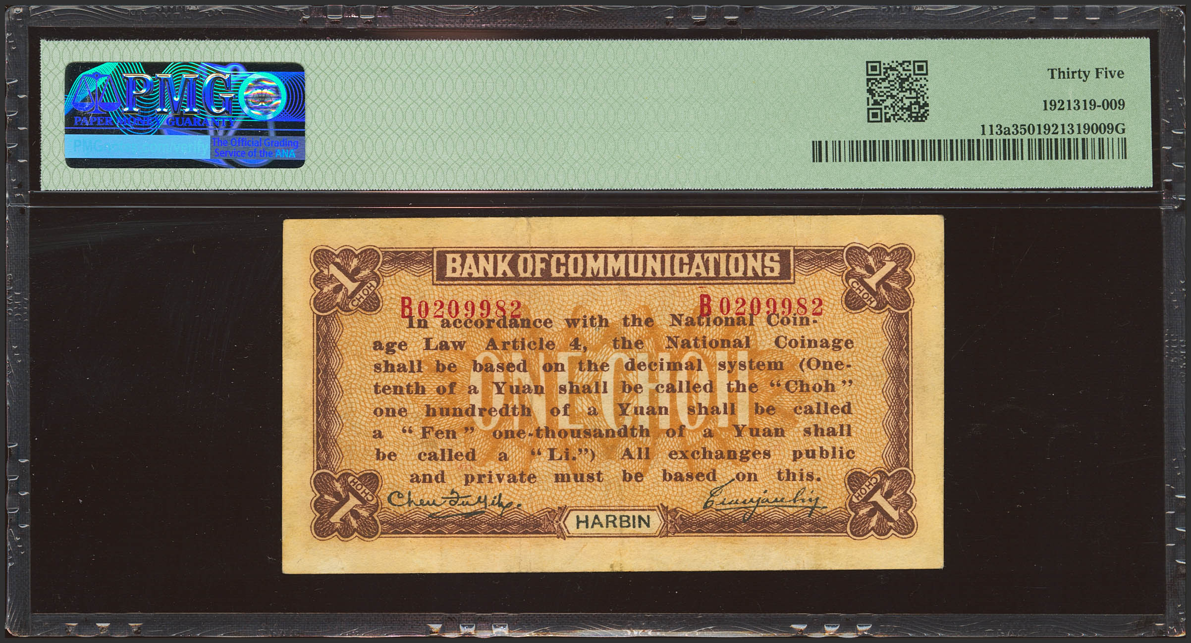 CHINA. 1 Choh. (1914ca). Bank of Communication. Harbin. (Pick: 113a, SM: C126-51a). PMG35.