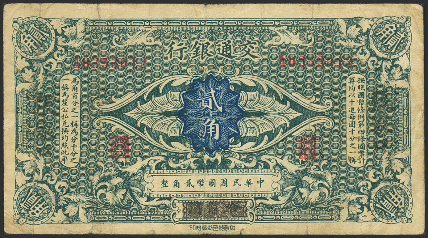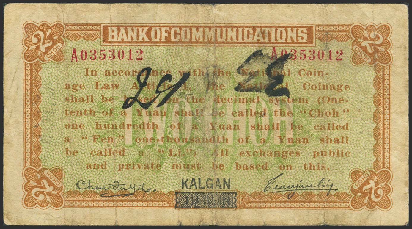 CHINA. 2 Choh. (1914ca). Bank of Communication. Kalgan. (Pick: 114b). Fine.