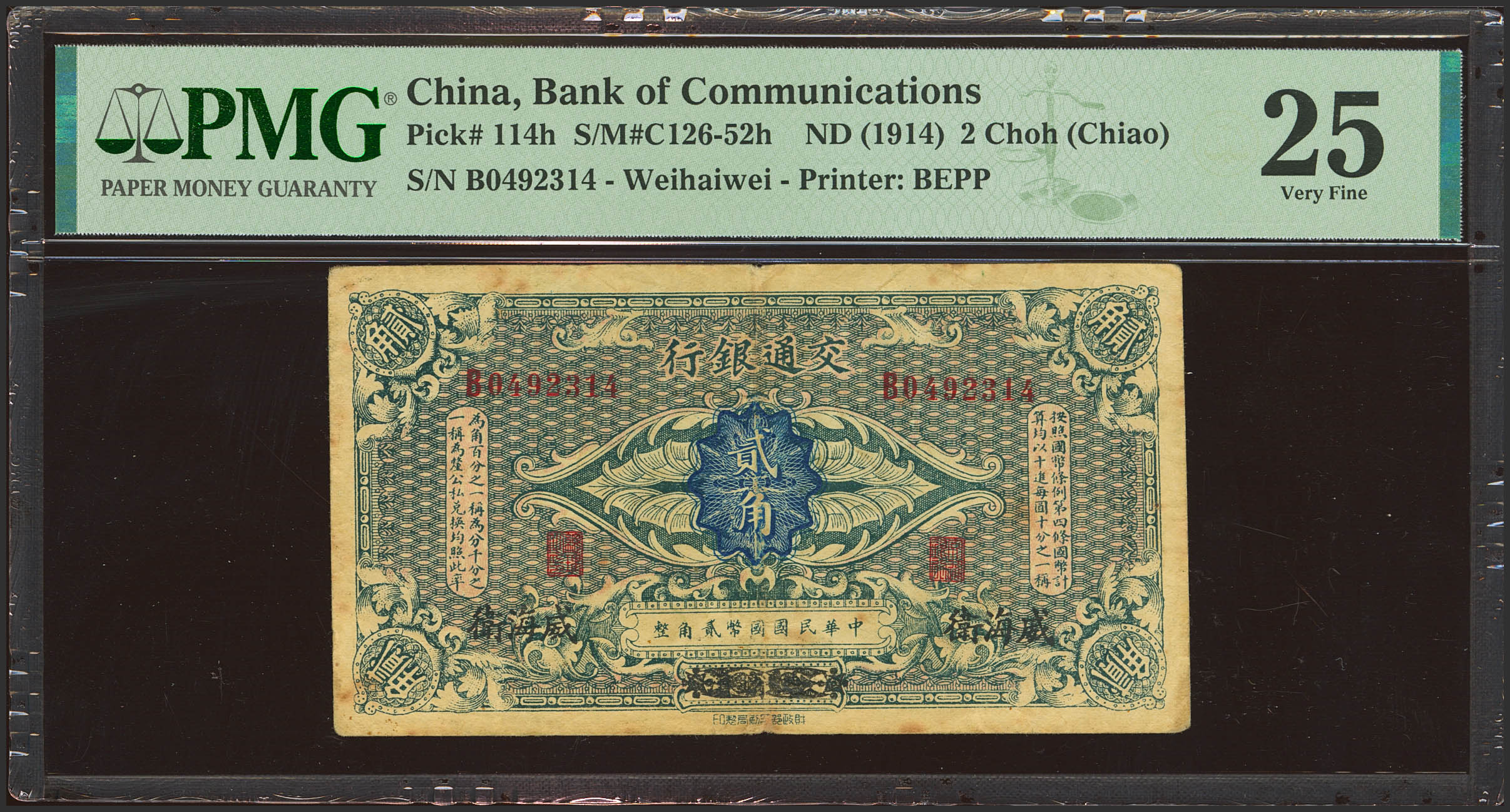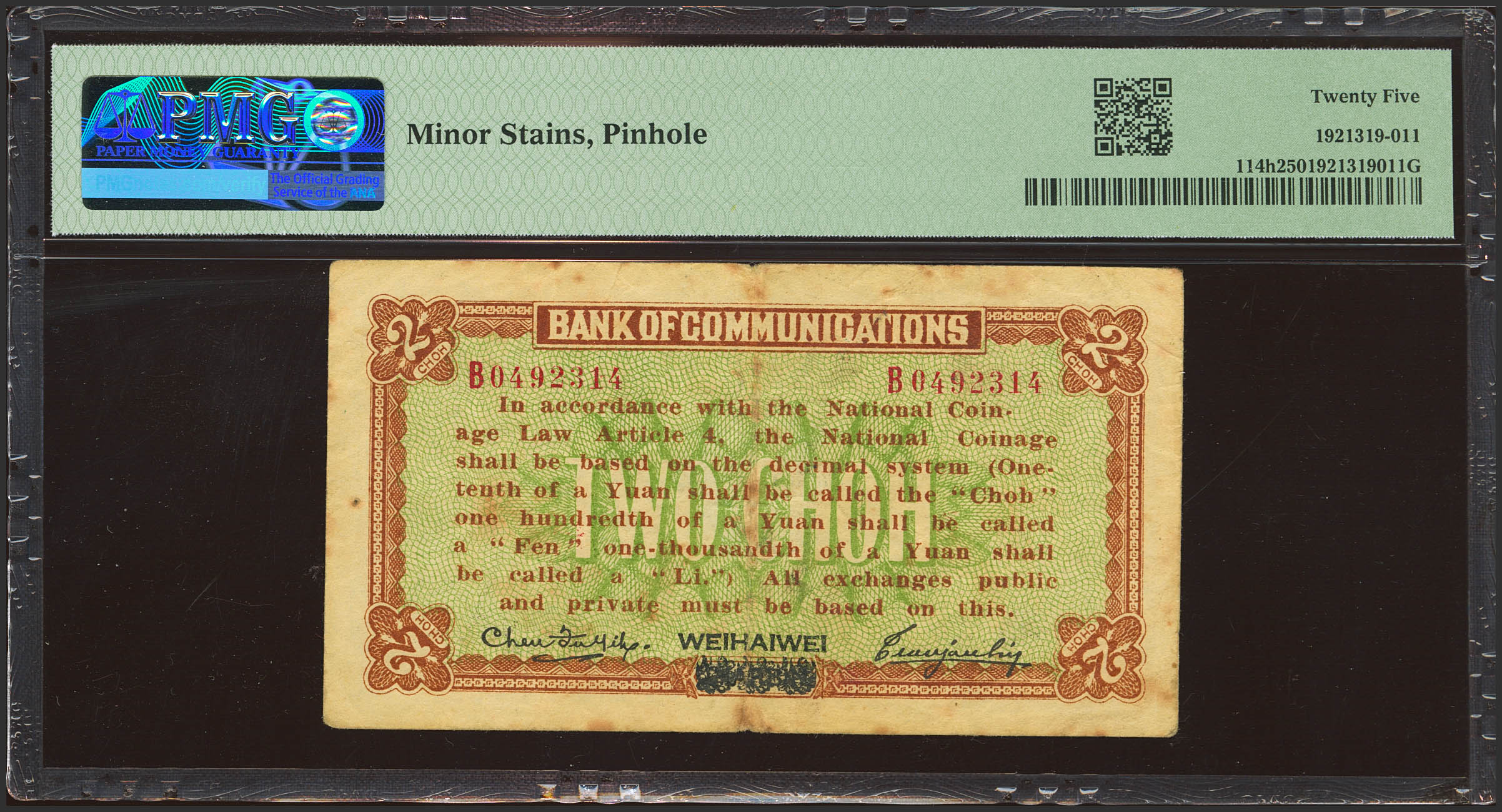 CHINA. 2 Choh. (1914ca). Bank of Communication. Weihaiwei. (Pick: 114h, SM: C126-52h). PMG25 (minor stain, pinhole).