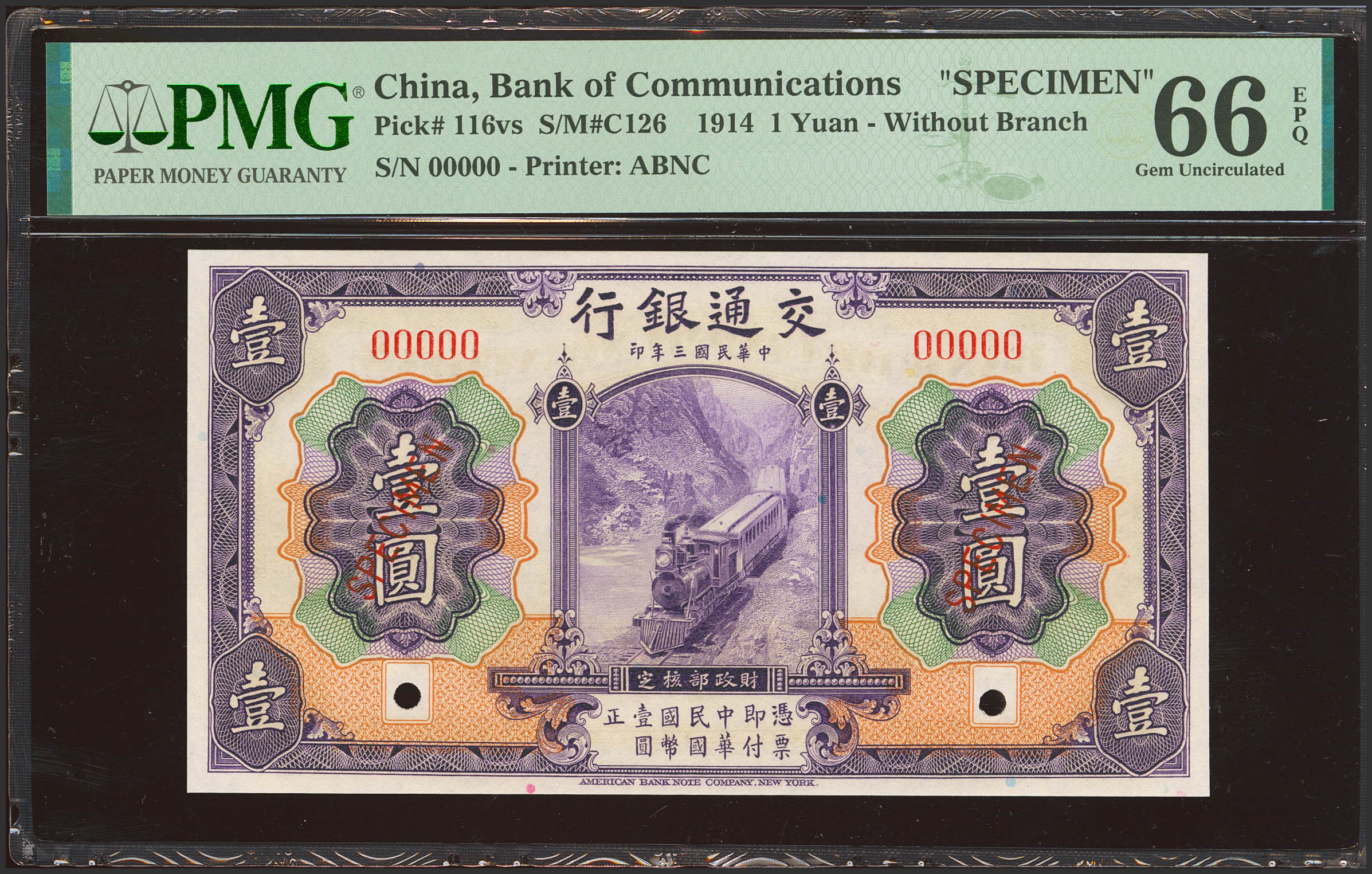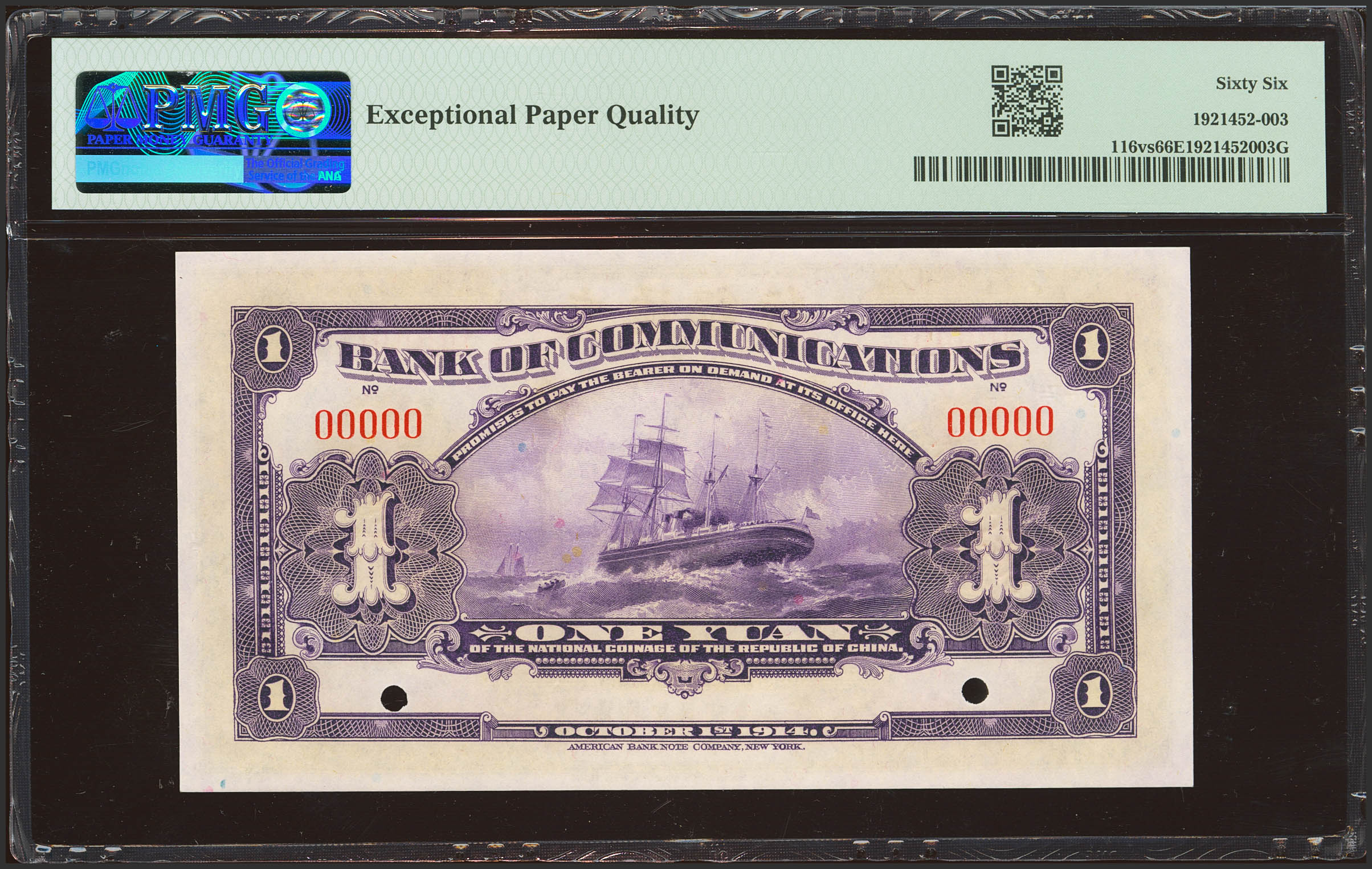 English CHINA. 1 Yuan. 1 October 1914. Bank of Communications. Specimen. (Pick: 116s, SM: C126). PMG66EPQ.