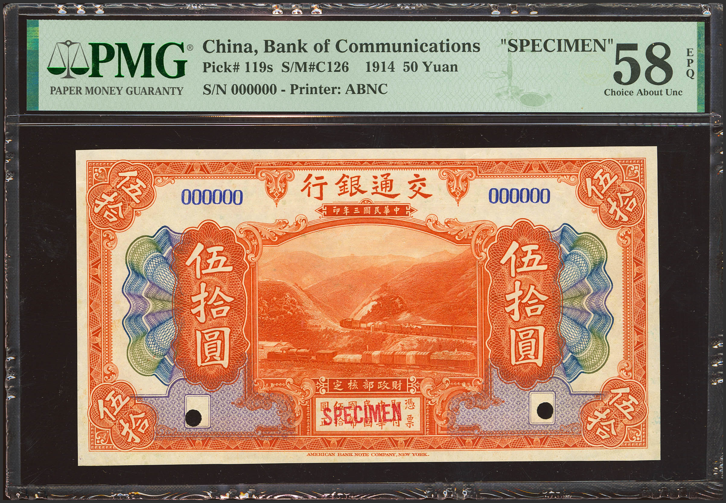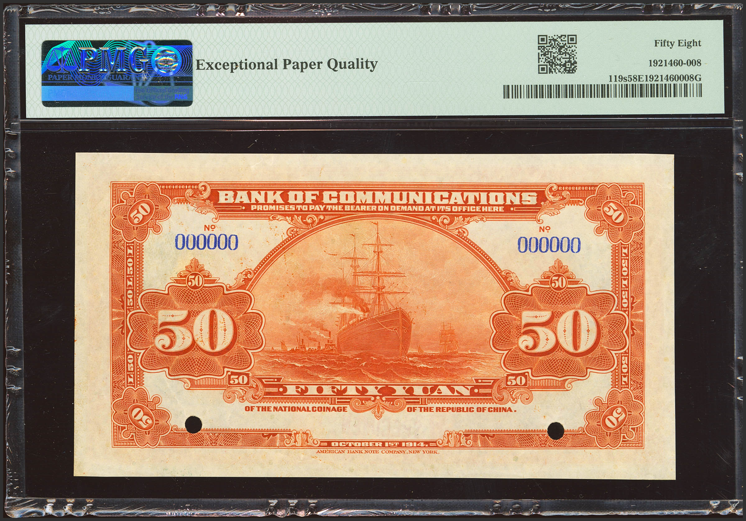 CHINA. 50 Yuan. 1 October 1914. Bank of Communication. Specimen. (Pick: 119s, SM: C126). PMG58EPQ.