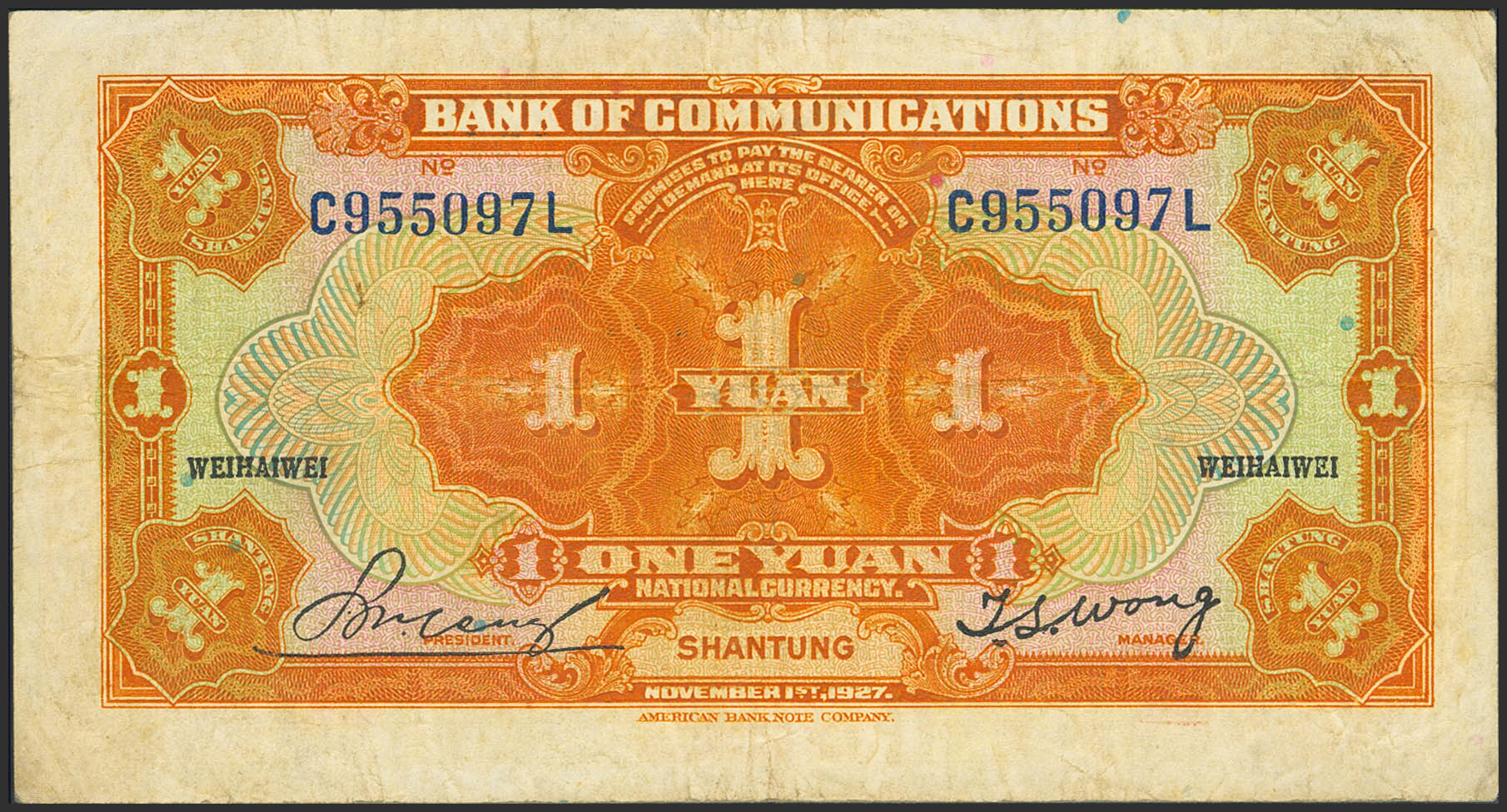 CHINA. 1 Yuan. 1 November 1927. Bank of Communications. Weihaiwei/Shantung. (Pick: 145Bg). More than Fine.