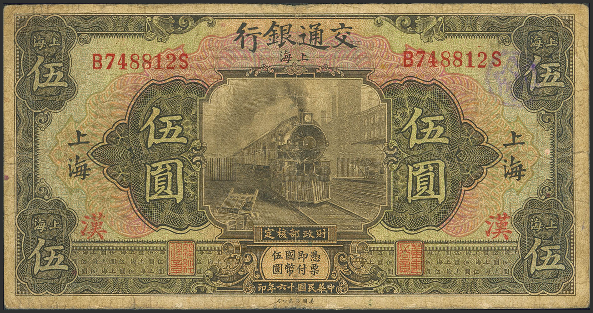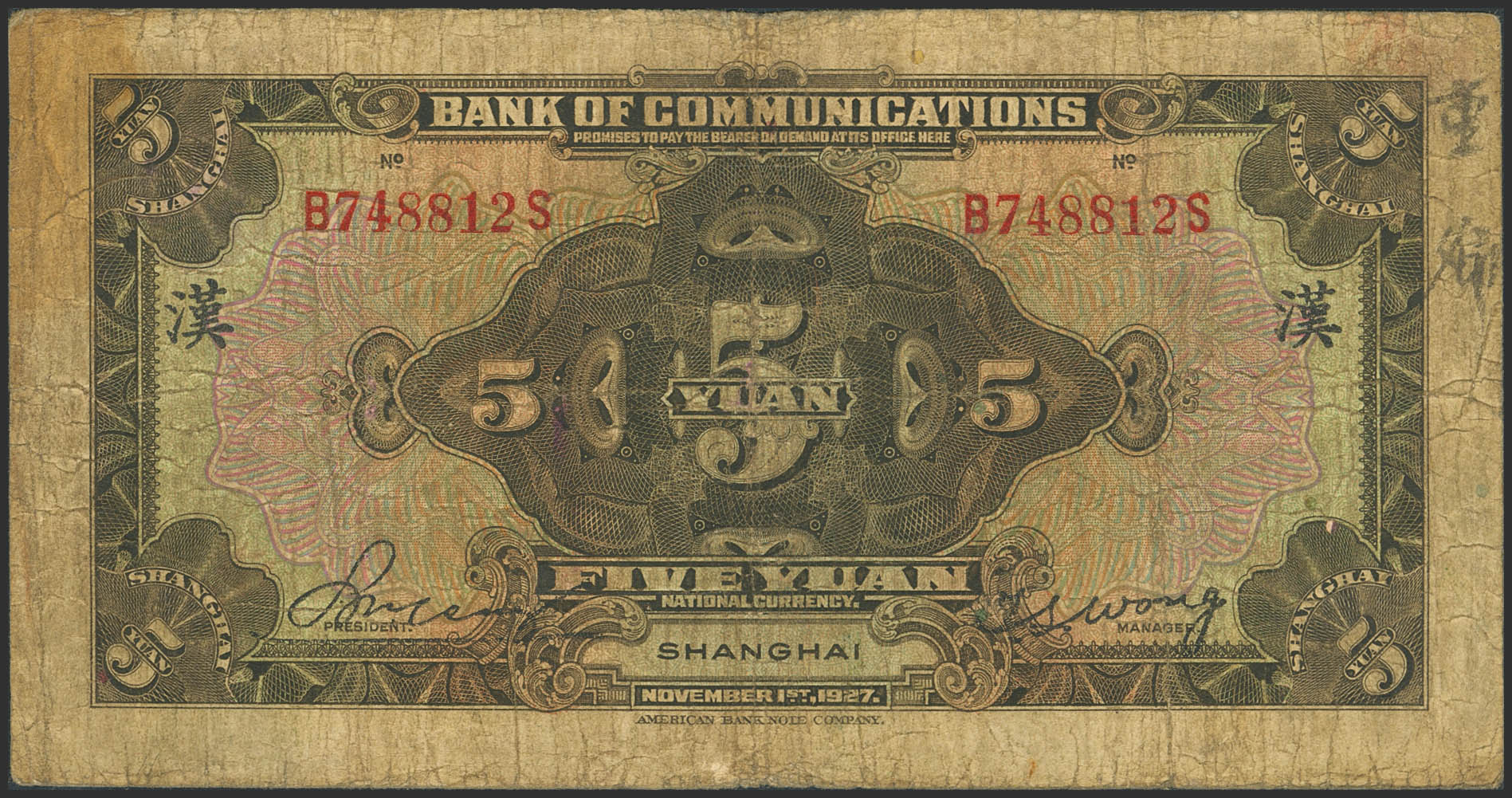 CHINA. 5 Yuan. 1 November 1927. Bank of Communication. Shanghai. (Pick: 146B). Fine.