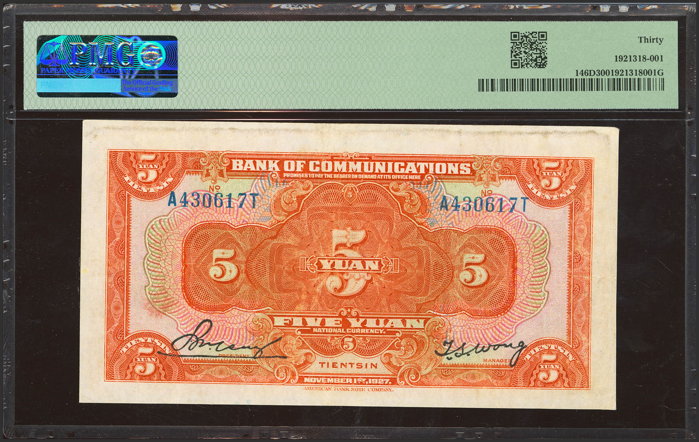 CHINA. 5 Yuan. 1 November 1927. Bank of Communication. Tientsin. (Pick: 146D, SM: C126-214). PMG30.