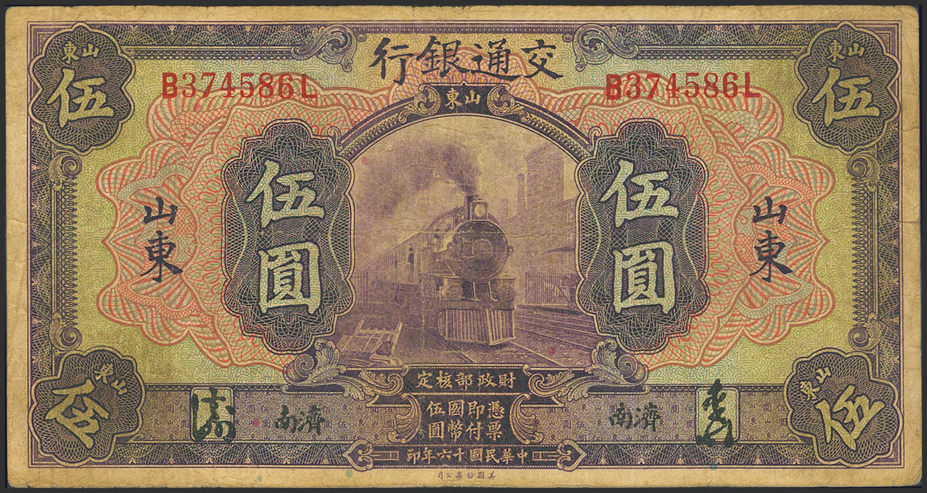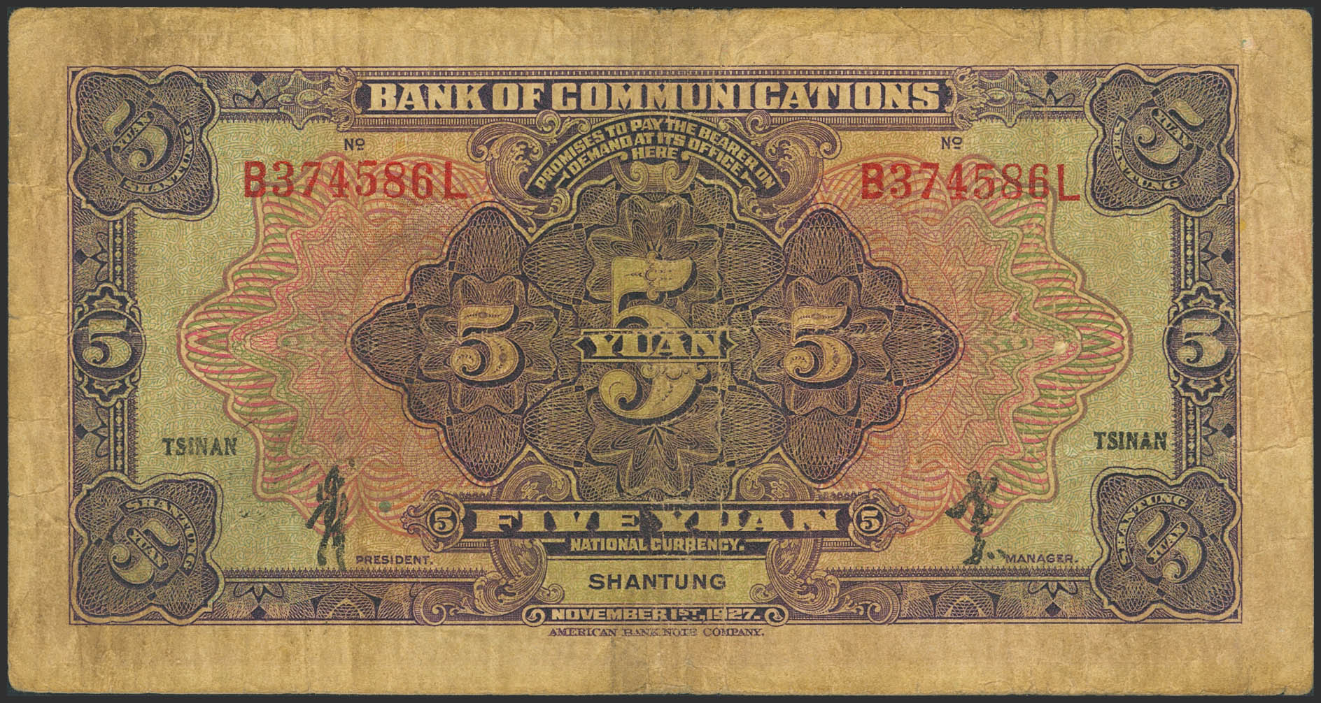 CHINA. 5 Yuan. 1 November 1927. Bank of Communication. Tsinan/Shantung. (Pick: 146Cd). Fine.