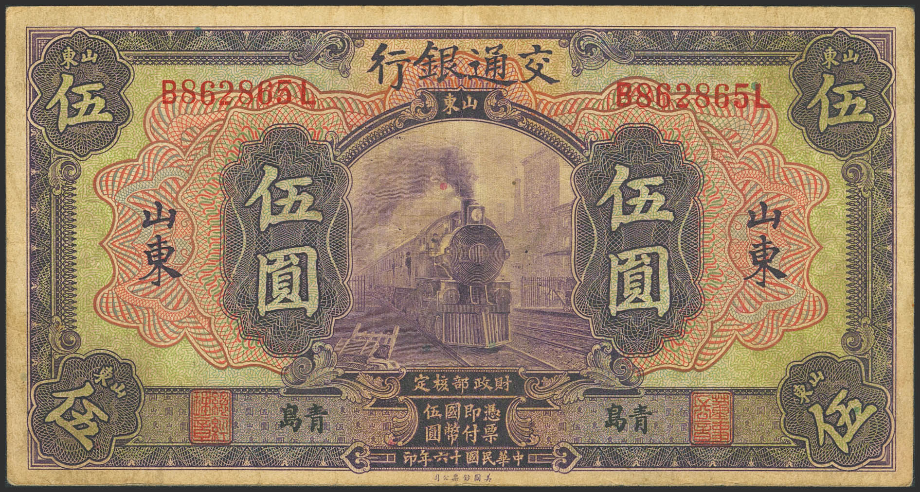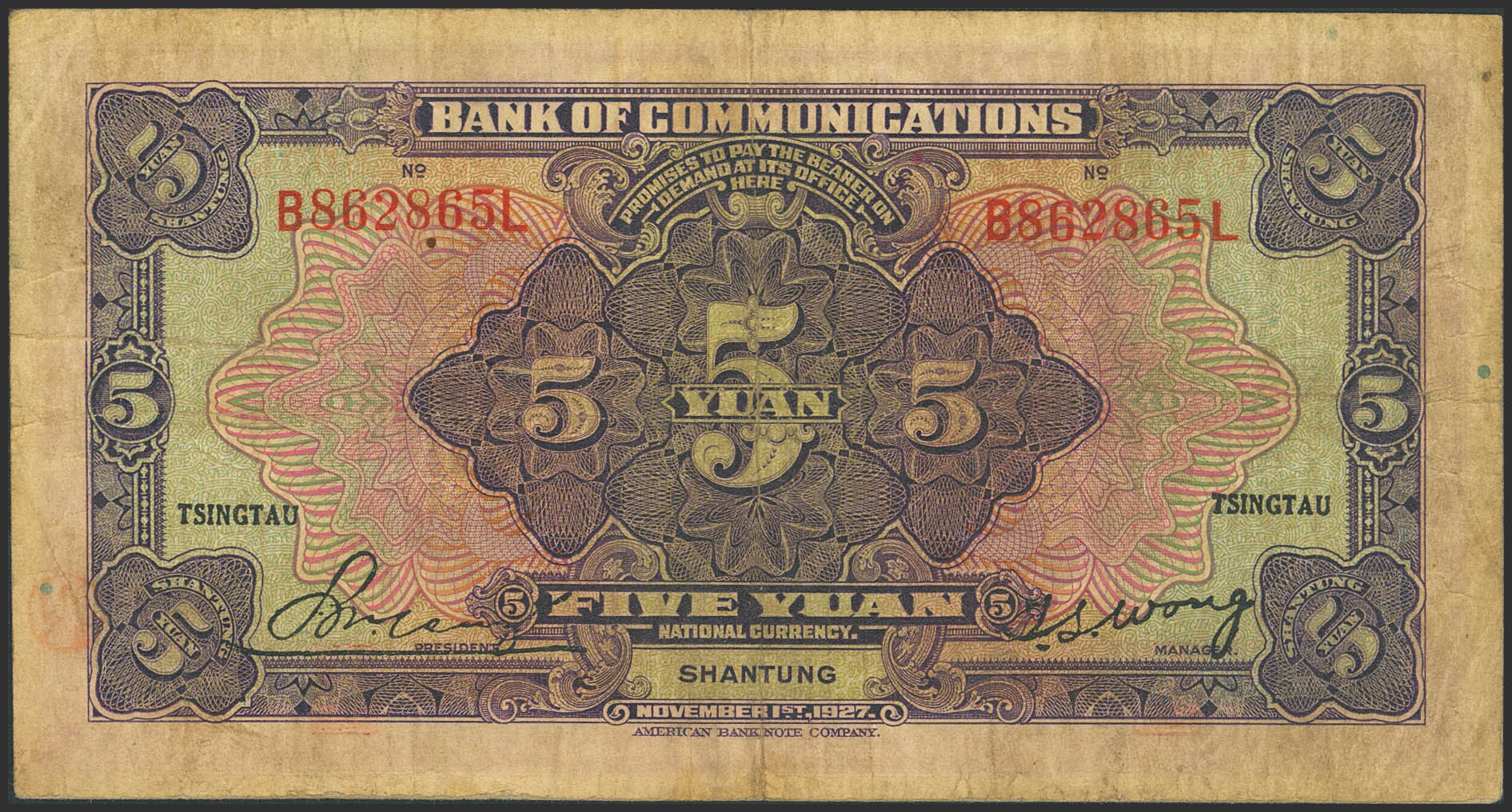 CHINA. 5 Yuan. 1 November 1927. Bank of Communication. Tsingtau/Shantung. (Pick: 146Ce). More than Fine.
