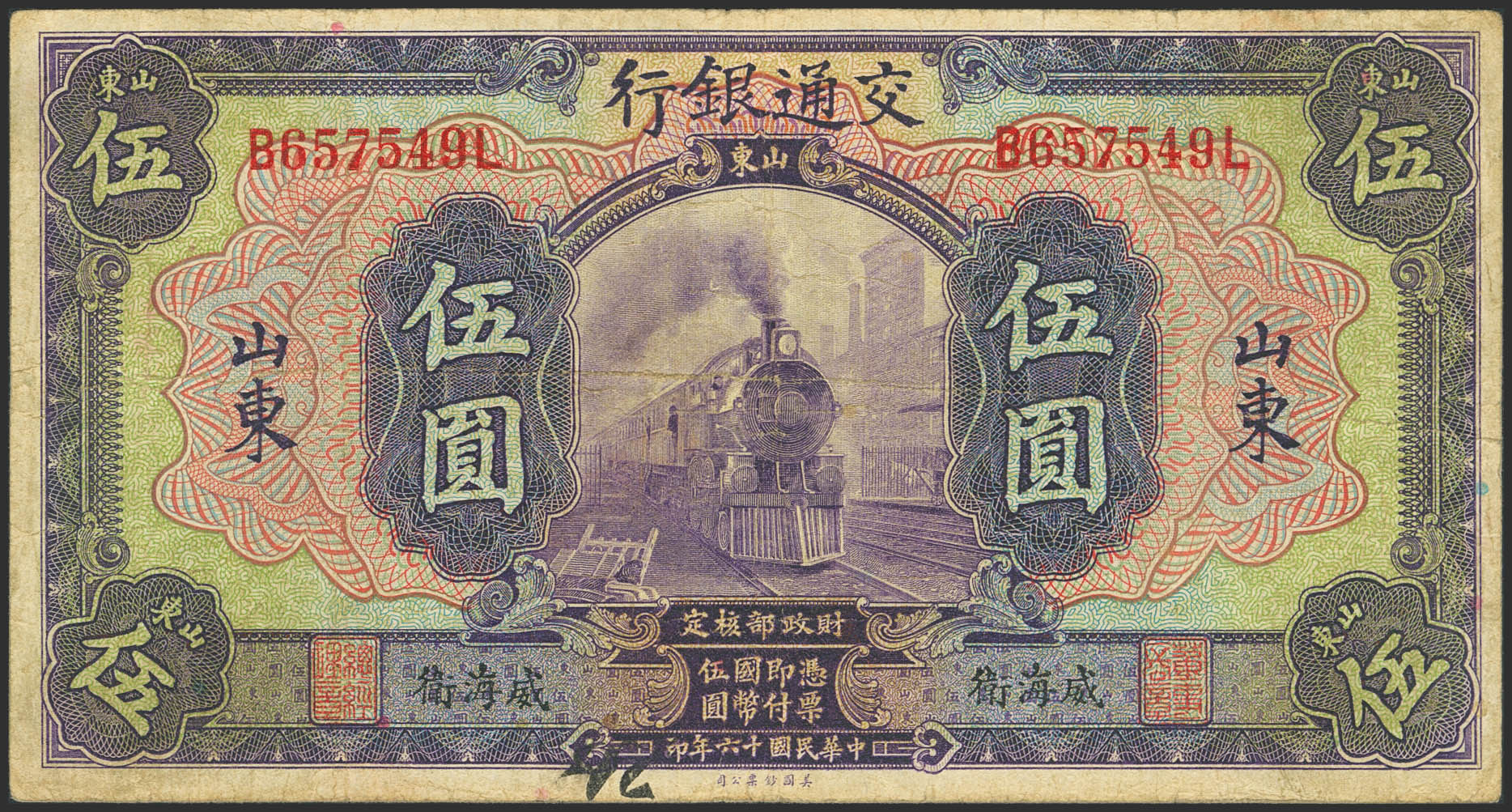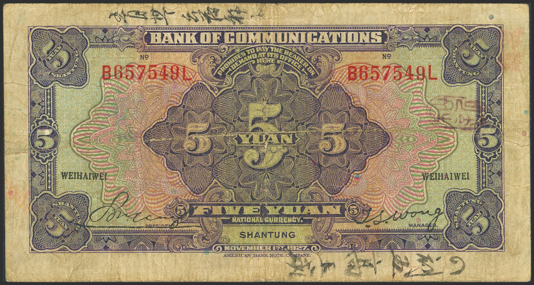CHINA. 5 Yuan. 1 November 1927. Bank of Communication. Weihaiwei/Shantung. (Pick: 146Cf). More than Fine.
