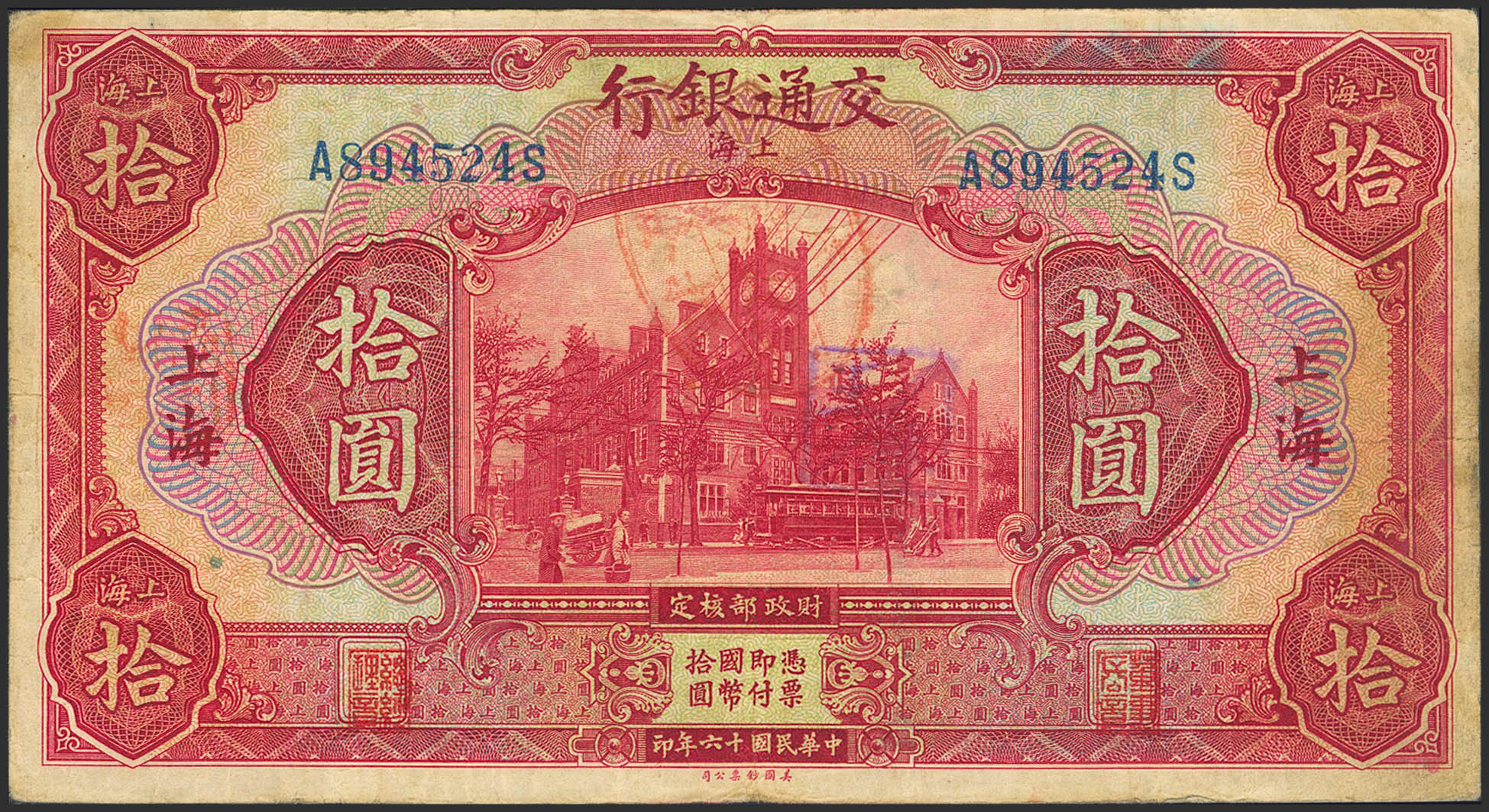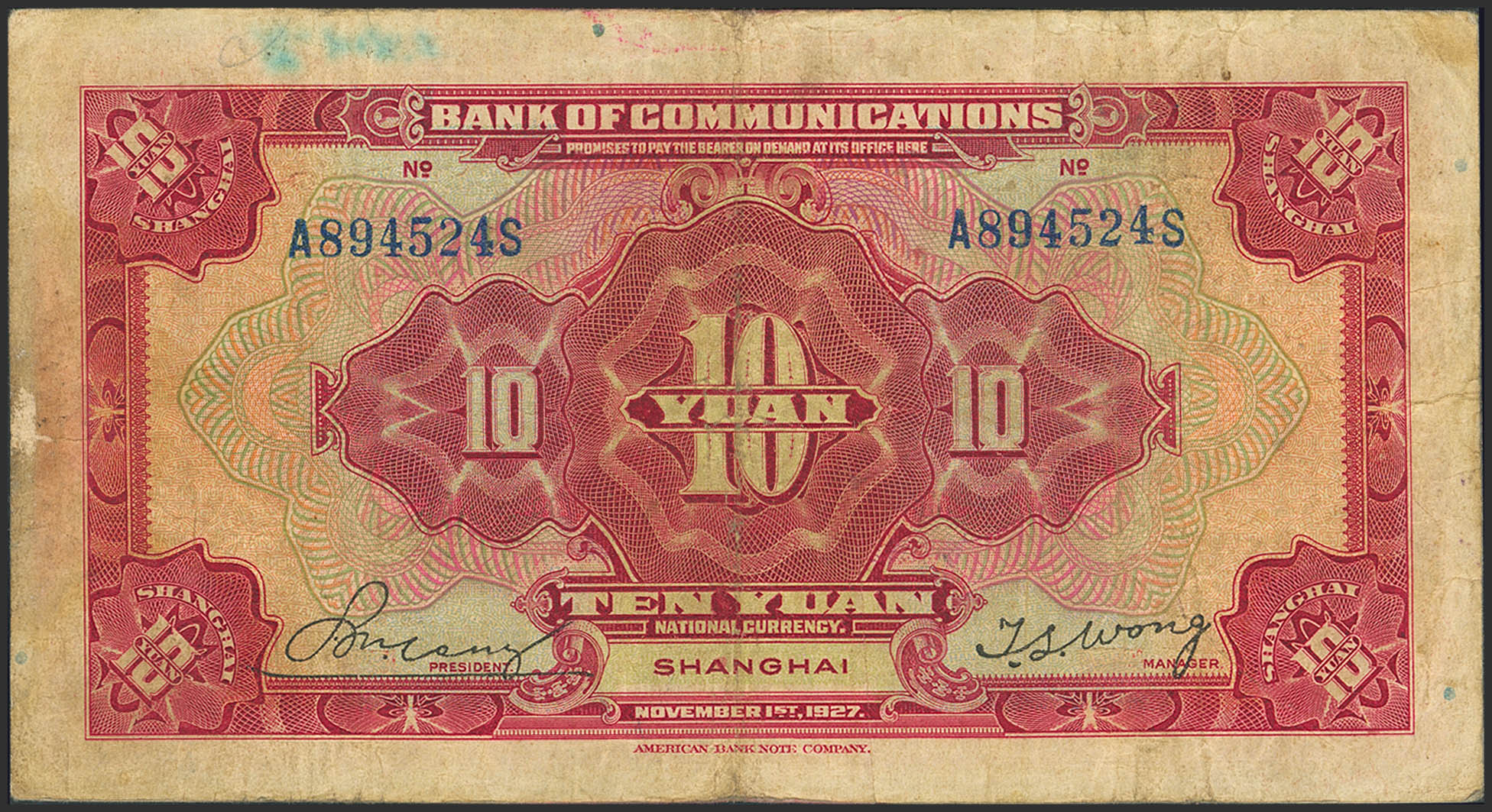 English CHINA. 10 Yuan. 1 November 1927. Bank of Communication. Shanghai. (Pick: 147A). Very Fine.