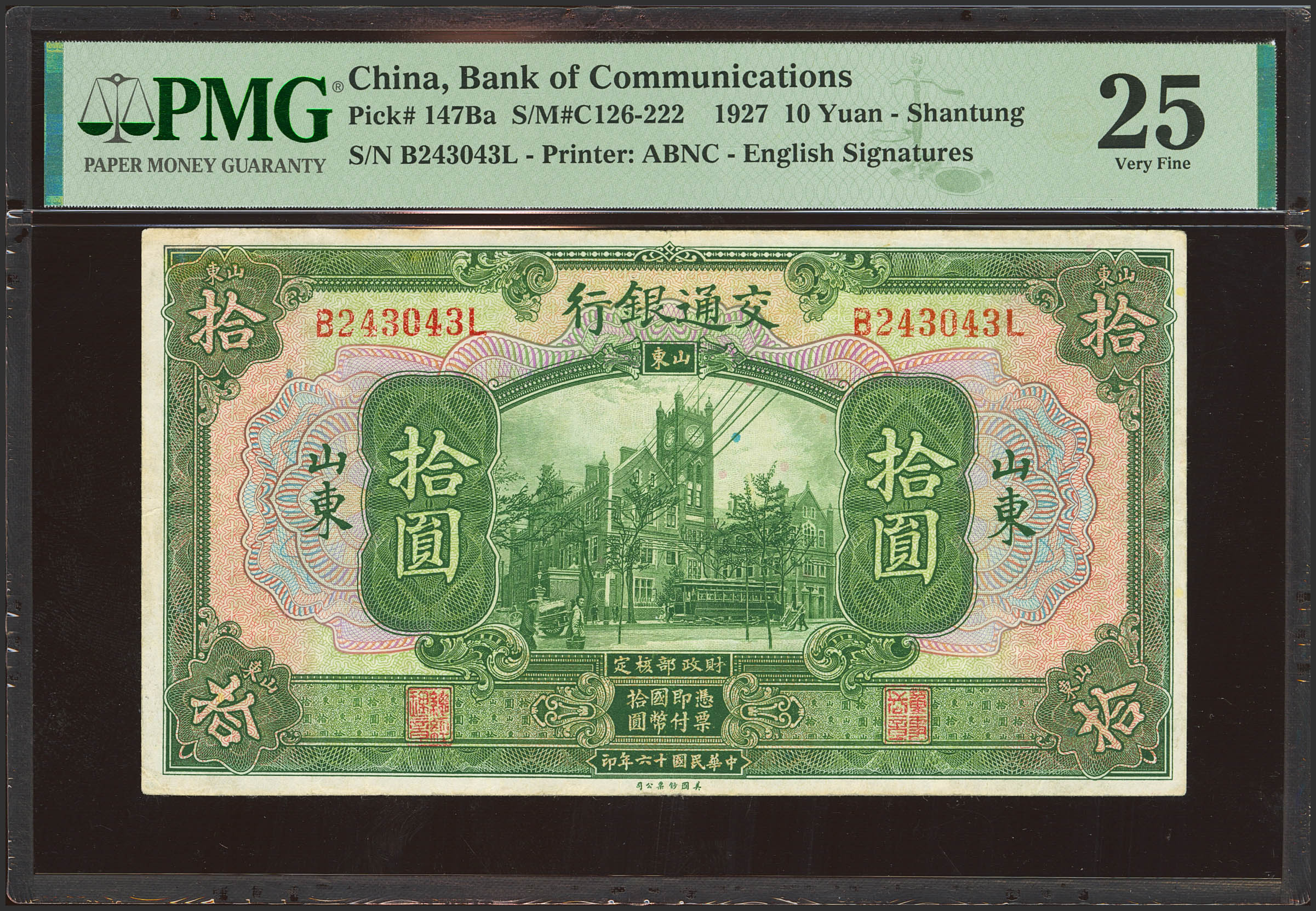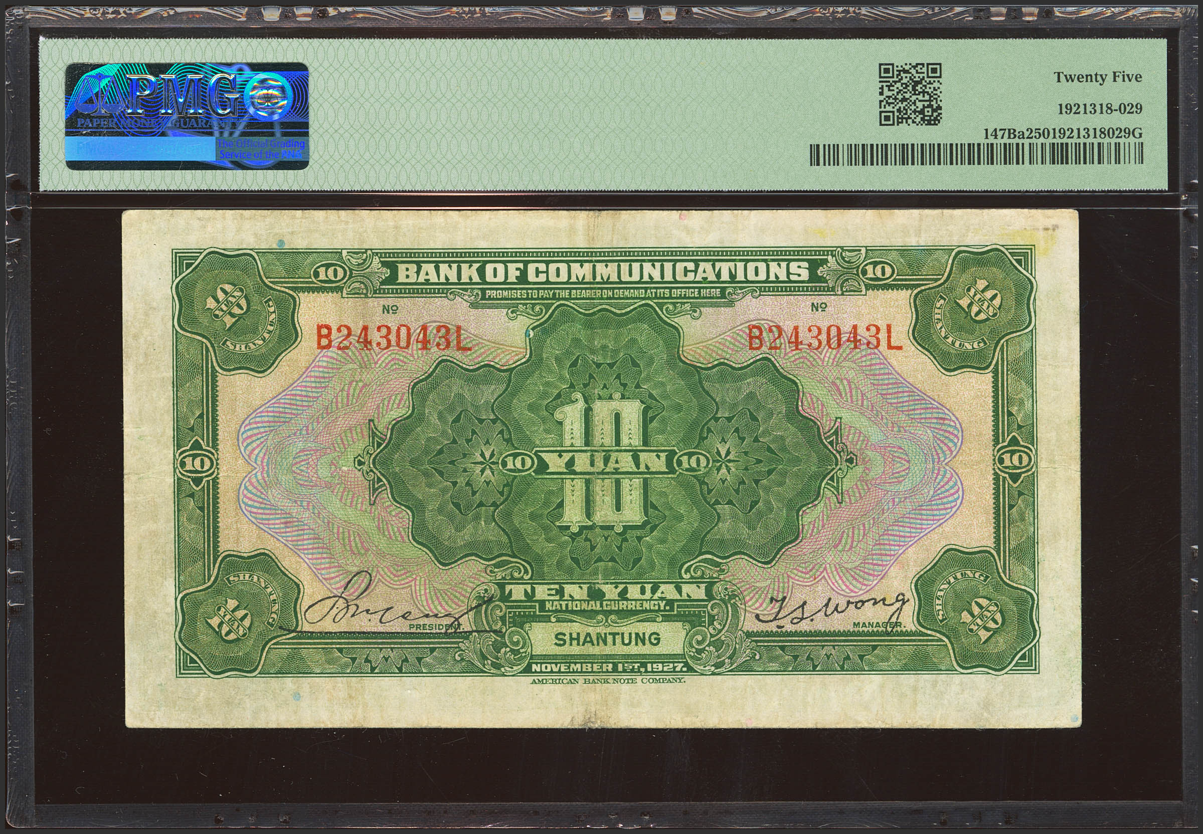 English CHINA. 10 Yuan. 1 November 1927. Bank of Communication. Shantung. (Pick: 147Ba, SM: C126-222). PMG25.