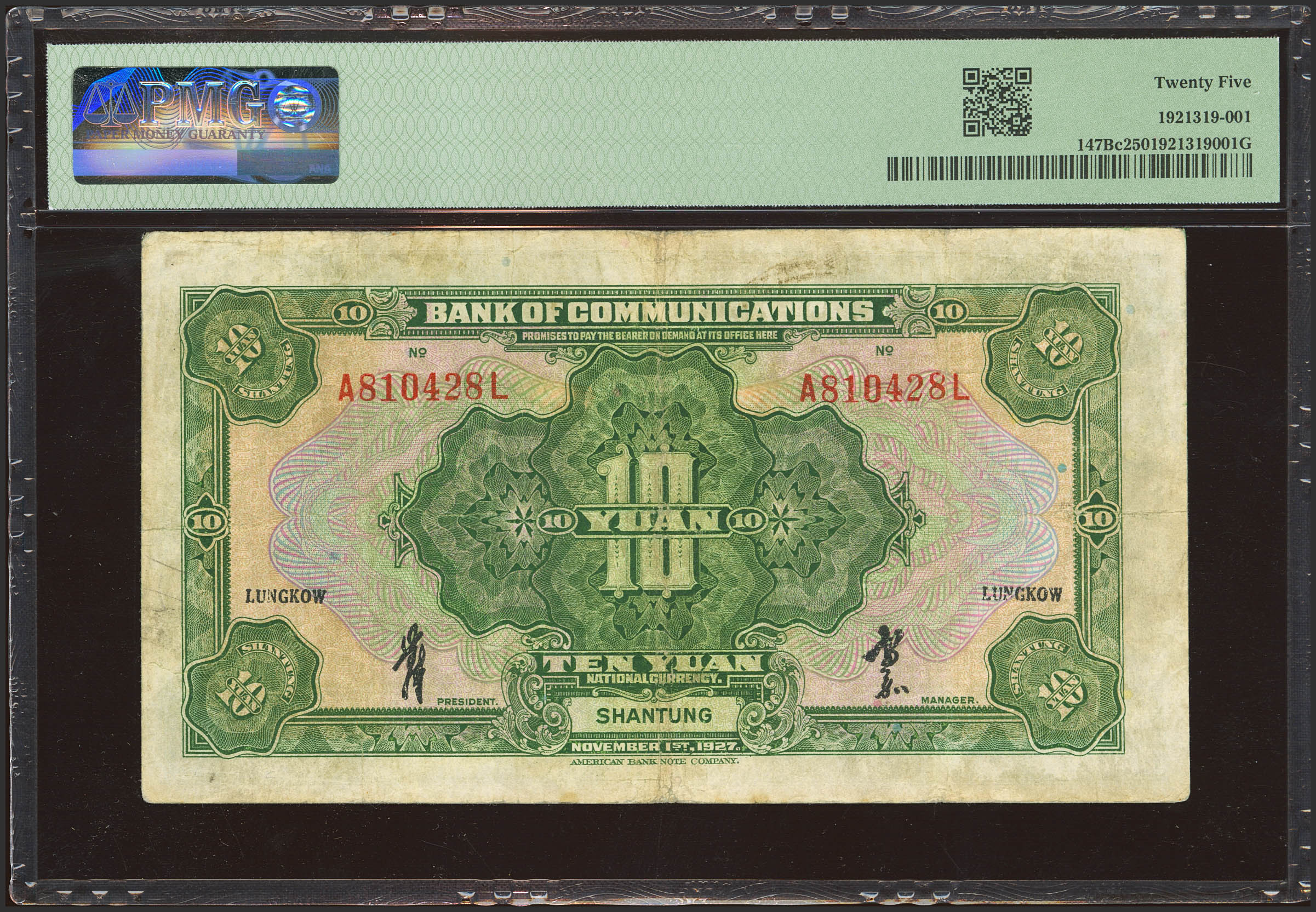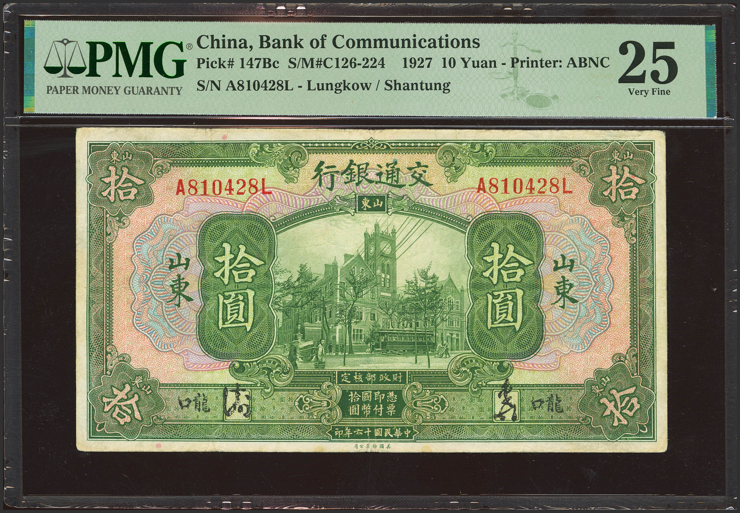 CHINA. 10 Yuan. 1 November 1927. Bank of Communication. Lungkow/Shantung. (Pick: 147Bc, SM: C126-224). PMG25.