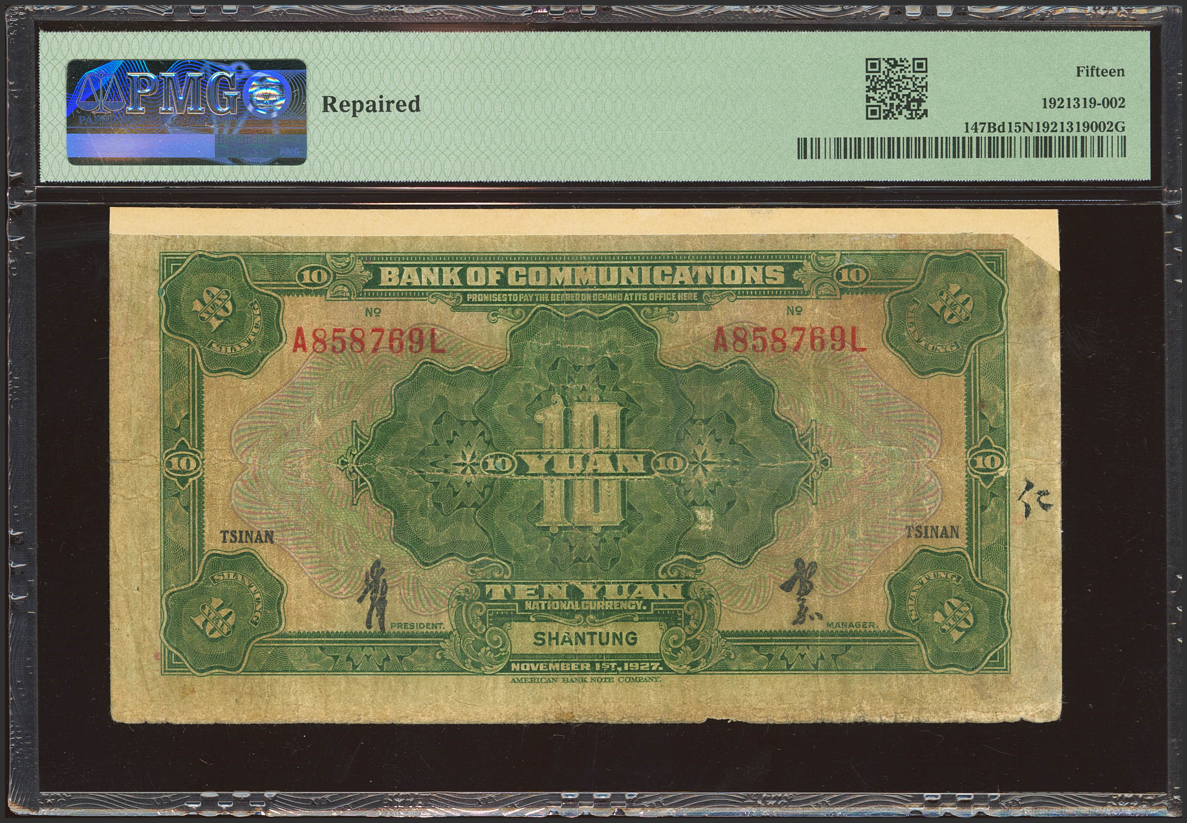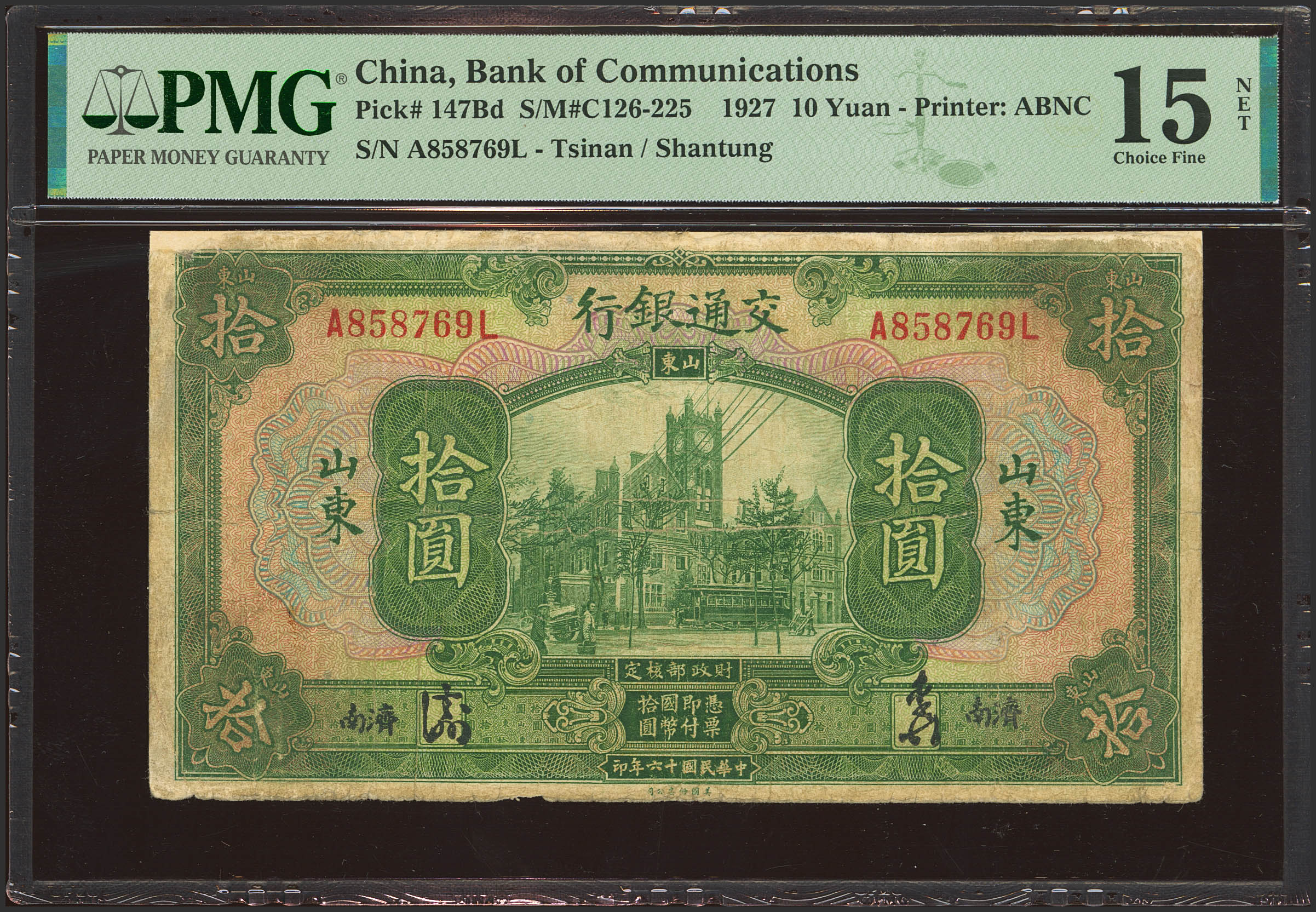 English CHINA. 10 Yuan. 1 November 1927. Bank of Communication. Tsinan/Shantung. (Pick: 147Bd, SM: C126-225). PMG15NET (repaired).