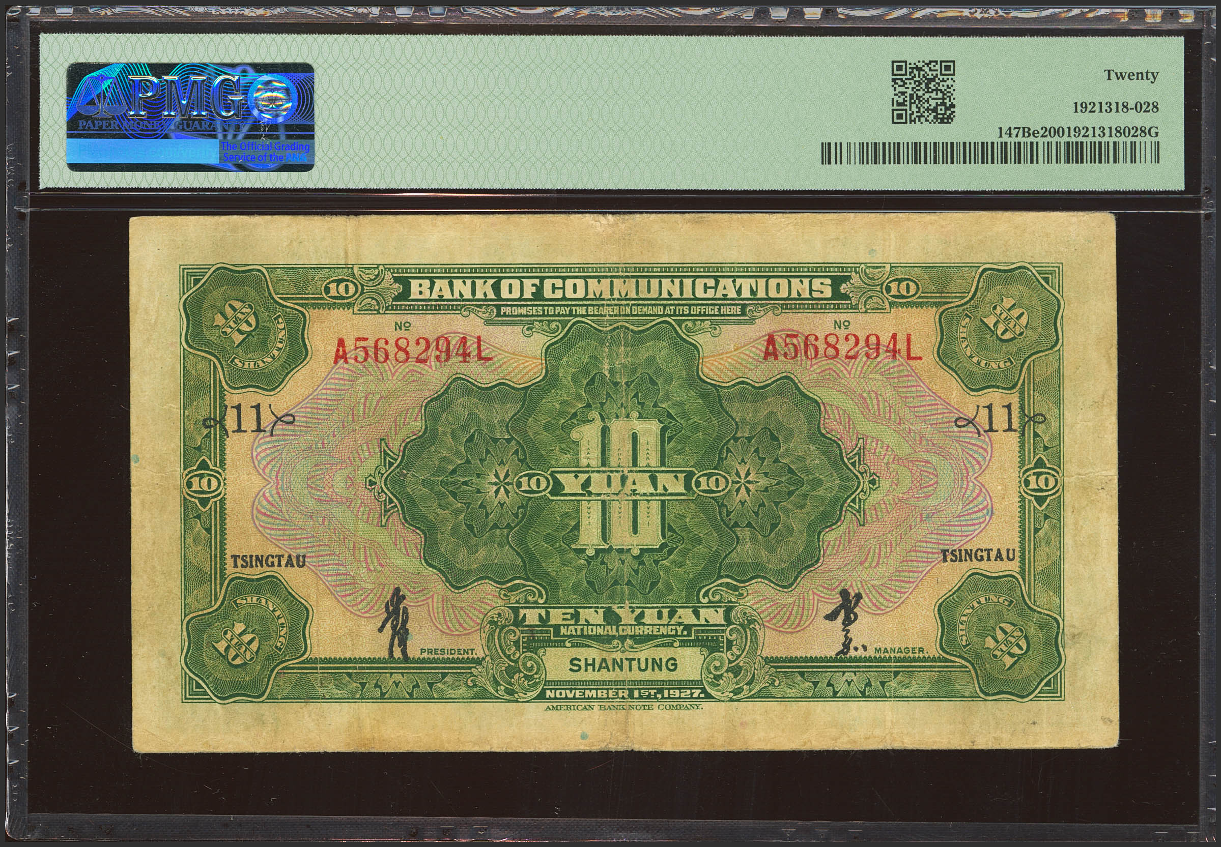 CHINA. 10 Yuan. 1 November 1927. Bank of Communication. Tsingtau/Shantung. Chinese characters. (Pick: 147Be, SM: C126-226). PMG20.