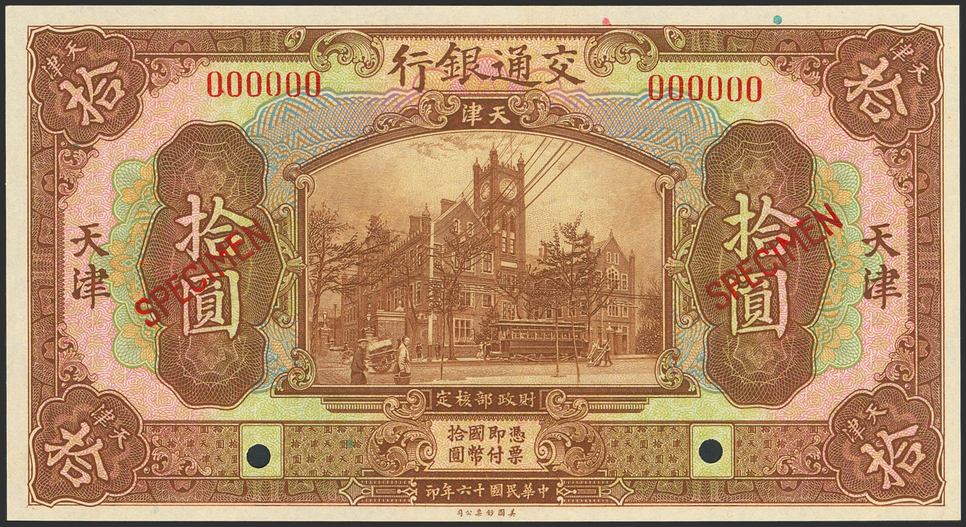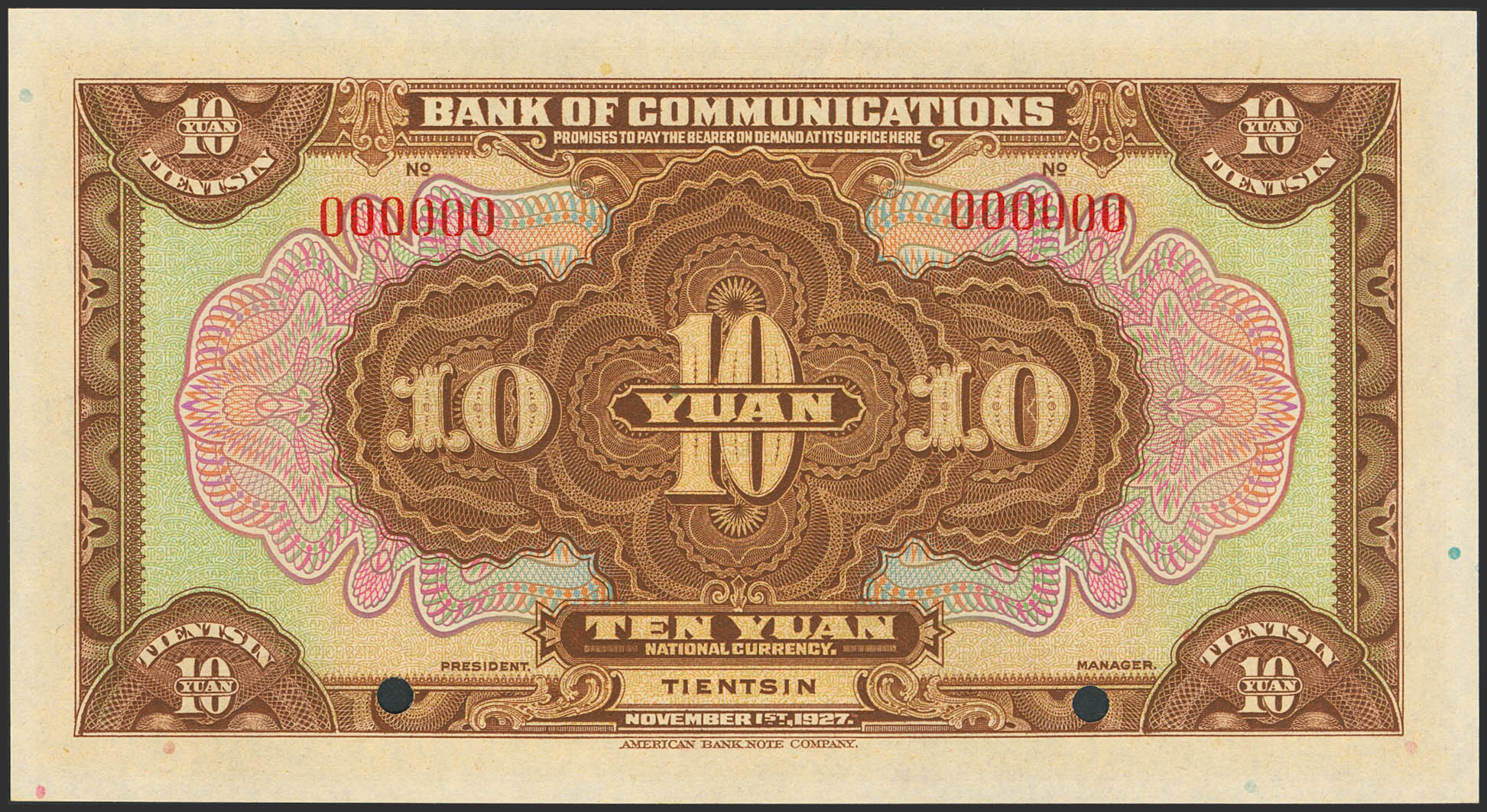 CHINA. 10 Yuan. 1 November 1927. Bank of Communication. Tientsin. Specimen. (Pick: 147Cas). Uncirculated.