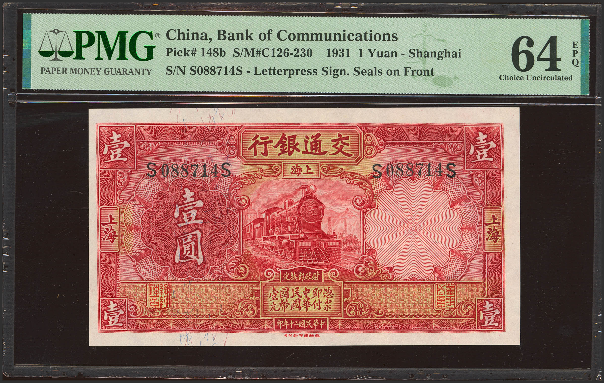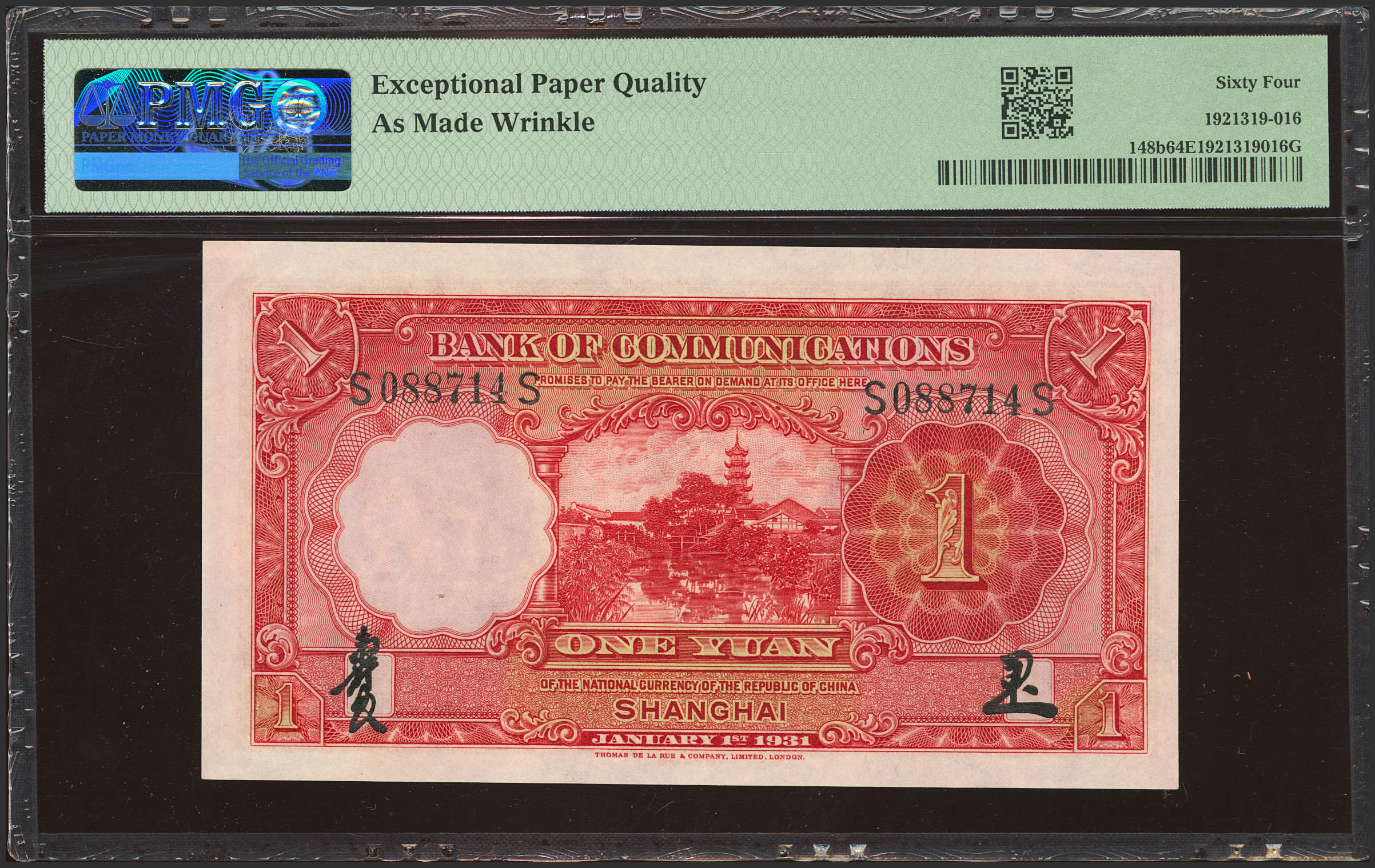 CHINA. 1 Yuan. 1 January 1931. Bank of Communication. Shanghai. (Pick: 148b, SM: C126-230). PMG64EPQ (as made wrinkle).