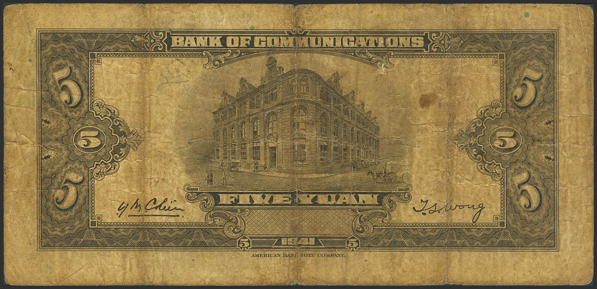 CHINA. 5 Yuan. 1941. Bank of Communication. (Pick: 156). Fine.