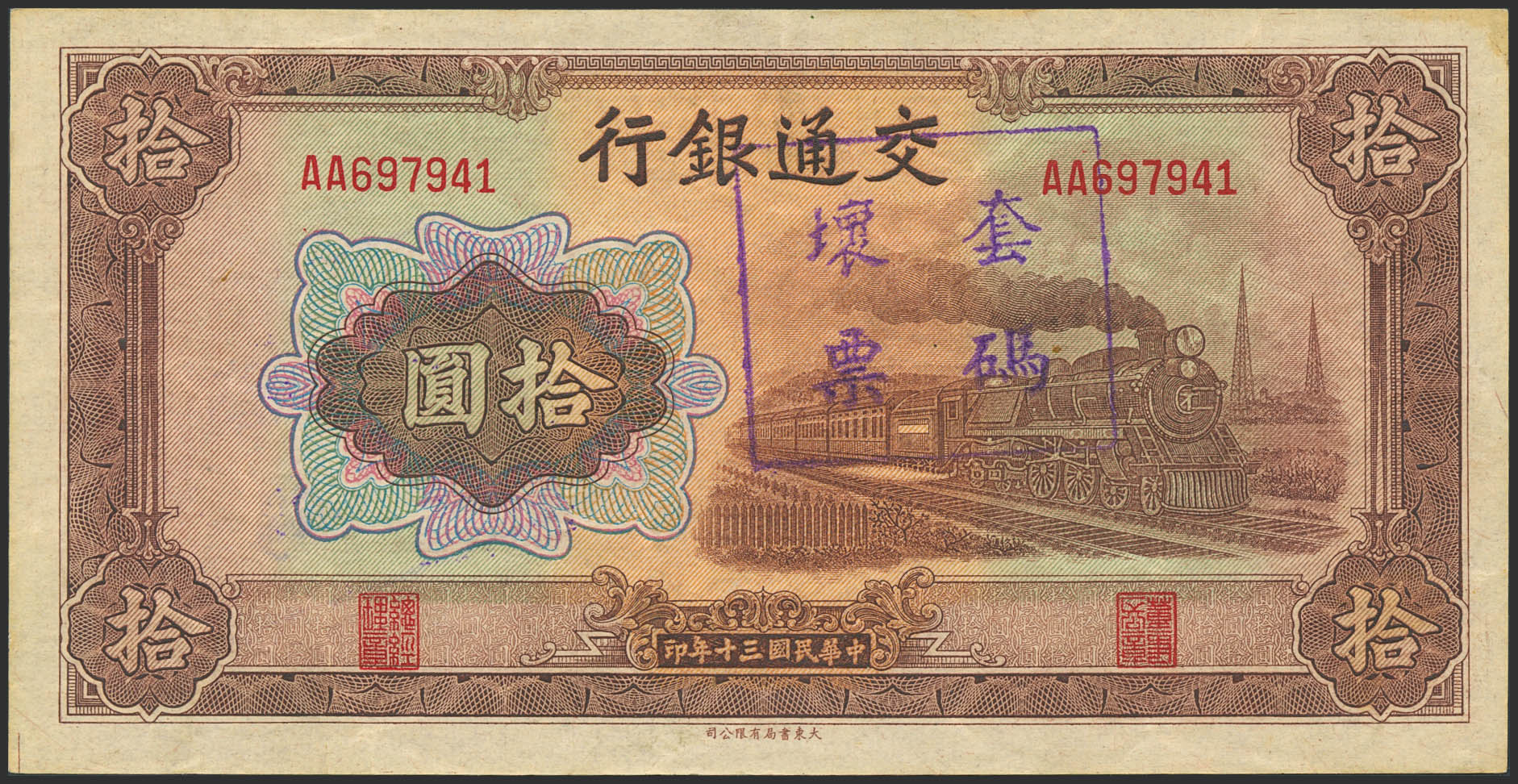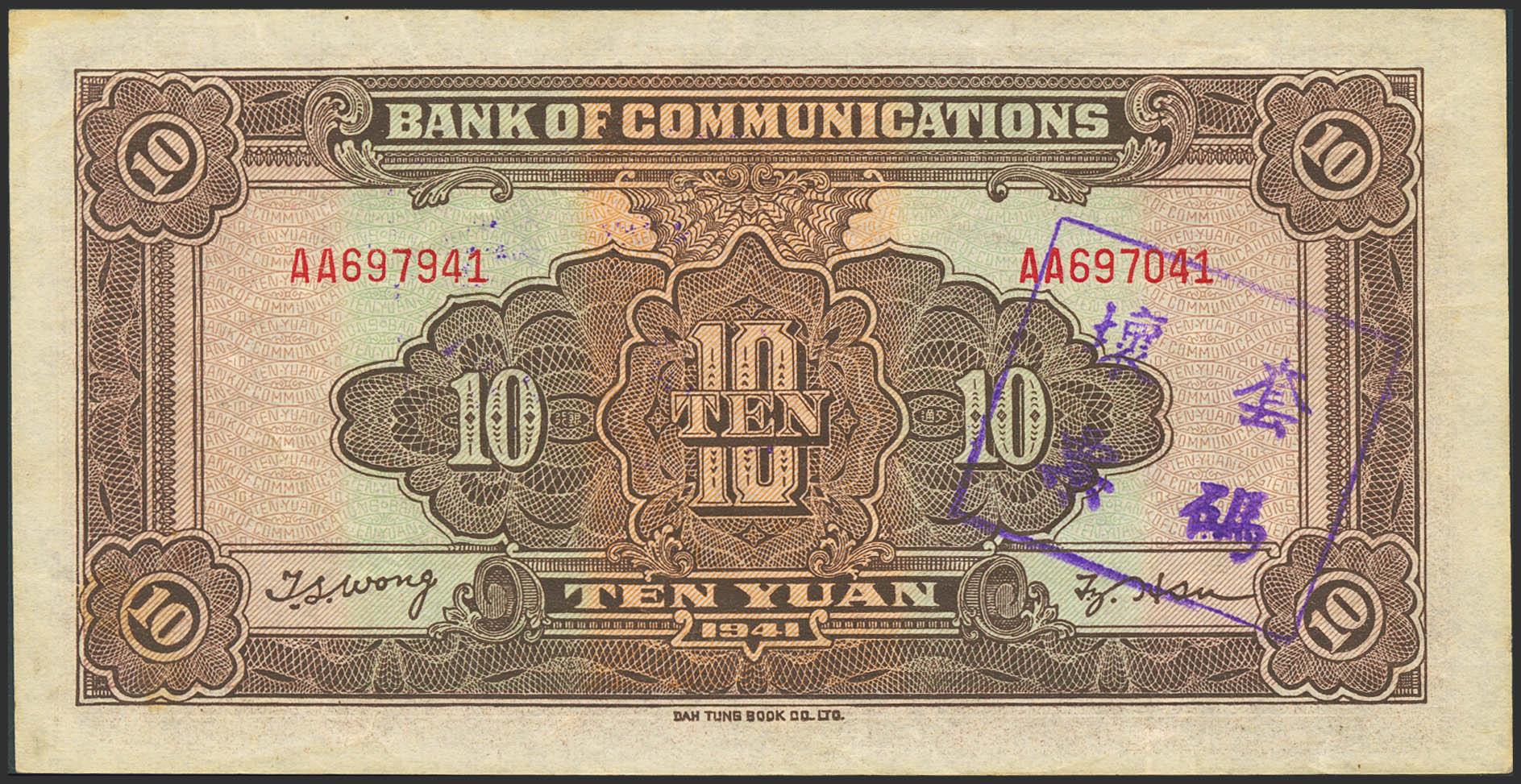 English CHINA. 10 Yuan. 1941. Bank of Communication. Cancellation handstamp. (Pick: 159e). More than Very Fine.