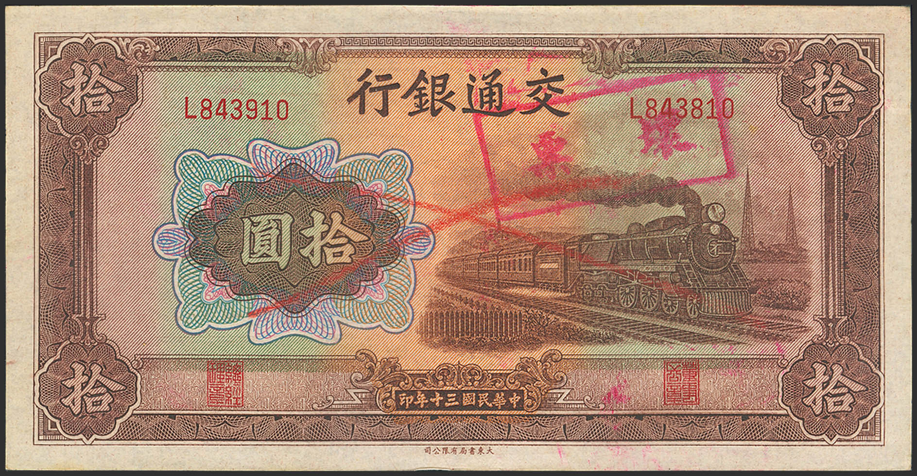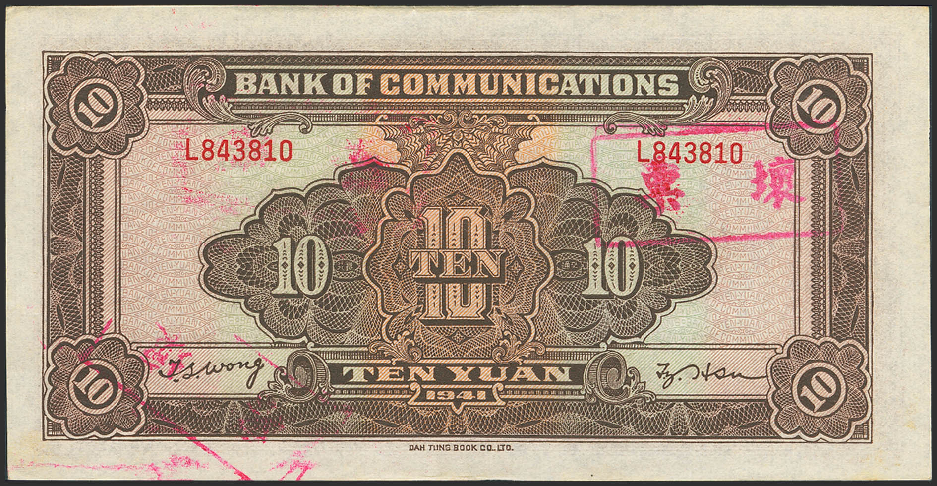 CHINA. 10 Yuan. 1941. Bank of Communication. Cancellation handstamp. (Pick: 159e). Almost Uncirculated.