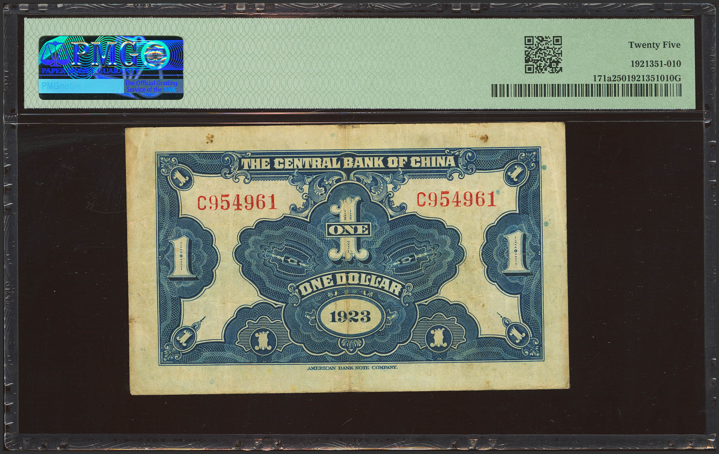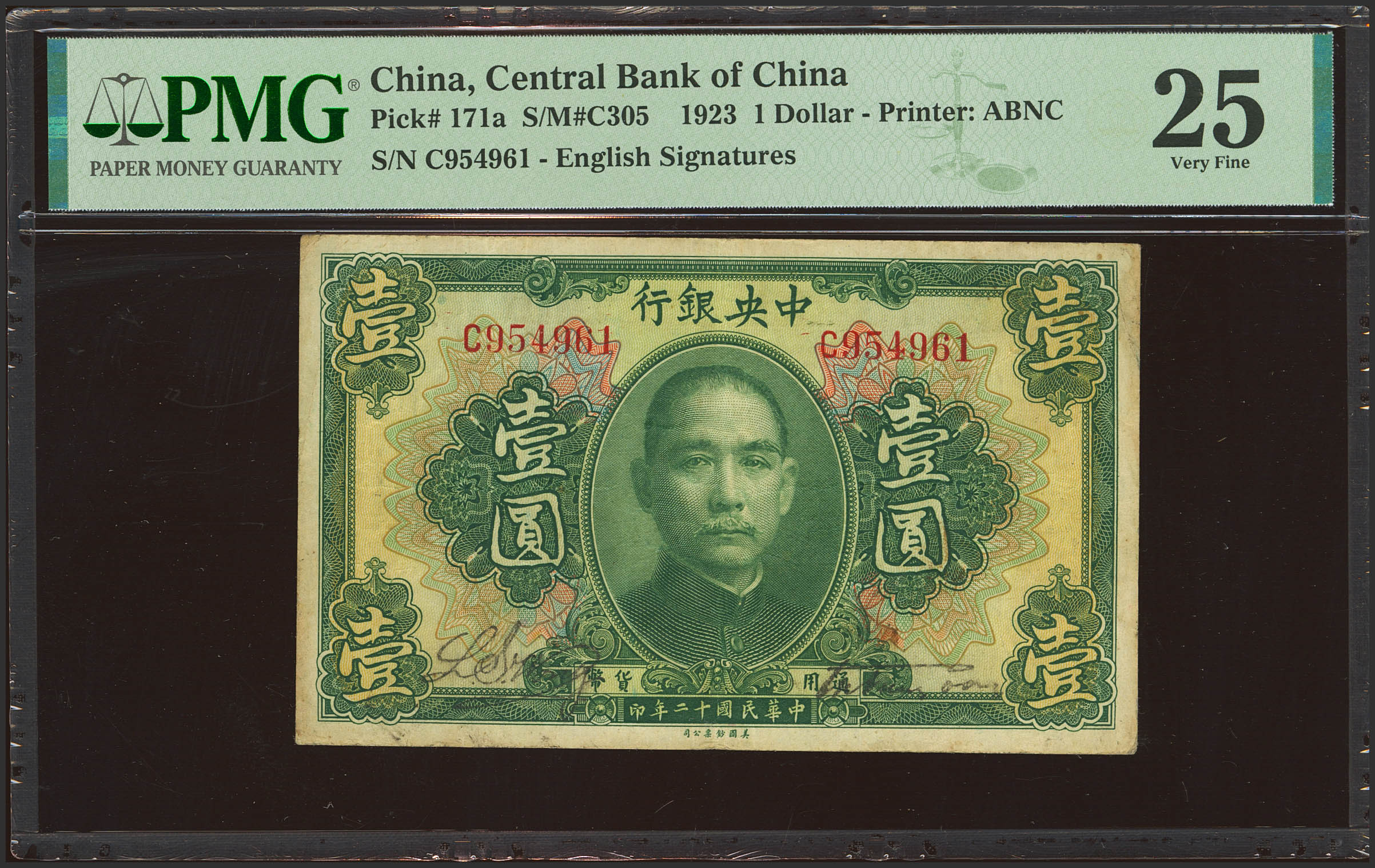 English CHINA. 1 Dollar. 1923. Central Bank of China. (Pick: 171a, SM: C305). PMG25.