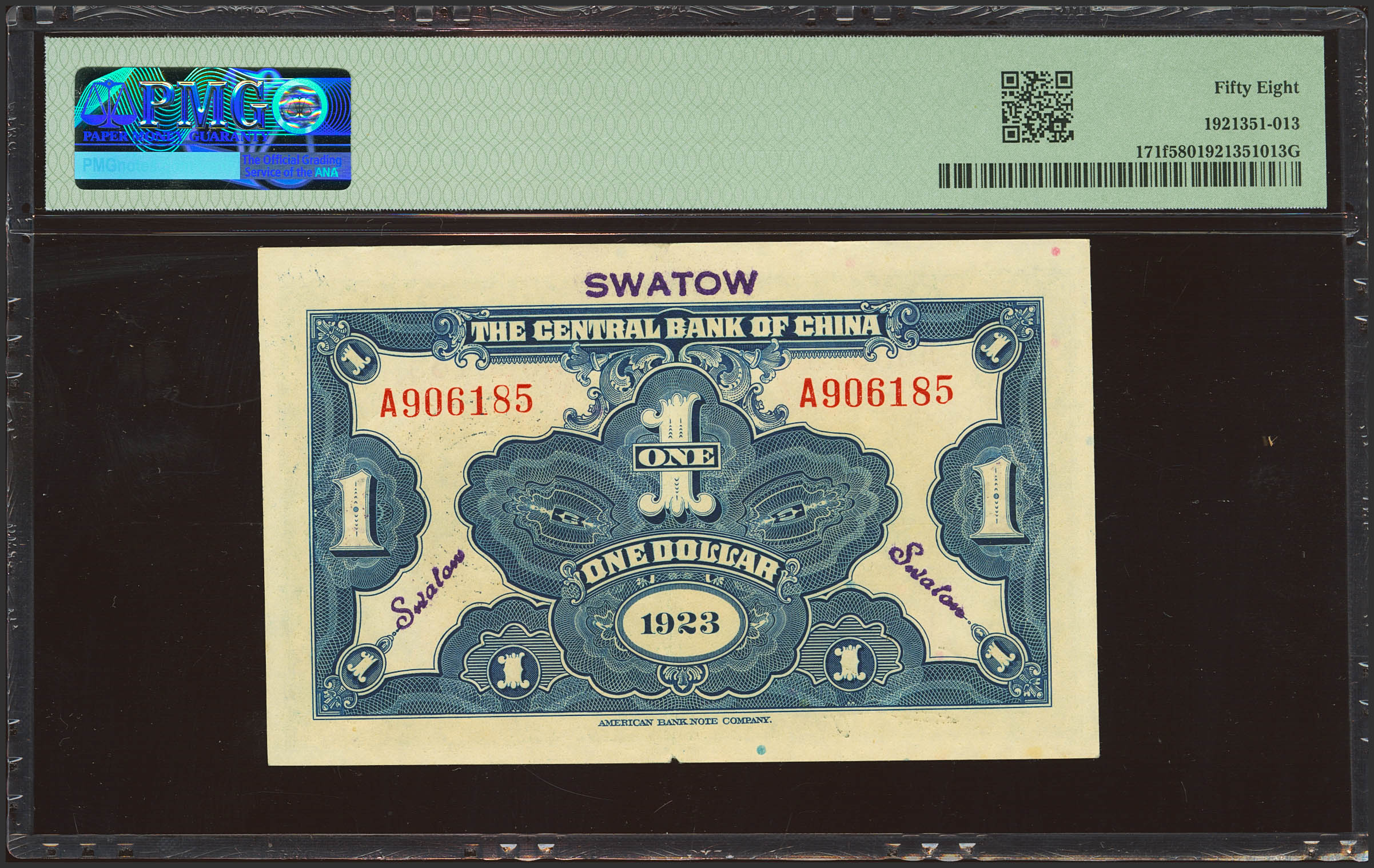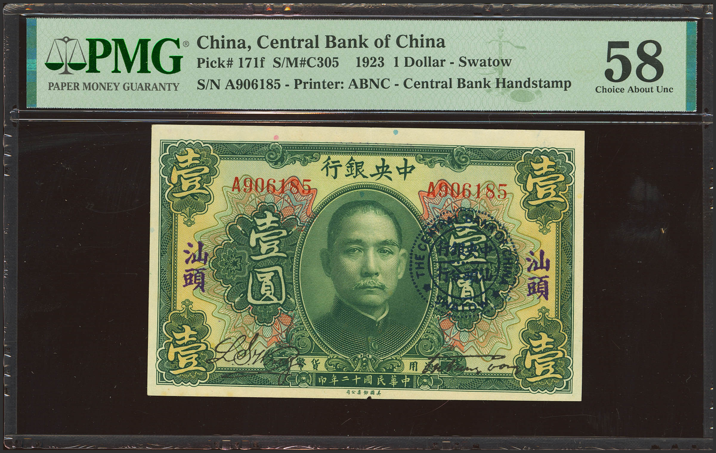 CHINA. 1 Dollar. 1923. Central Bank of China. Swatow. Central Bank handstamp. (Pick: 171f, SM: 305). PMG58.