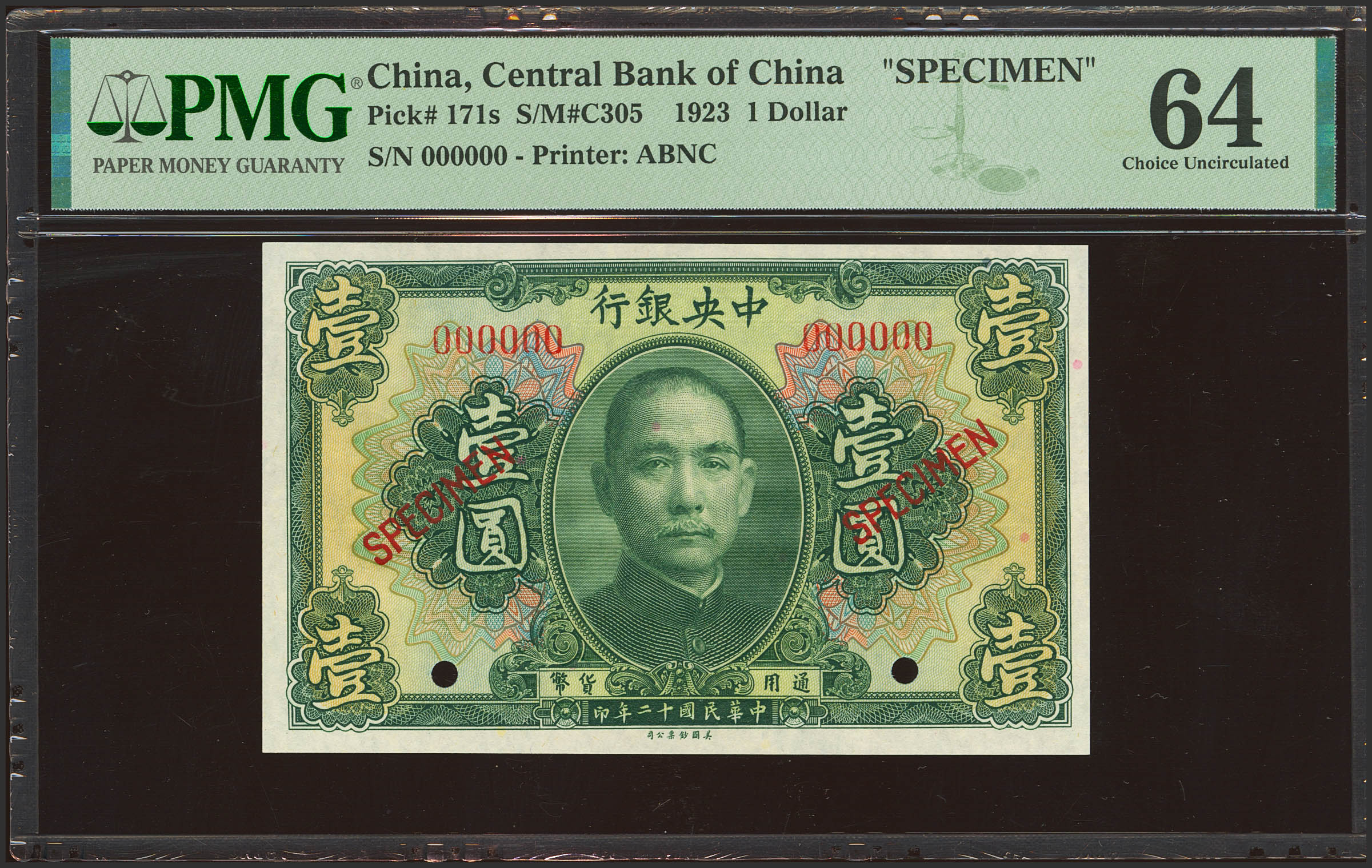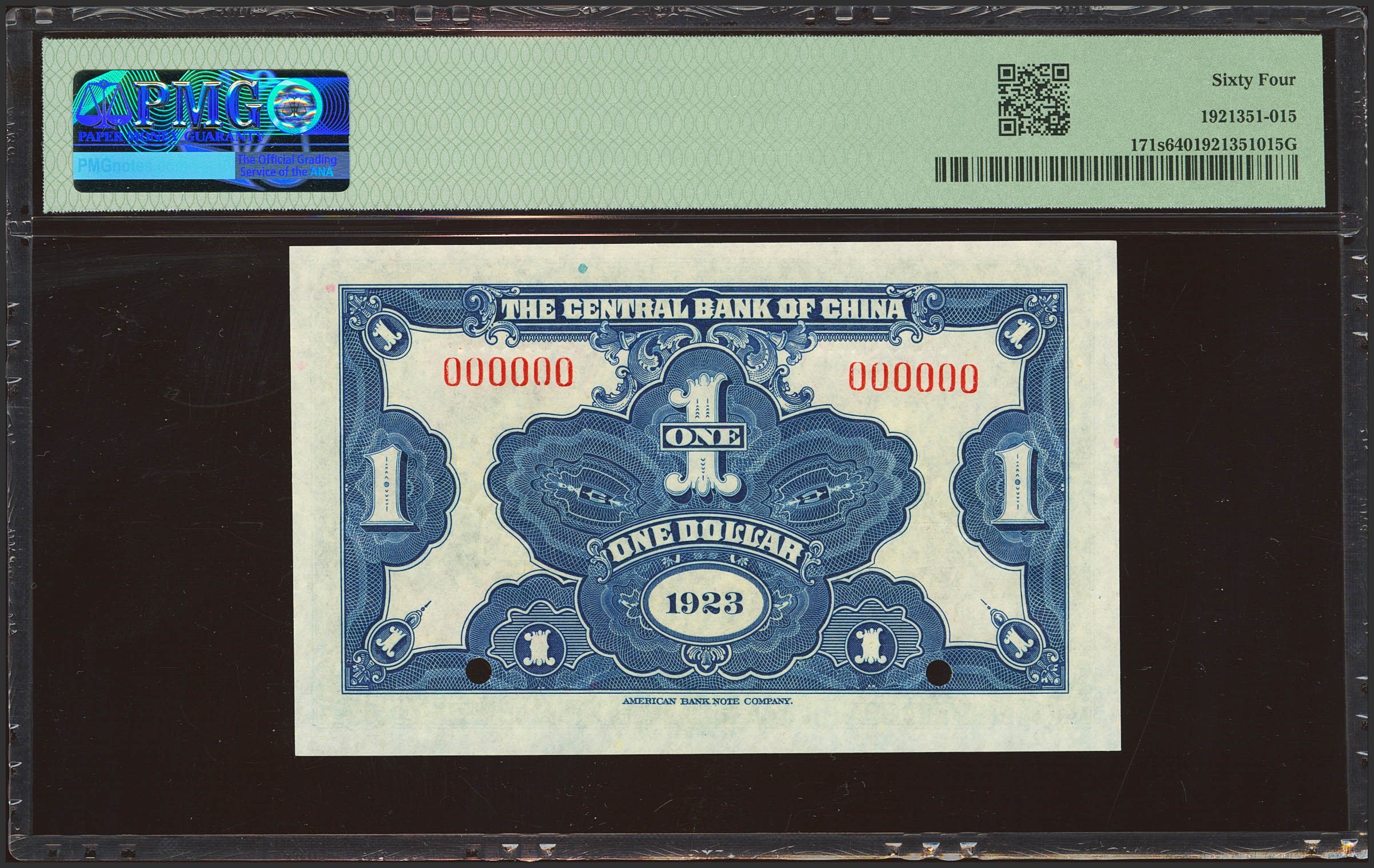 CHINA. 1 Dollar. 1923. Central Bank of China. Specimen. (Pick: 171s, SM: C305). PMG64.