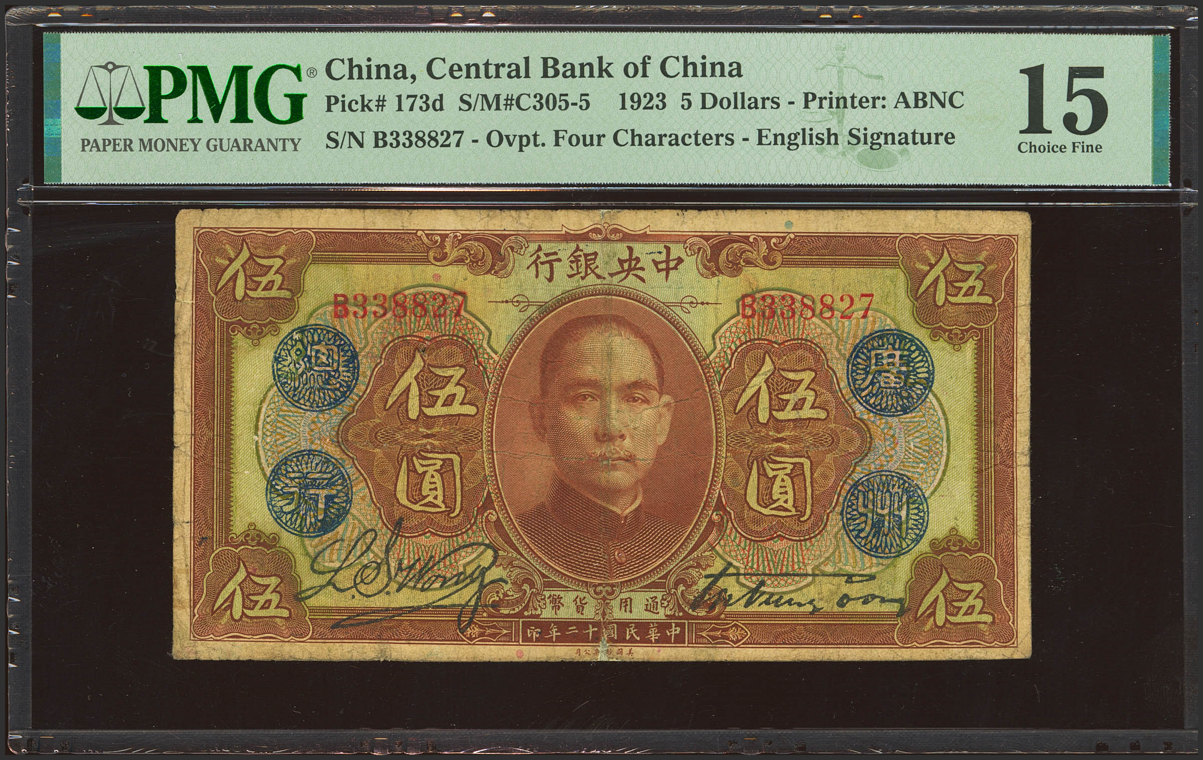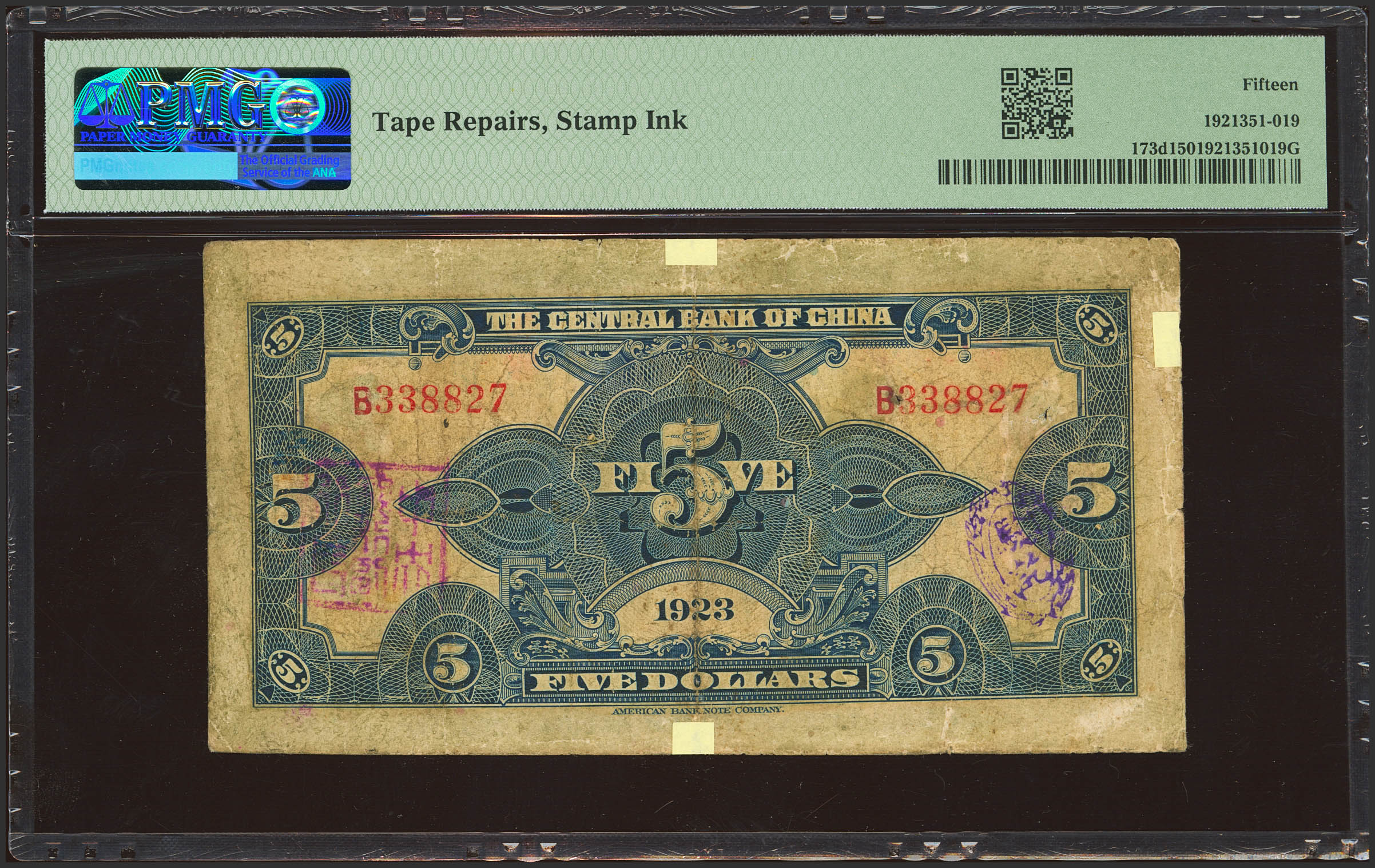 CHINA. 5 Dollars. 1923. Central Bank of China. (Pick: 173d, SM: C305-5). PMG15 (tape repairs, stamp ink).