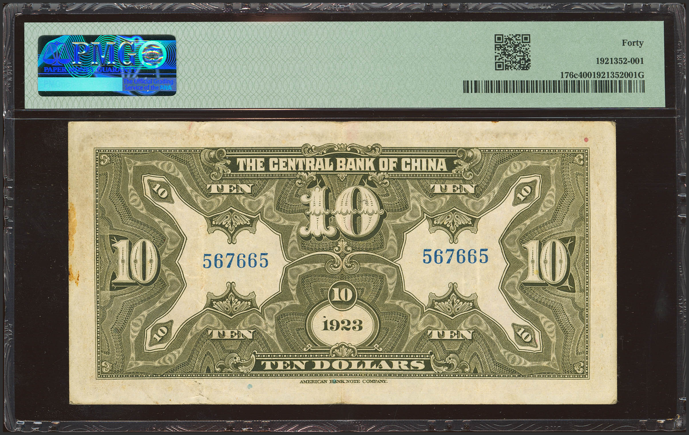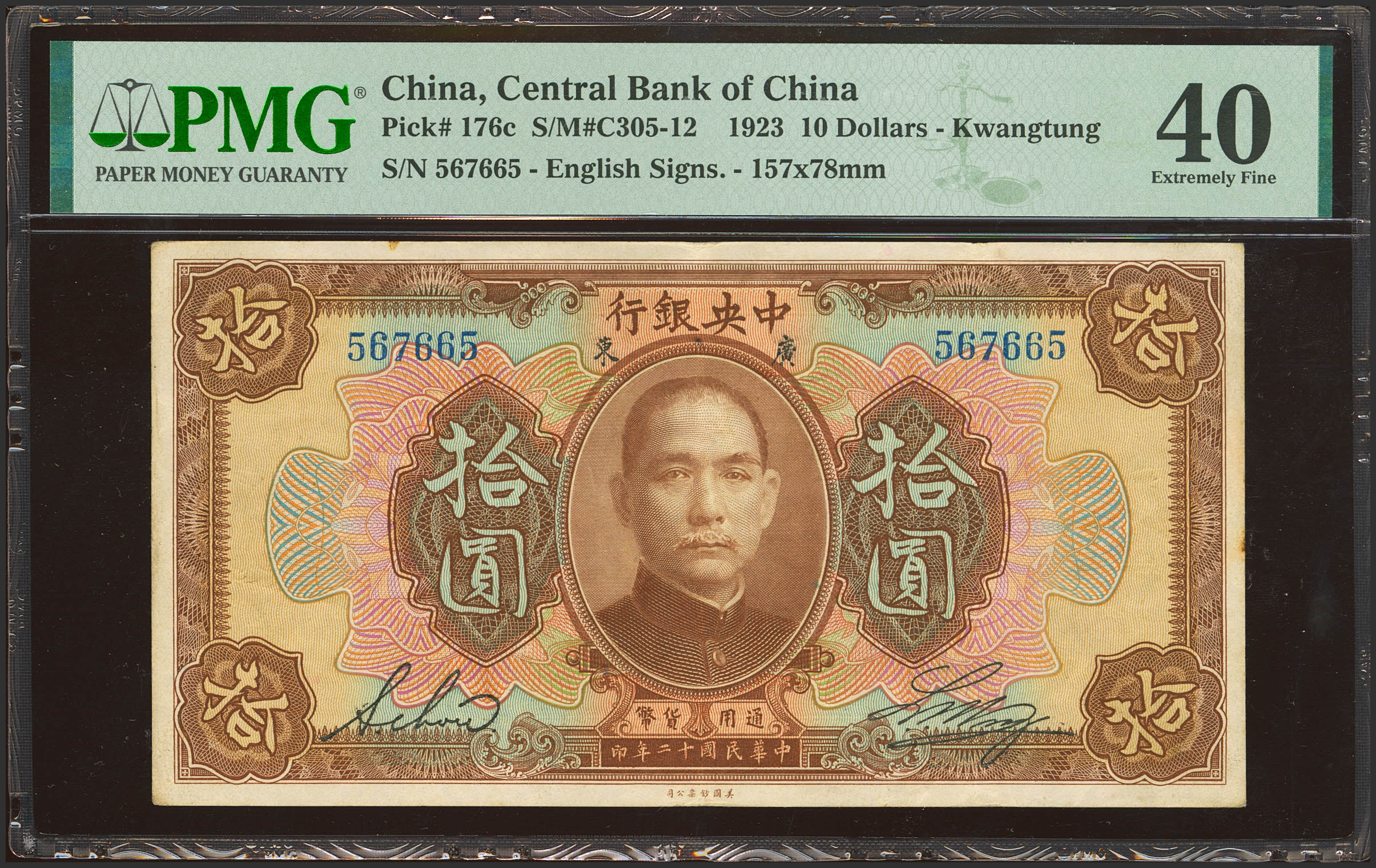 English CHINA. 10 Dollars. 1923. Central Bank of China. (Pick: 176a, SM: C305-12). PMG40