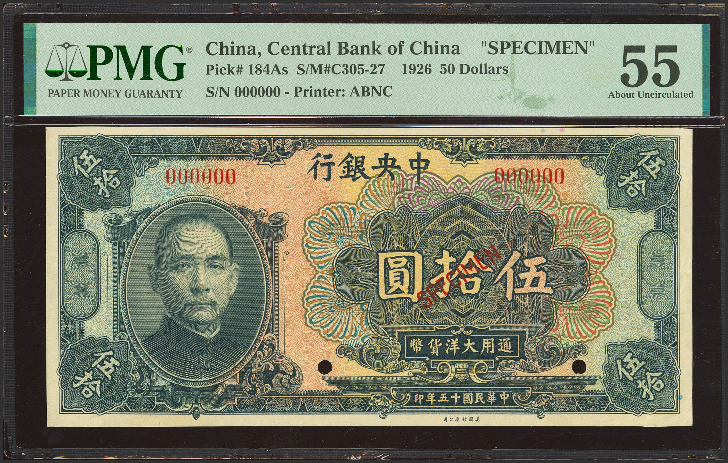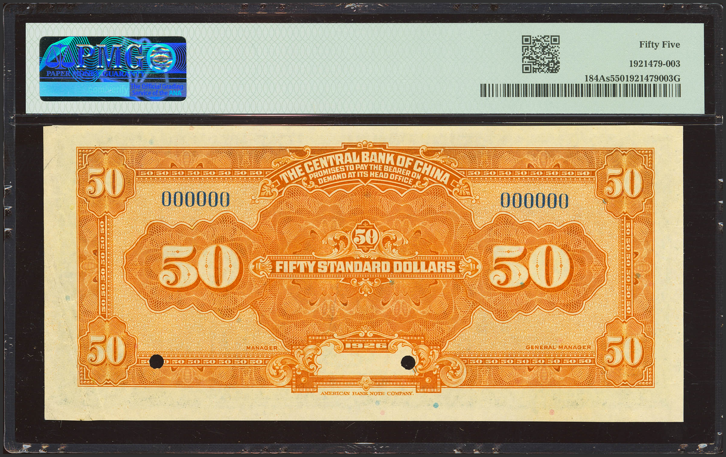 CHINA. 50 Standard Dollars. 1926. Central Bank of China. Specimen. (Pick: 184As, SM: C305-27). PMG55.
