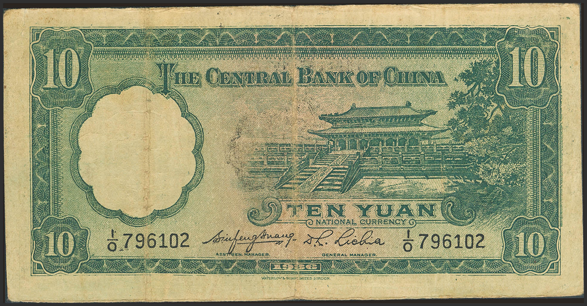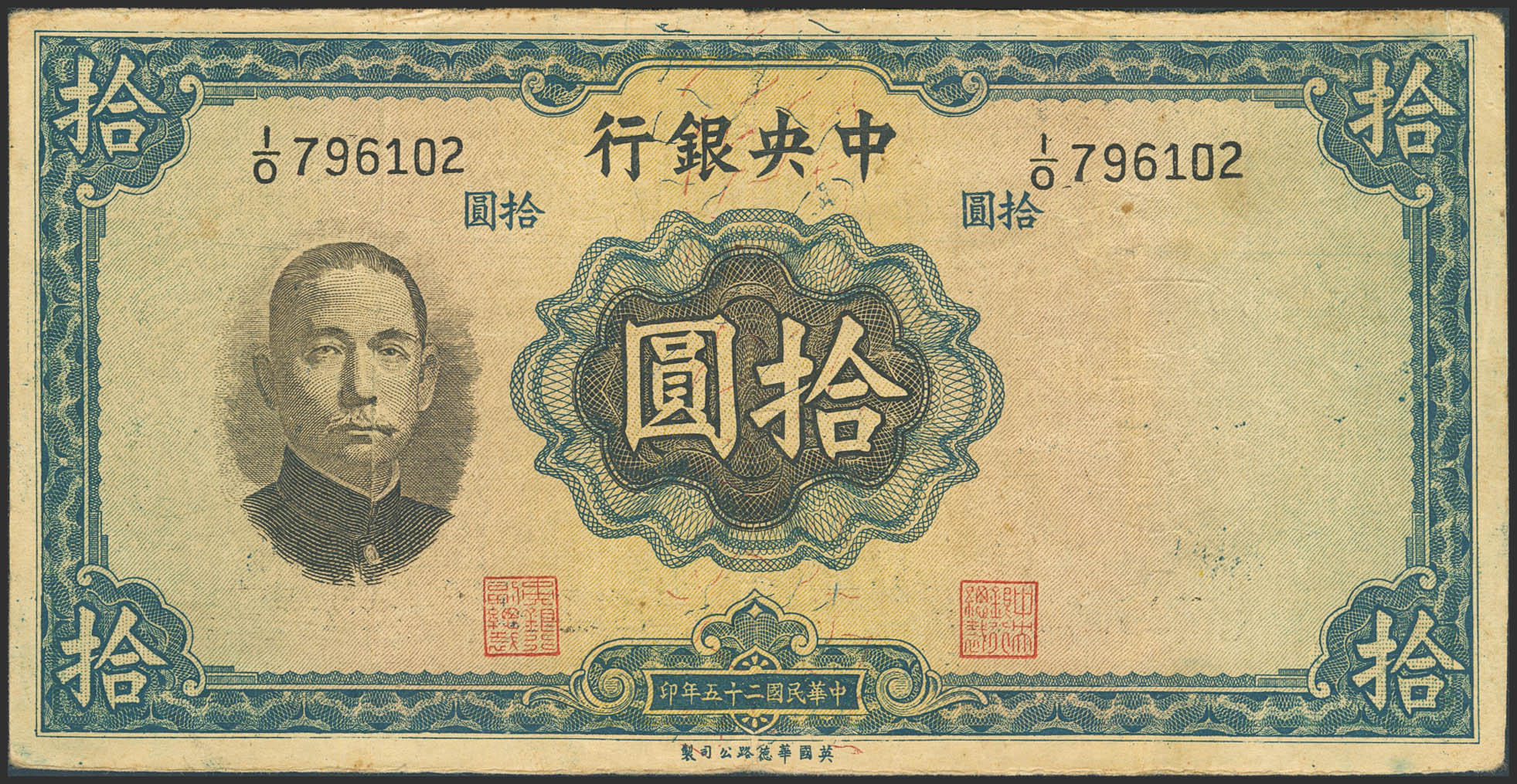 CHINA. 10 Yuan. 1936. Central Bank of China. Contemporary counterfeit. (Pick: 218x). Very Fine.