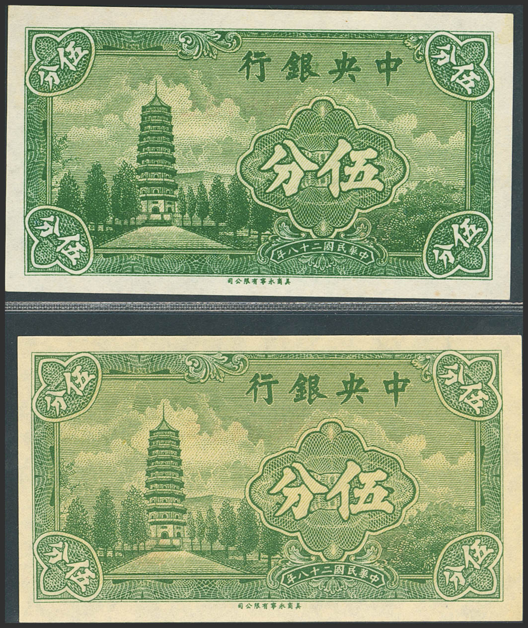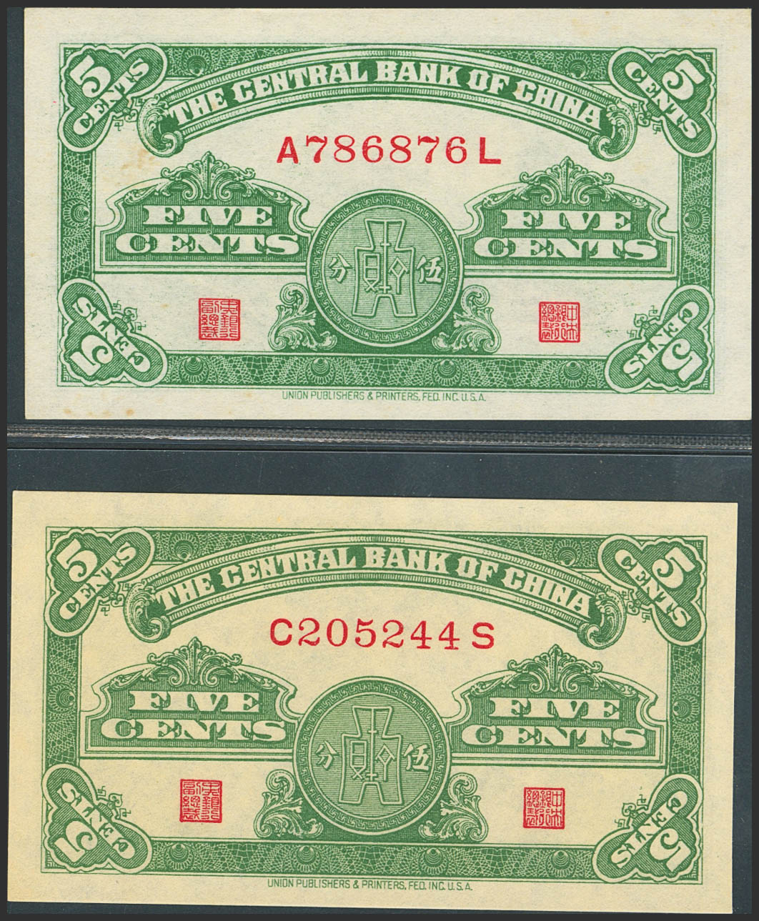 CHINA. Lot of 2 notes of 5 Cents. 1939. Central Bank of China. (Pick: 225a). Uncirculated.