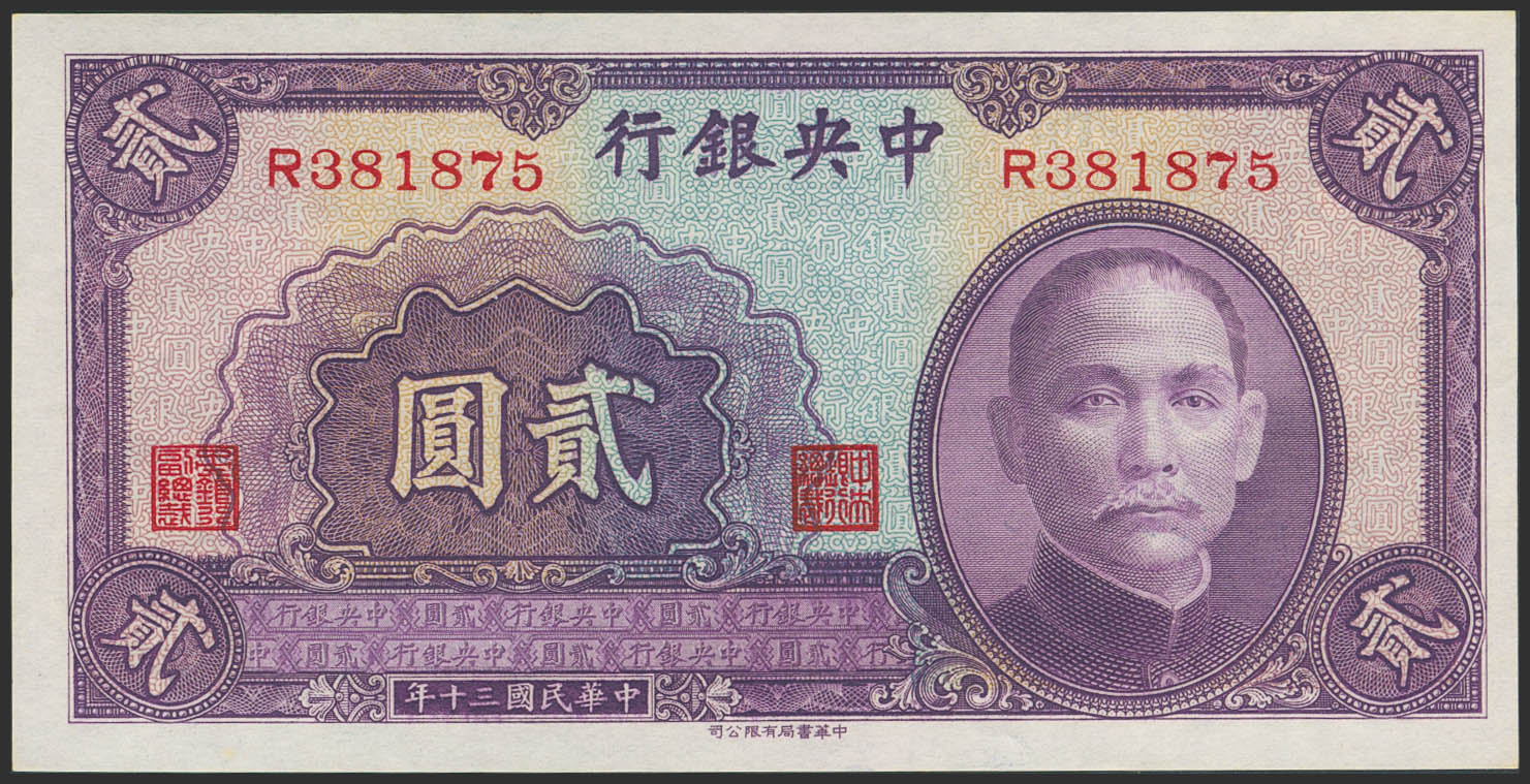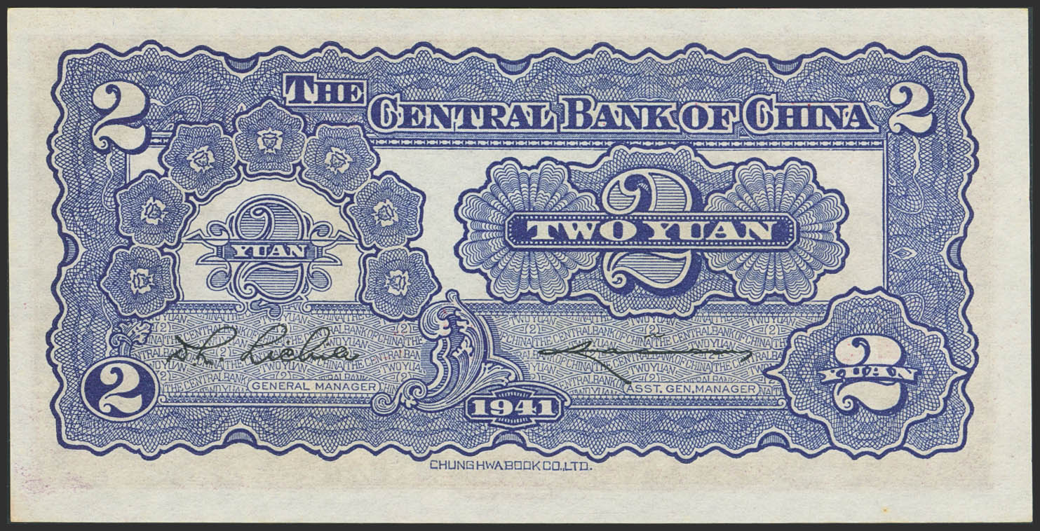 CHINA. 2 Yuan. 1941. Central Bank of China. (Pick: 230). Countmark. Less than Uncirculated.