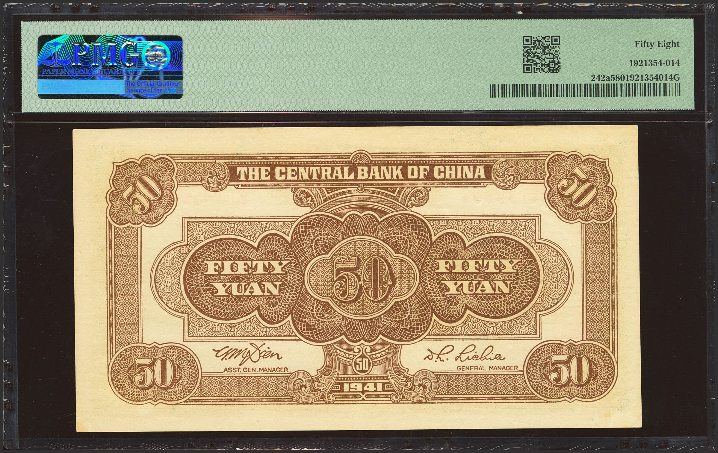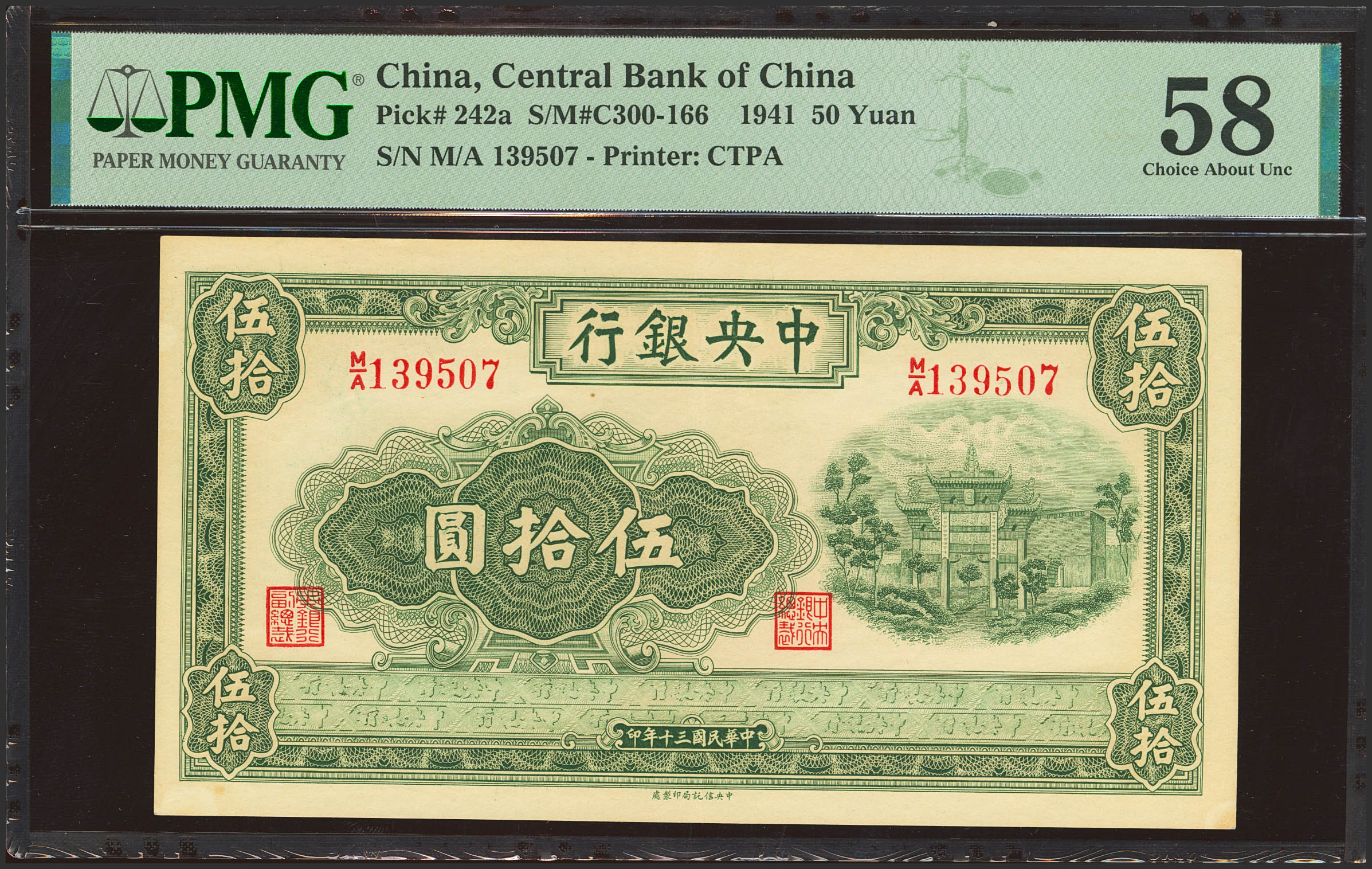 CHINA. 50 Yuan. 1941. Central Bank of China. 8 characters in the printer's name. (Pick: 242a, SM: C300-166). PMG58.