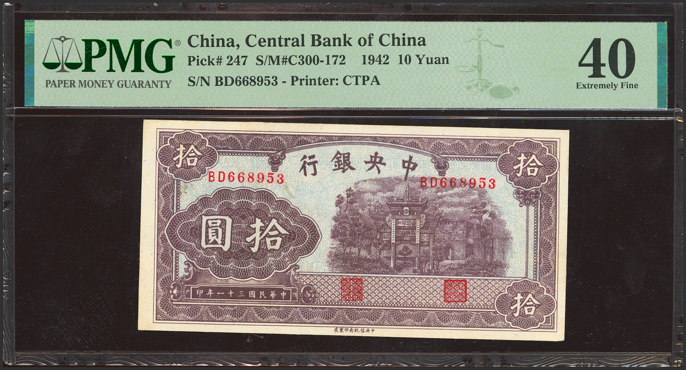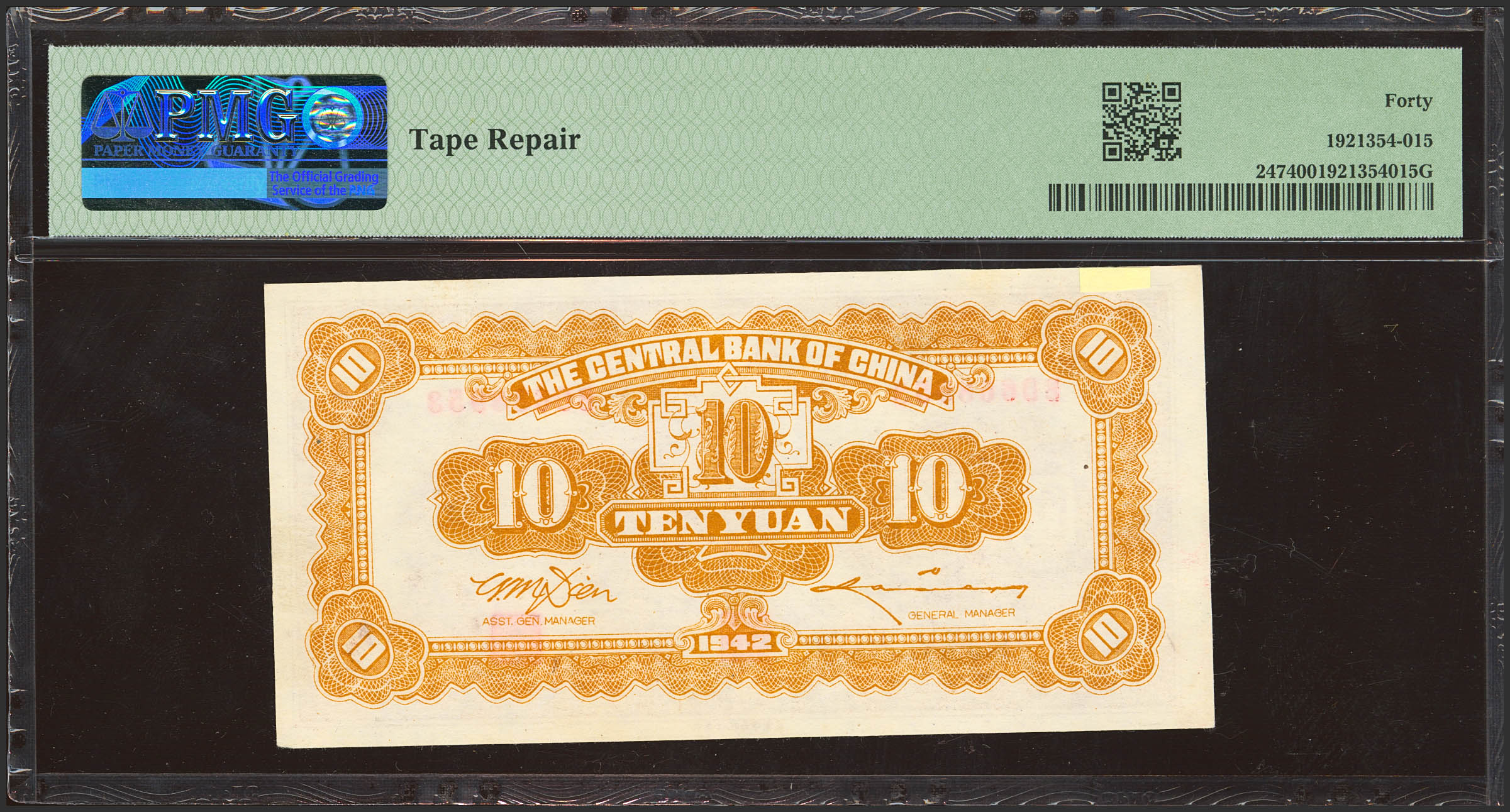 CHINA. 10 Yuan. 1942. Central Bank of China. Large serial. (Pick: 247, SM: C300-172). PMG40 (tape repair).
