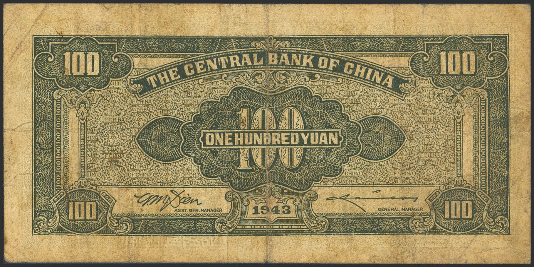 CHINA. 100 Yuan. 1943. Central Bank of China. (Pick: 254). Washed and flattened. More than Fine.
