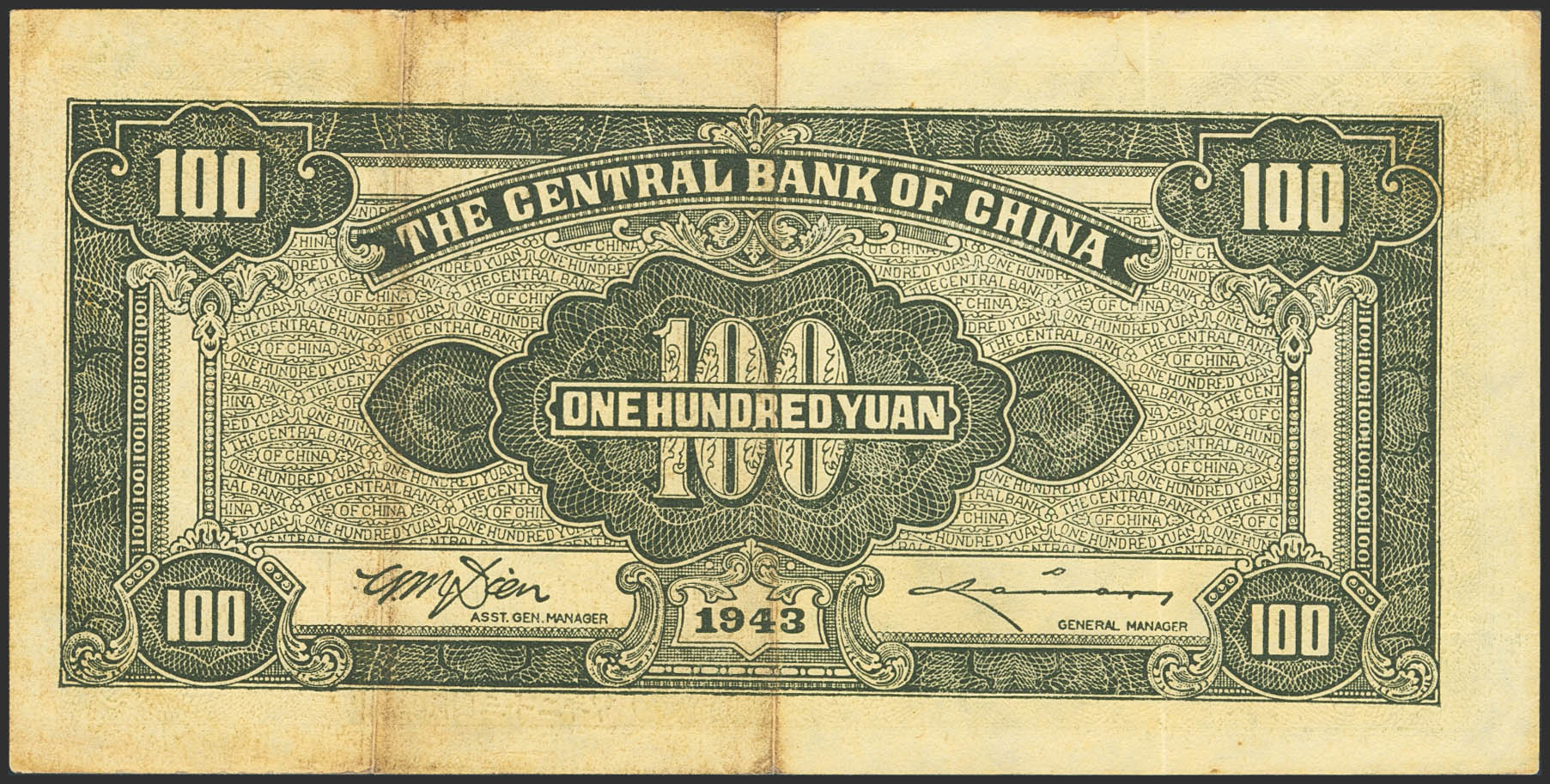 CHINA. 100 Yuan. 1943. Central Bank of China. (Pick: 254). Little bite on top. More than Extremely Fine.