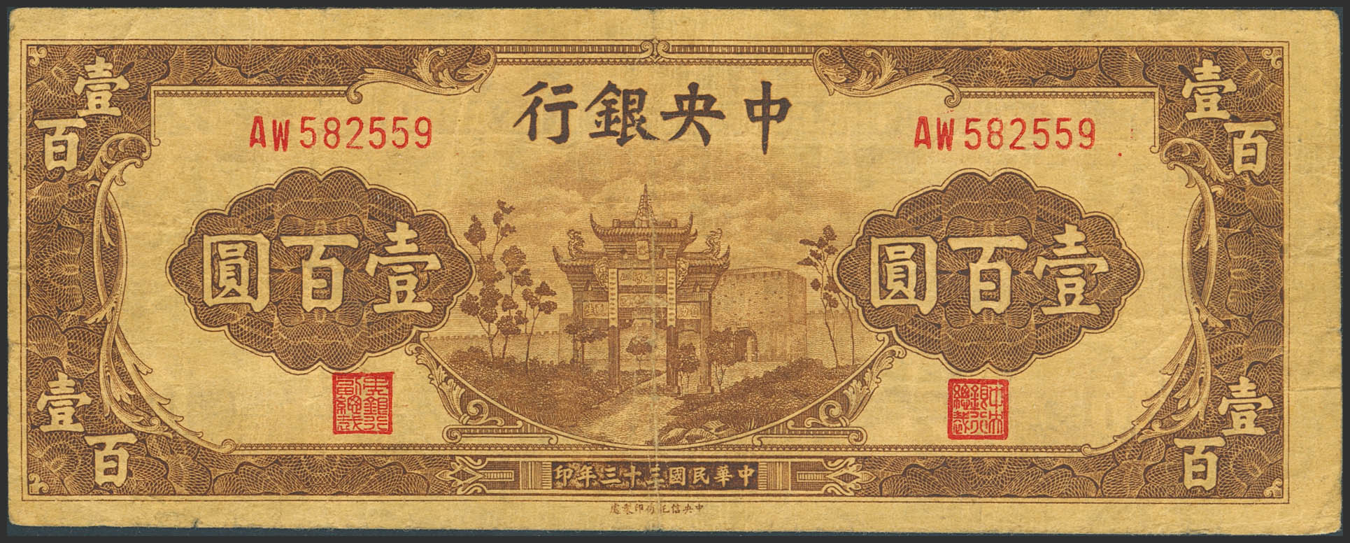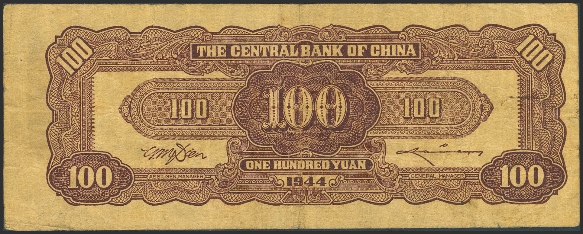 CHINA. 100 Yuan. 1944. Central Bank of China. (Pick: 261). Fine.