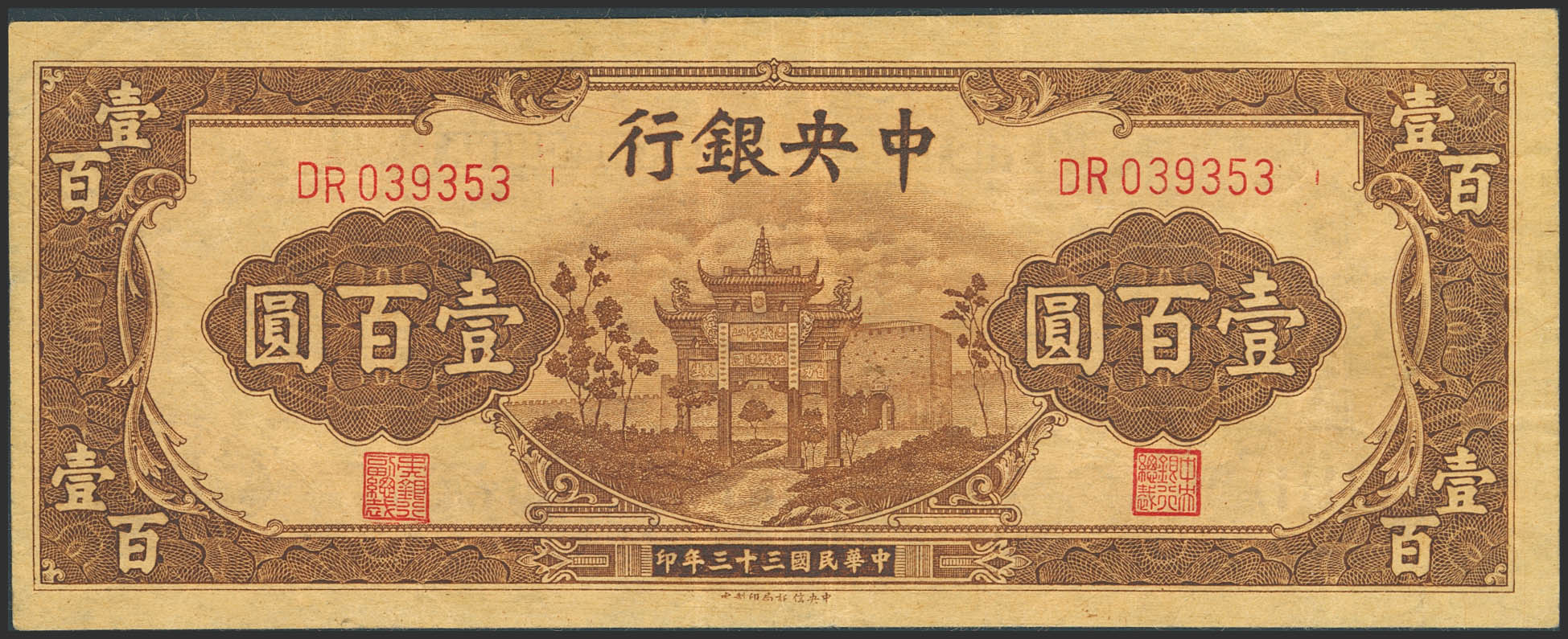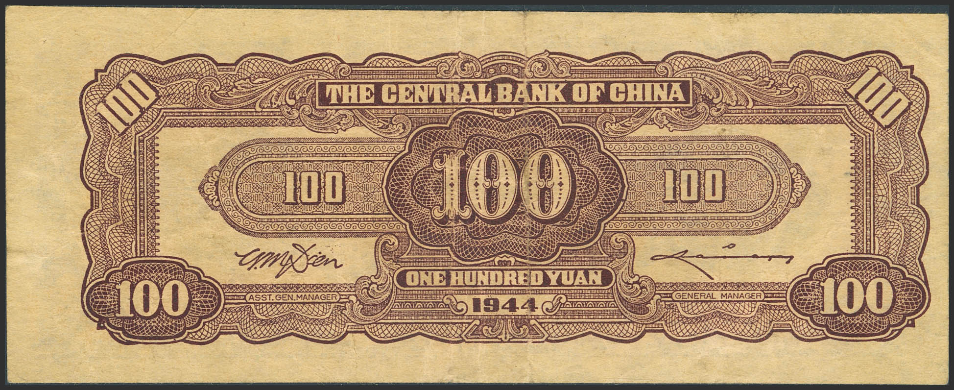 CHINA. 100 Yuan. 1944. Central Bank of China. (Pick: 261). Very Fine.