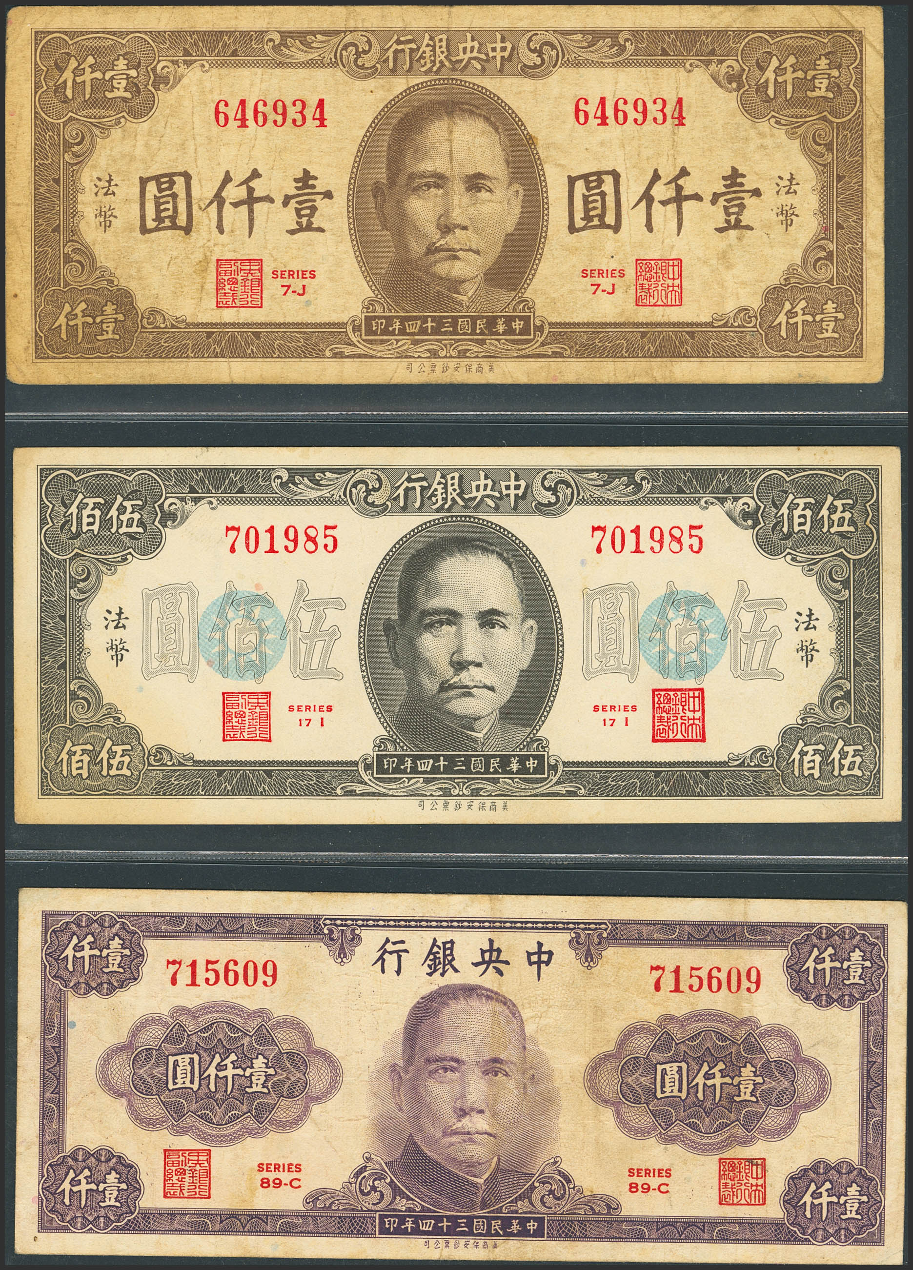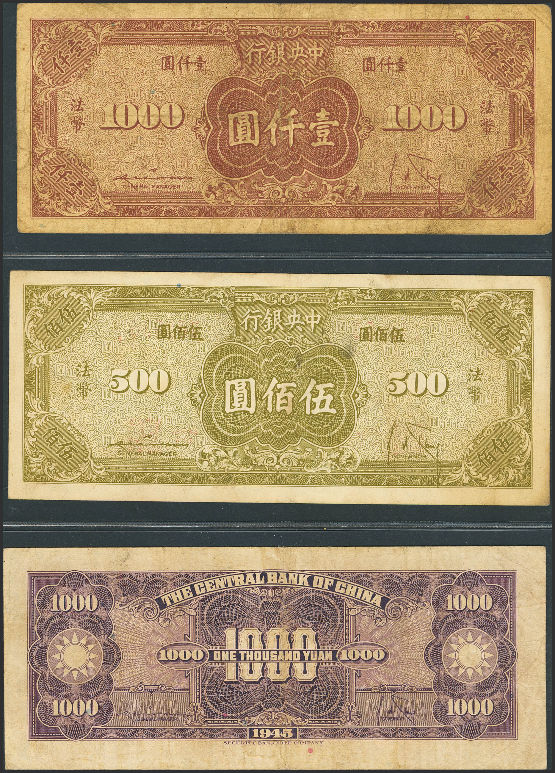 CHINA. Lot of 3 notes of 500 and 1000 Yuan. 1945. Central Bank of China. (Pick: 283a, 289, 290). Fine to Extremely Fine.