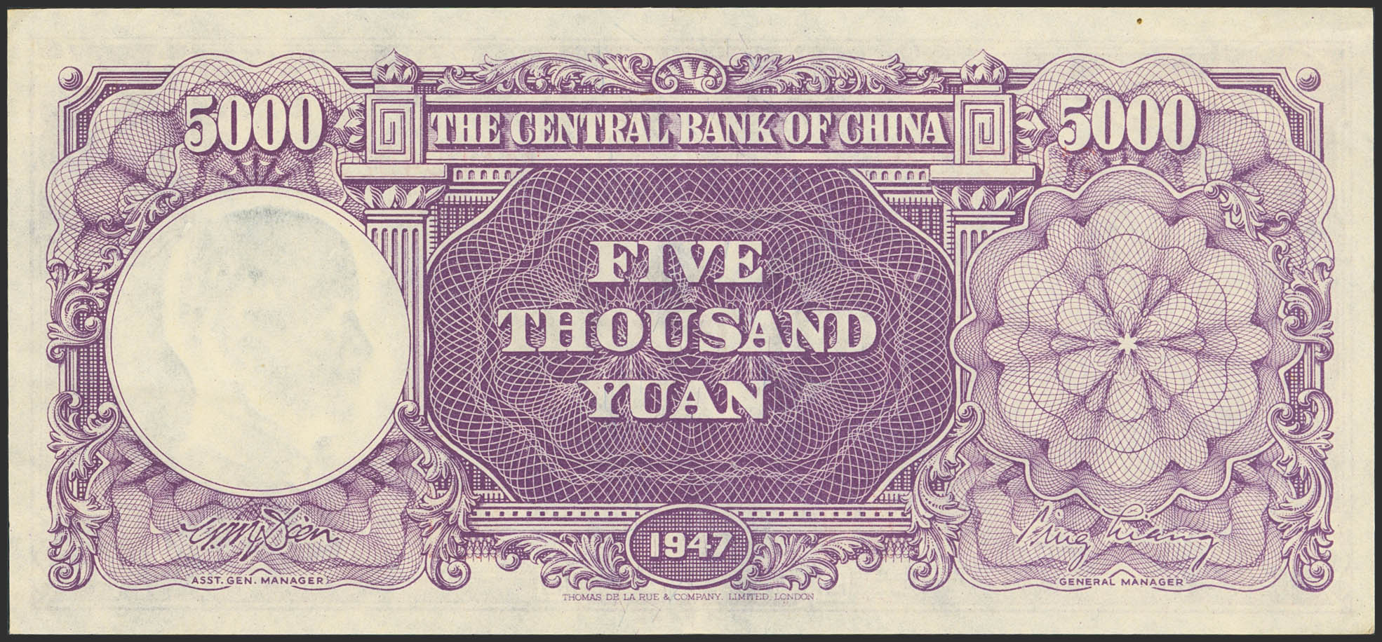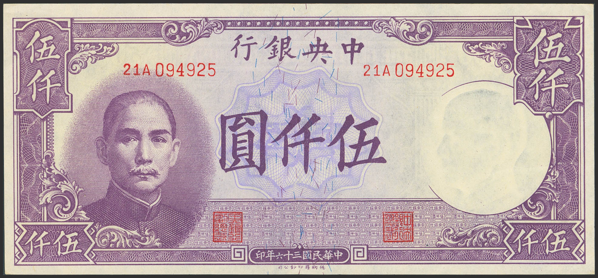 CHINA. 5000 Yuan. 1947. Central Bank of China. (Pick: 310). More than Extremely Fine.