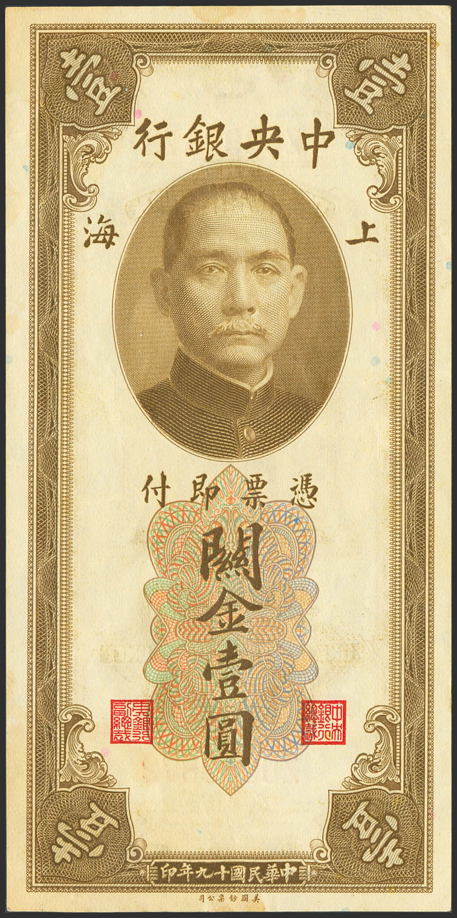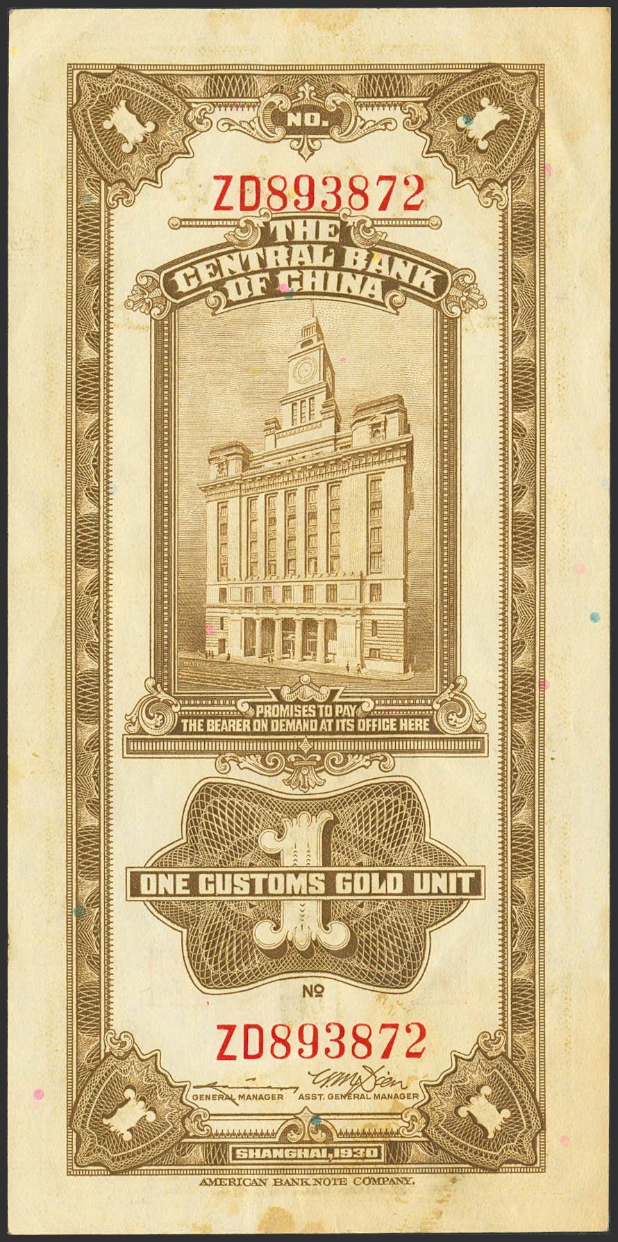 CHINA. 1 Custom gold unit. 1930. Central Bank of China. (Pick: 325d). Extremely Fine.