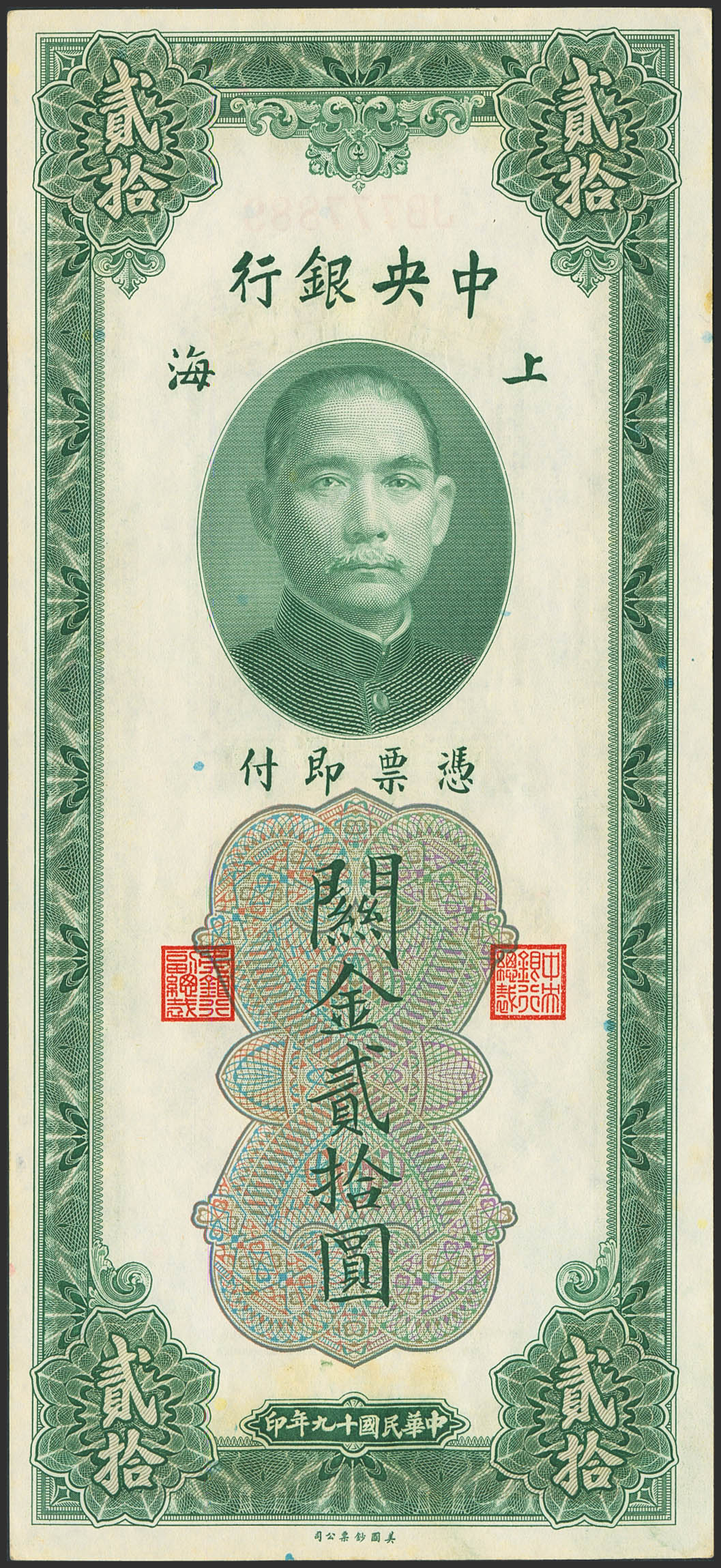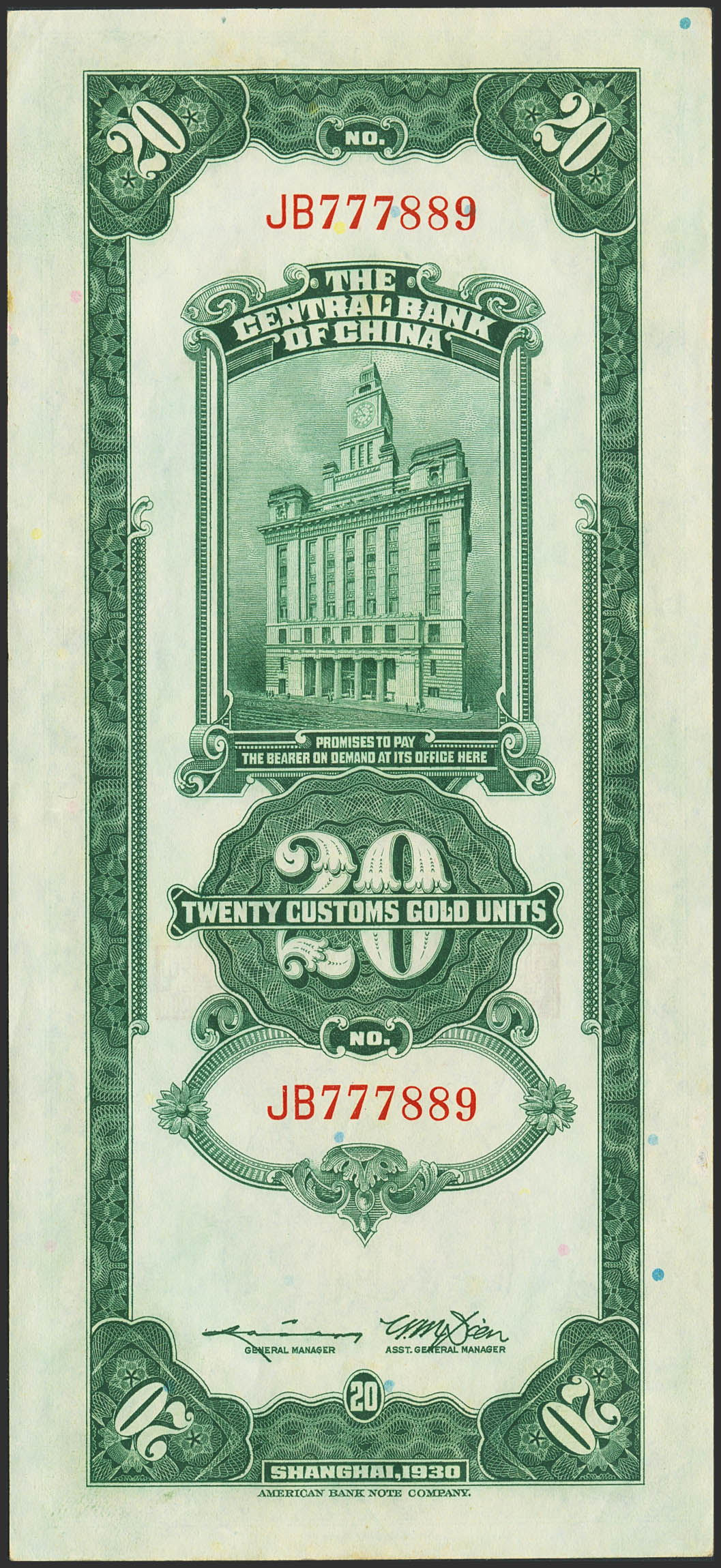 CHINA. 20 Custom gold units. 1930. Central Bank of China. (Pick: 328). Less than Uncirculated.