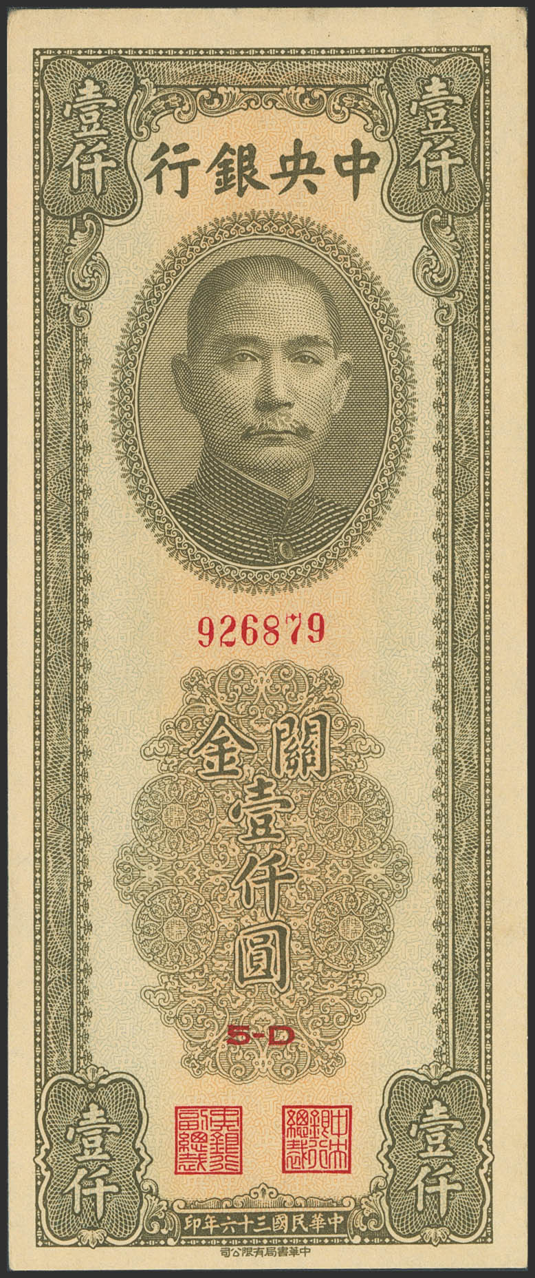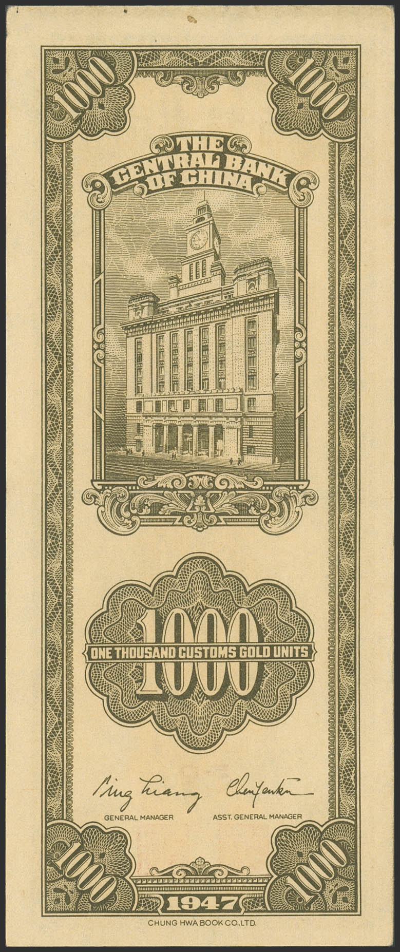 CHINA. 1000 Custom gold units. 1947. Central Bank of China. (Pick: 338). Almost Uncirculated.