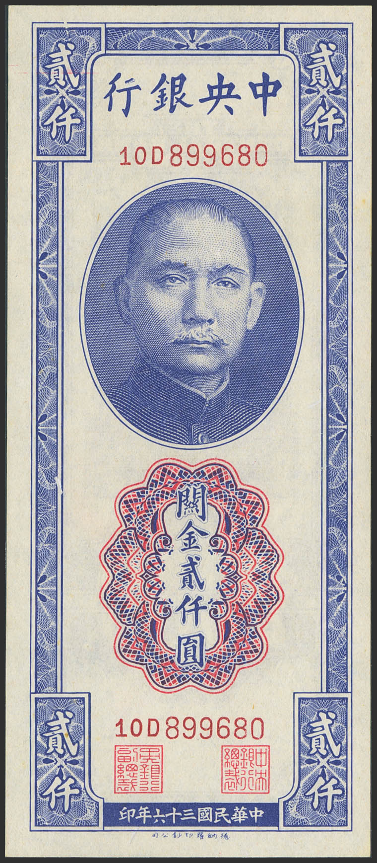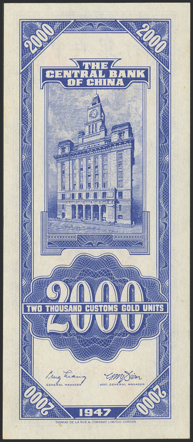 CHINA. 2000 Custom gold units. 1947. Central Bank of China. (Pick: 344). Almost Uncirculated.