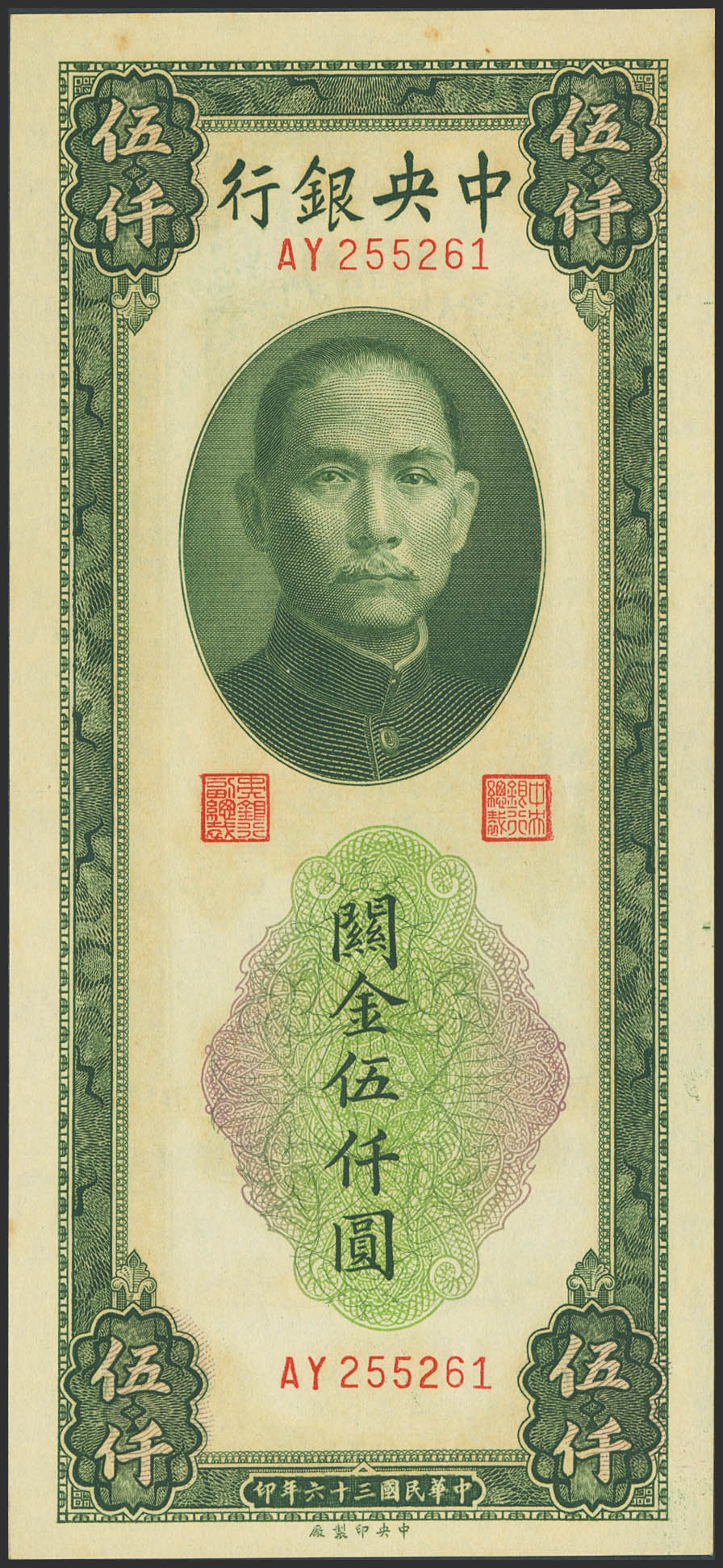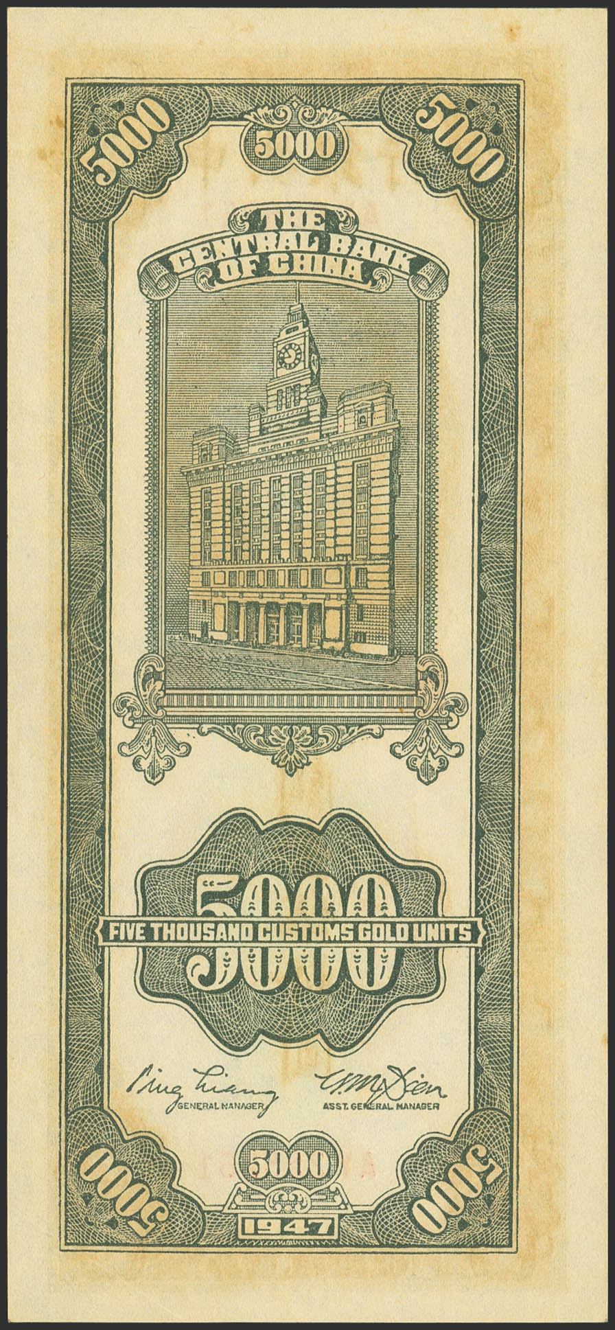 CHINA. 5000 Custom gold units. 1947. Central Bank of China. (Pick: 350). More than Extremely Fine.