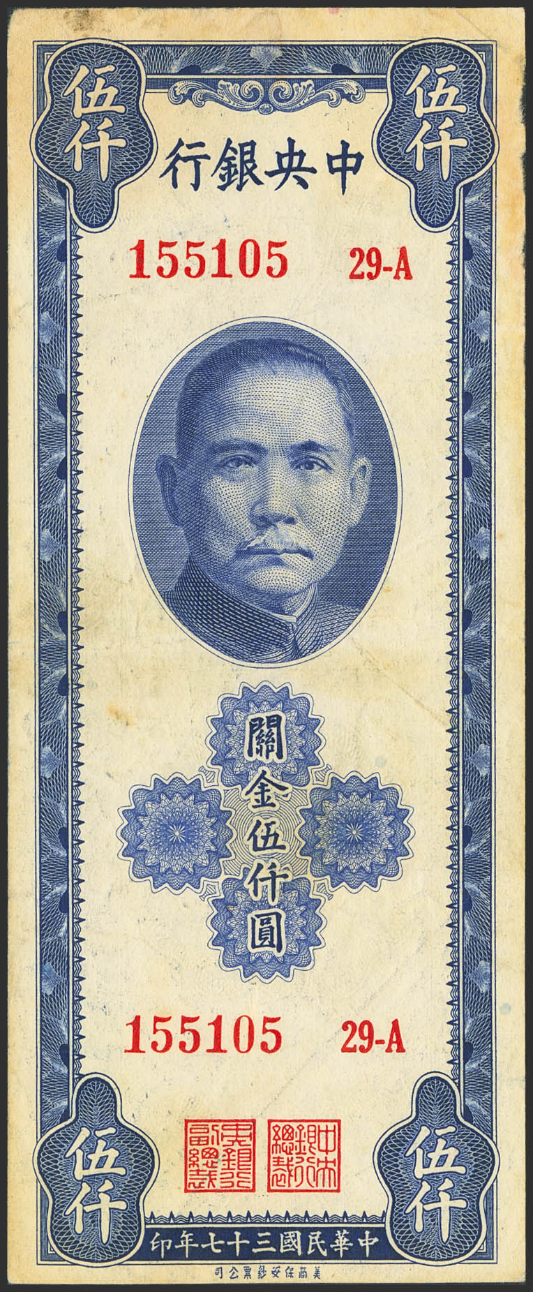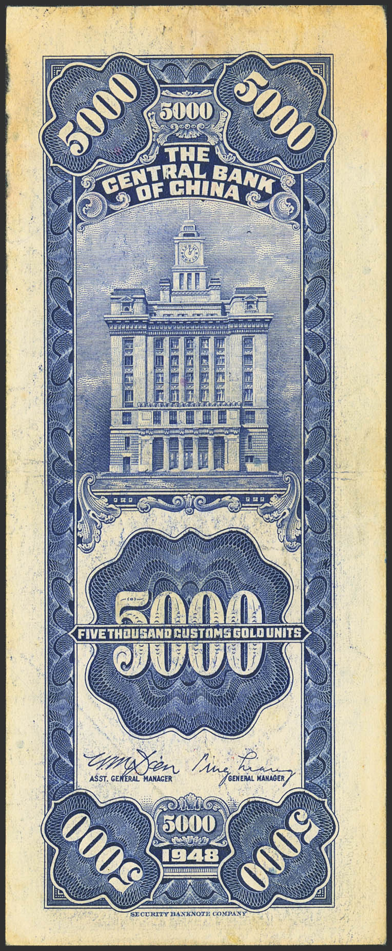 CHINA. 5000 Custom gold units. 1948. Central Bank of China. (Pick: 360). Very Fine.